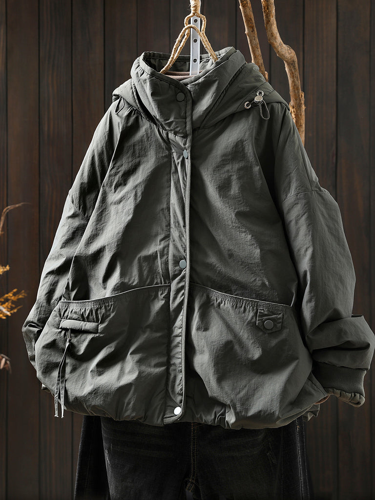 Women Autumn Casual Pure Color Padded Hooded Jacket