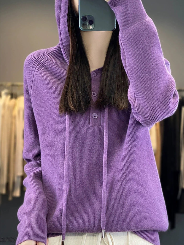 Women Autumn Casual Pure Color Knitted Hooded Sweater