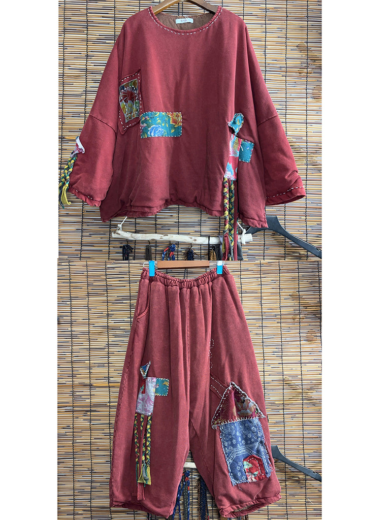 Women Winter Retro Patchwork O-Neck Tassel Suits
