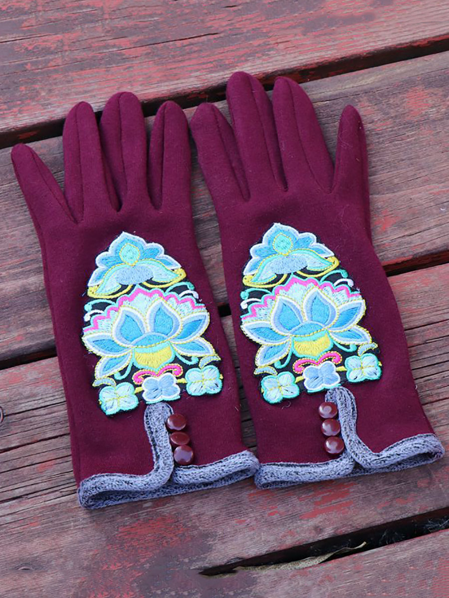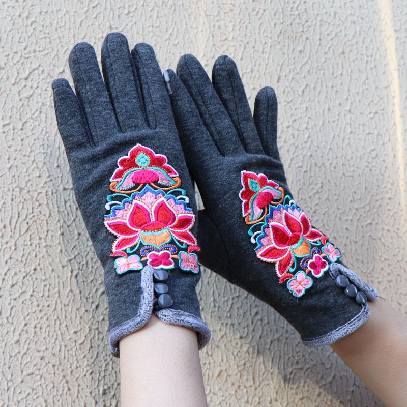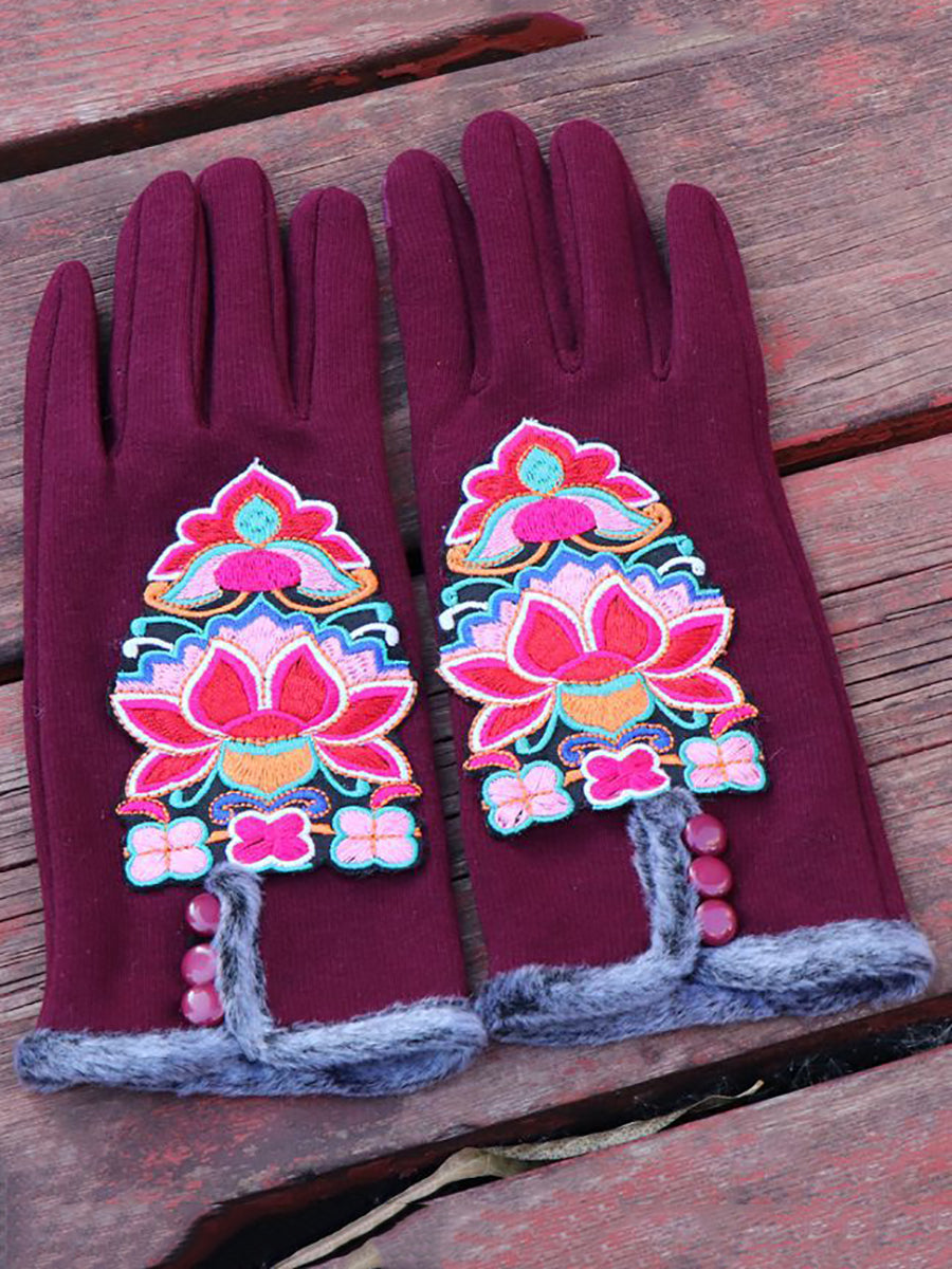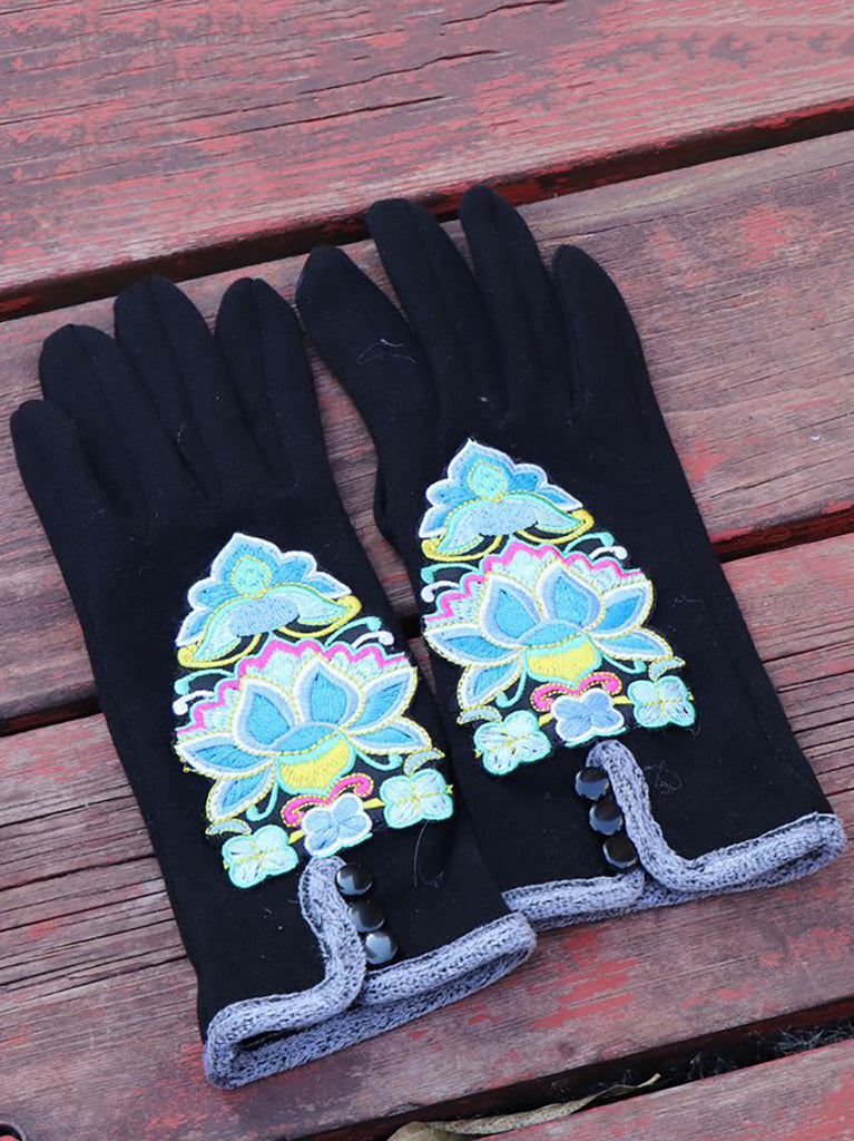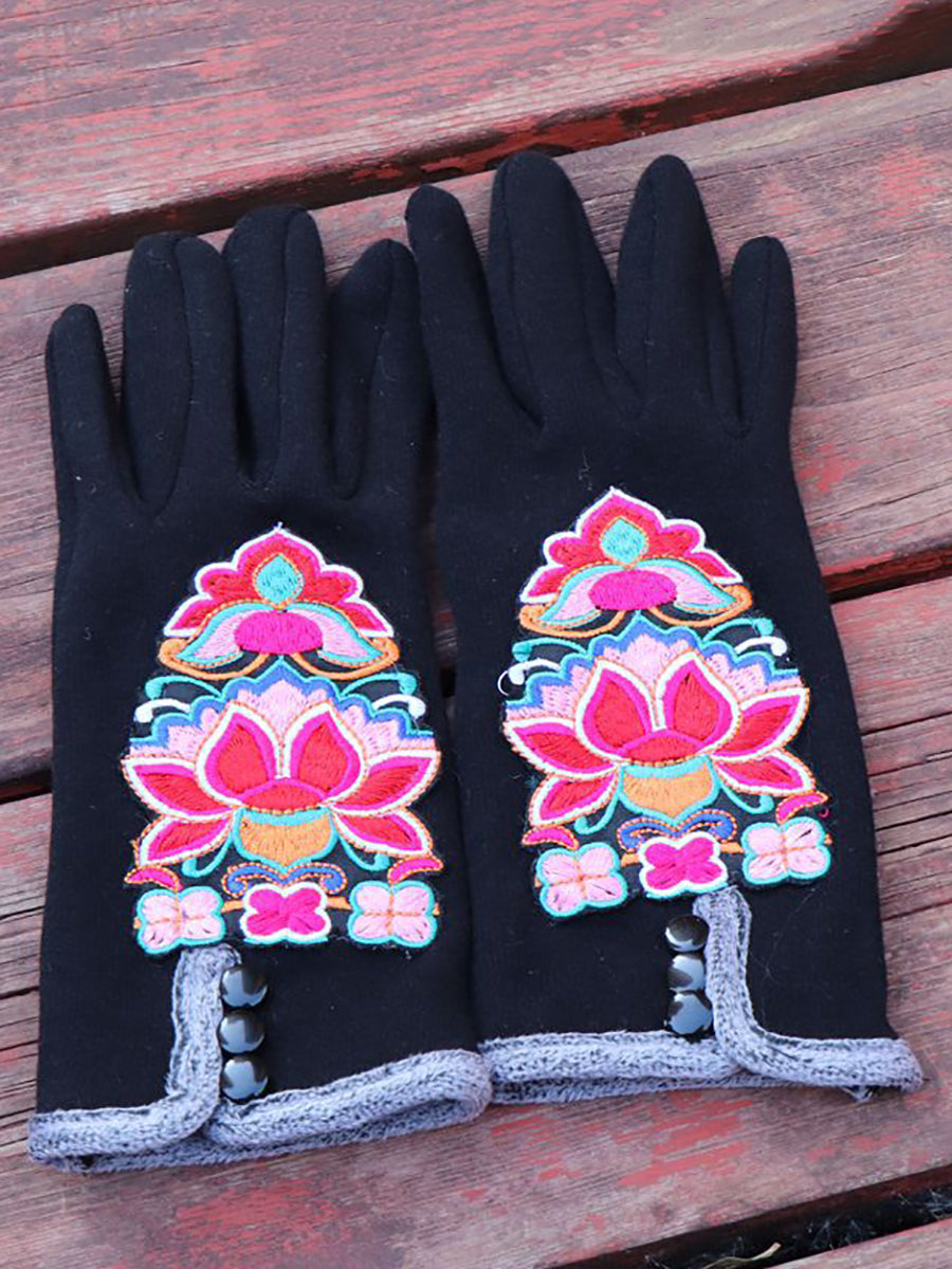 Women Ethnic Winter Embroidery Fleece-lined Gloves