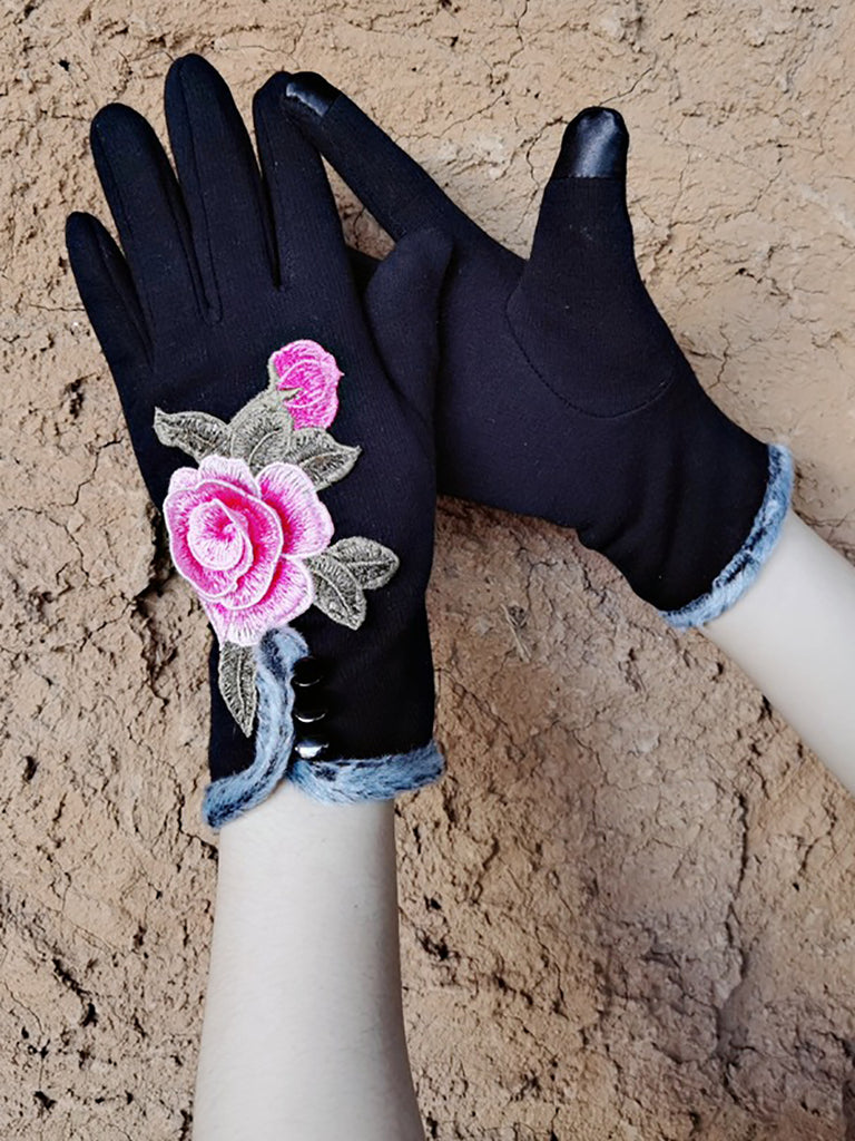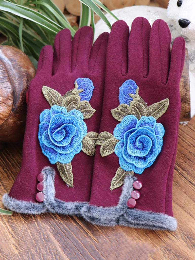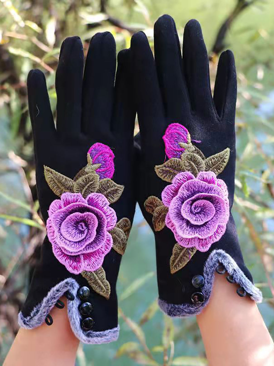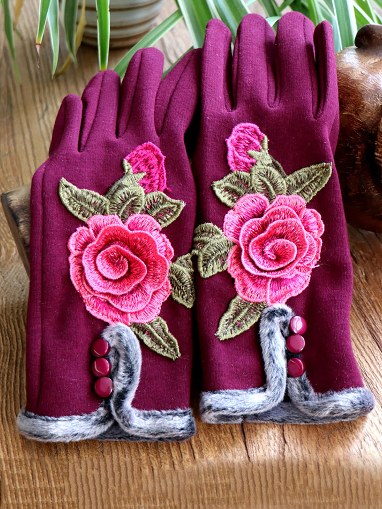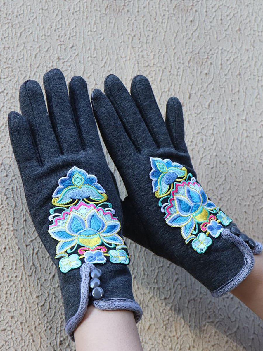 Women Ethnic Winter Embroidery Fleece-lined Gloves