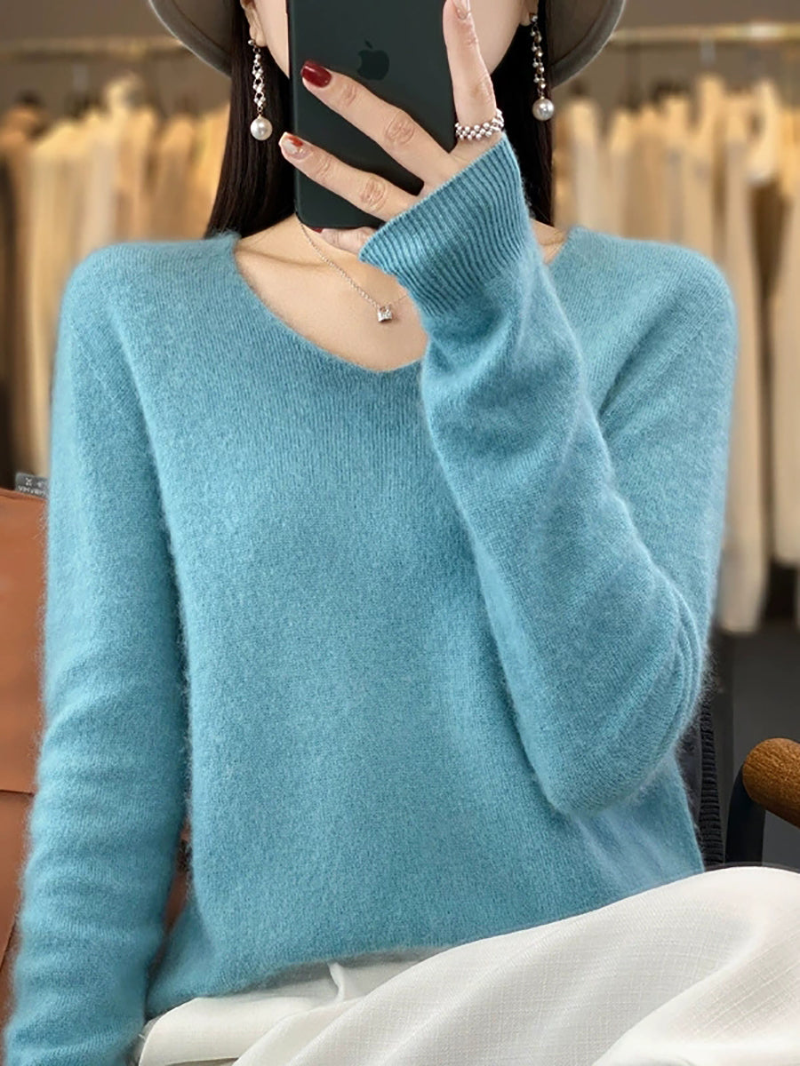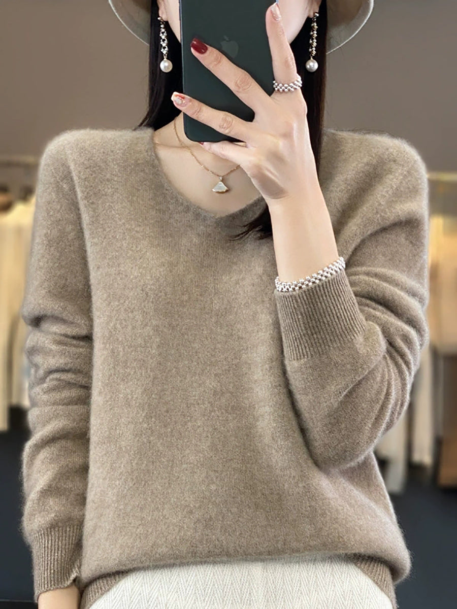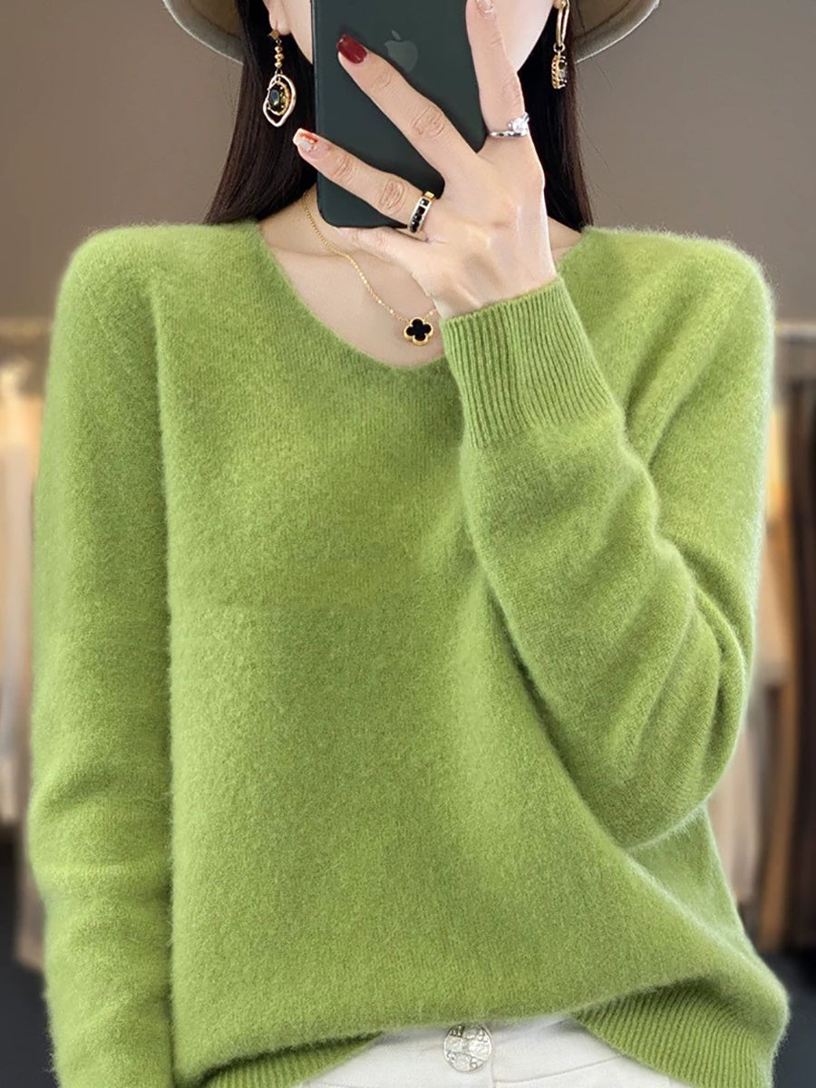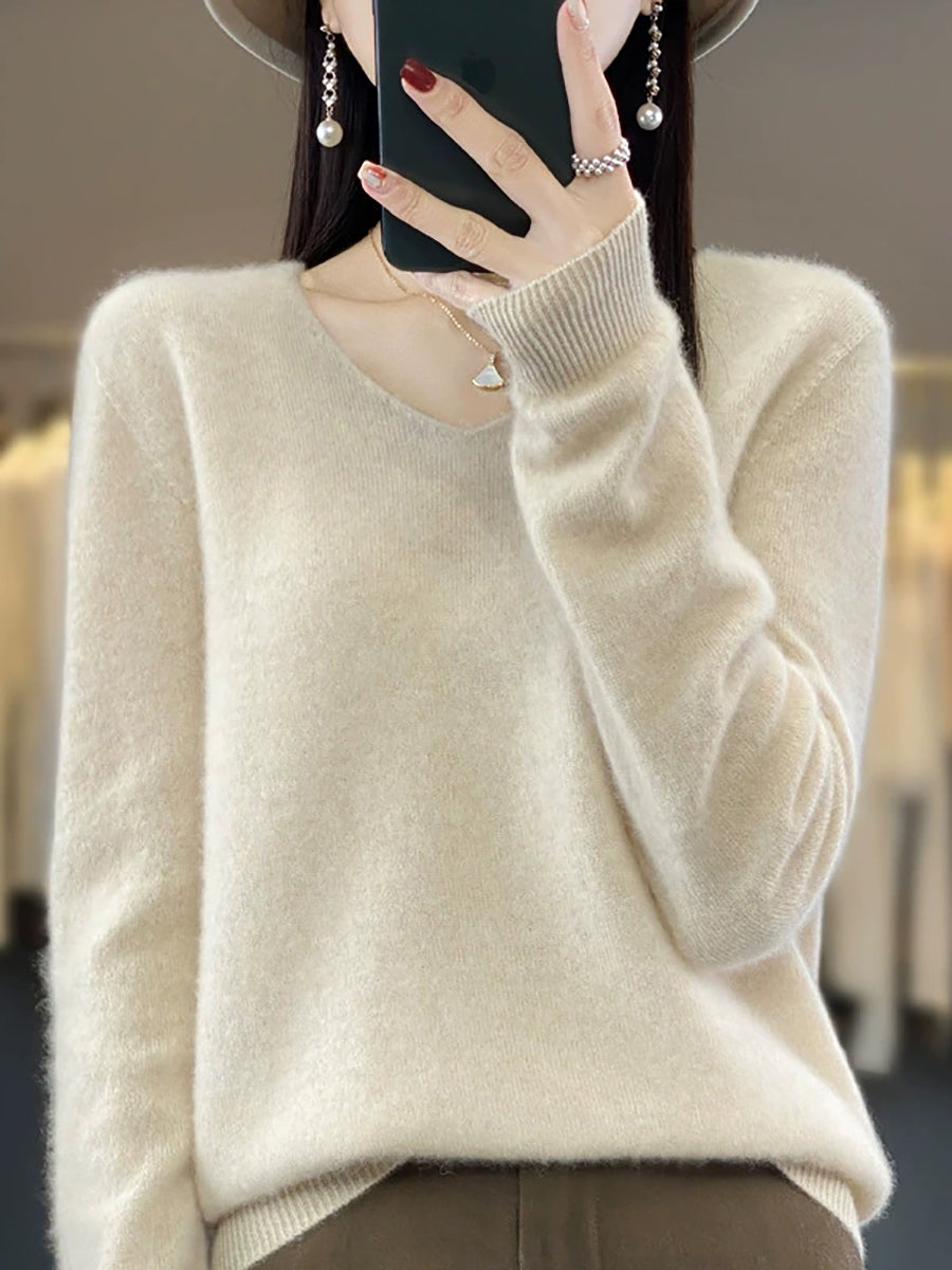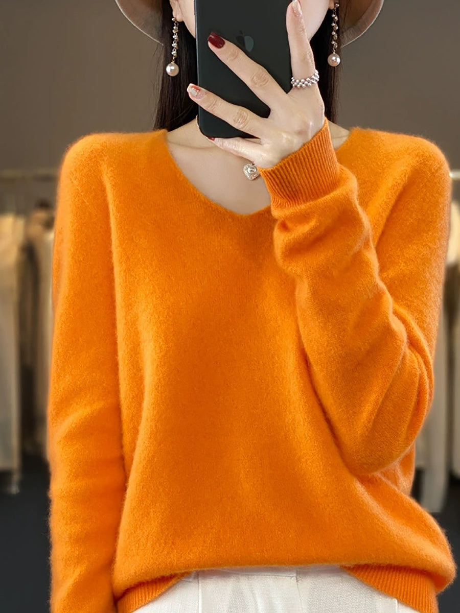 Women Casual Spring Pure Color V-Neck Sweater