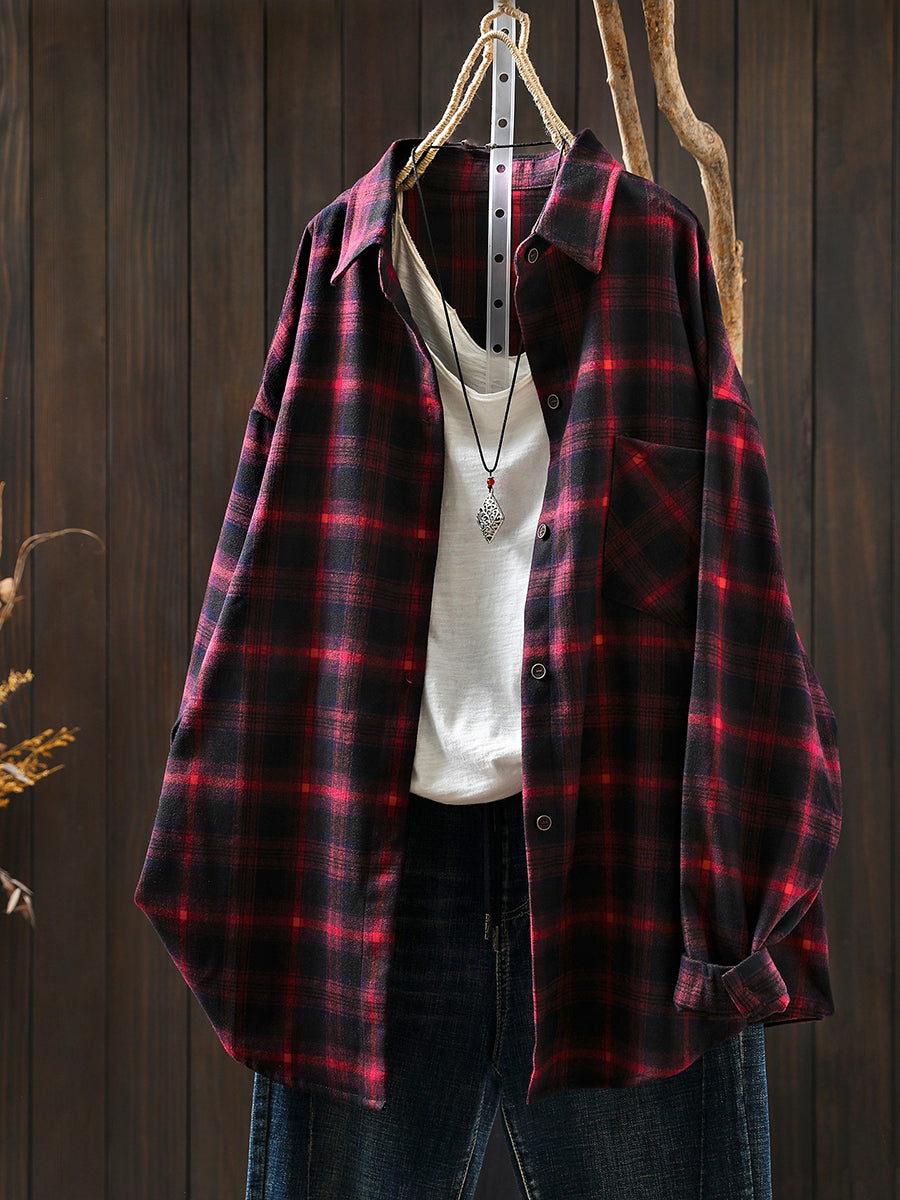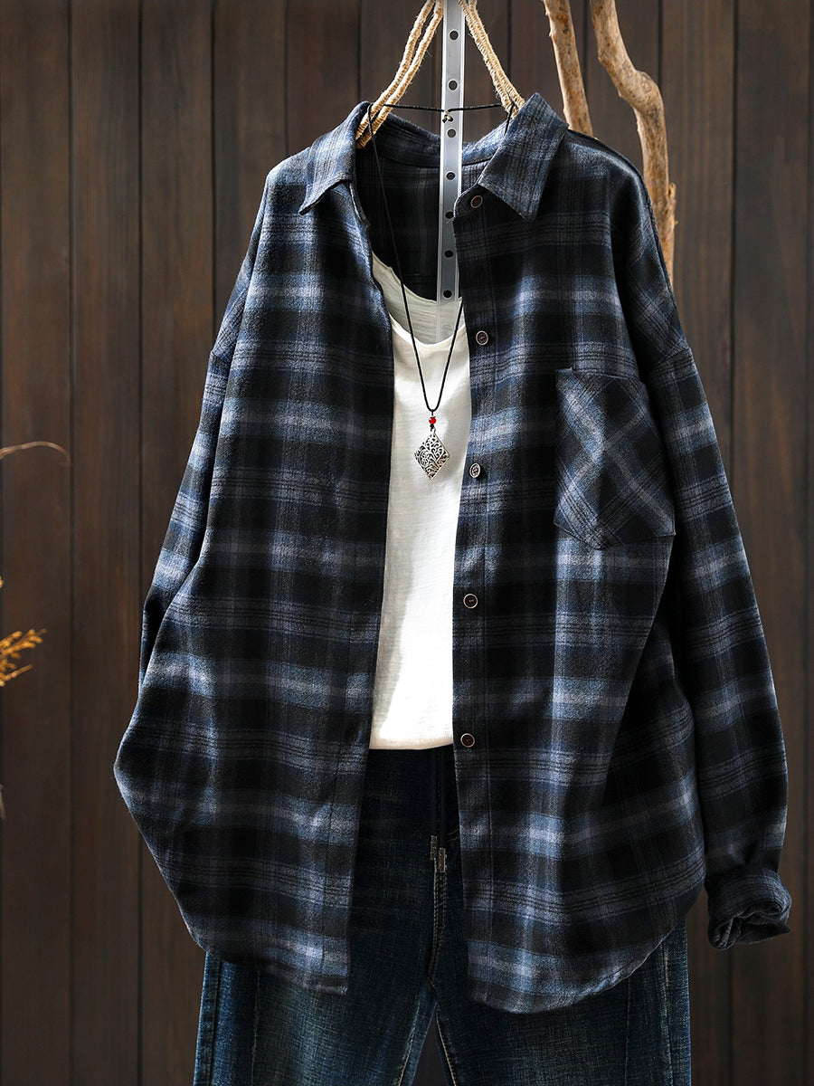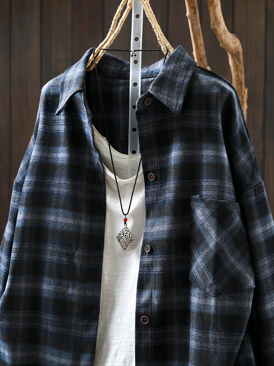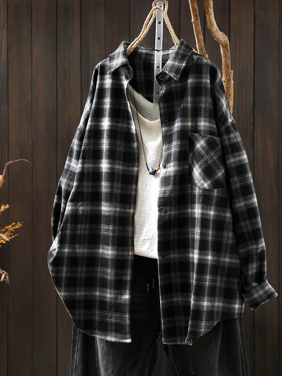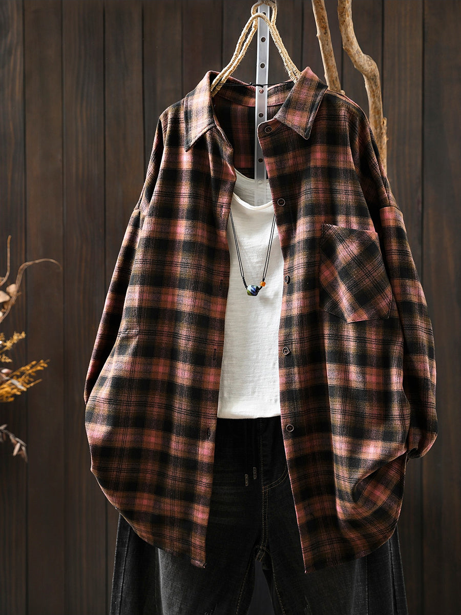 Women Retro Spring Plaid Turn-down Collar Cotton Shirt