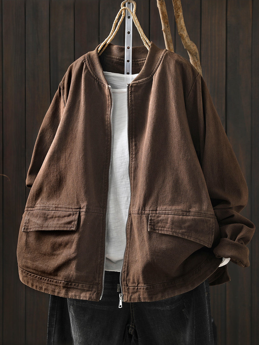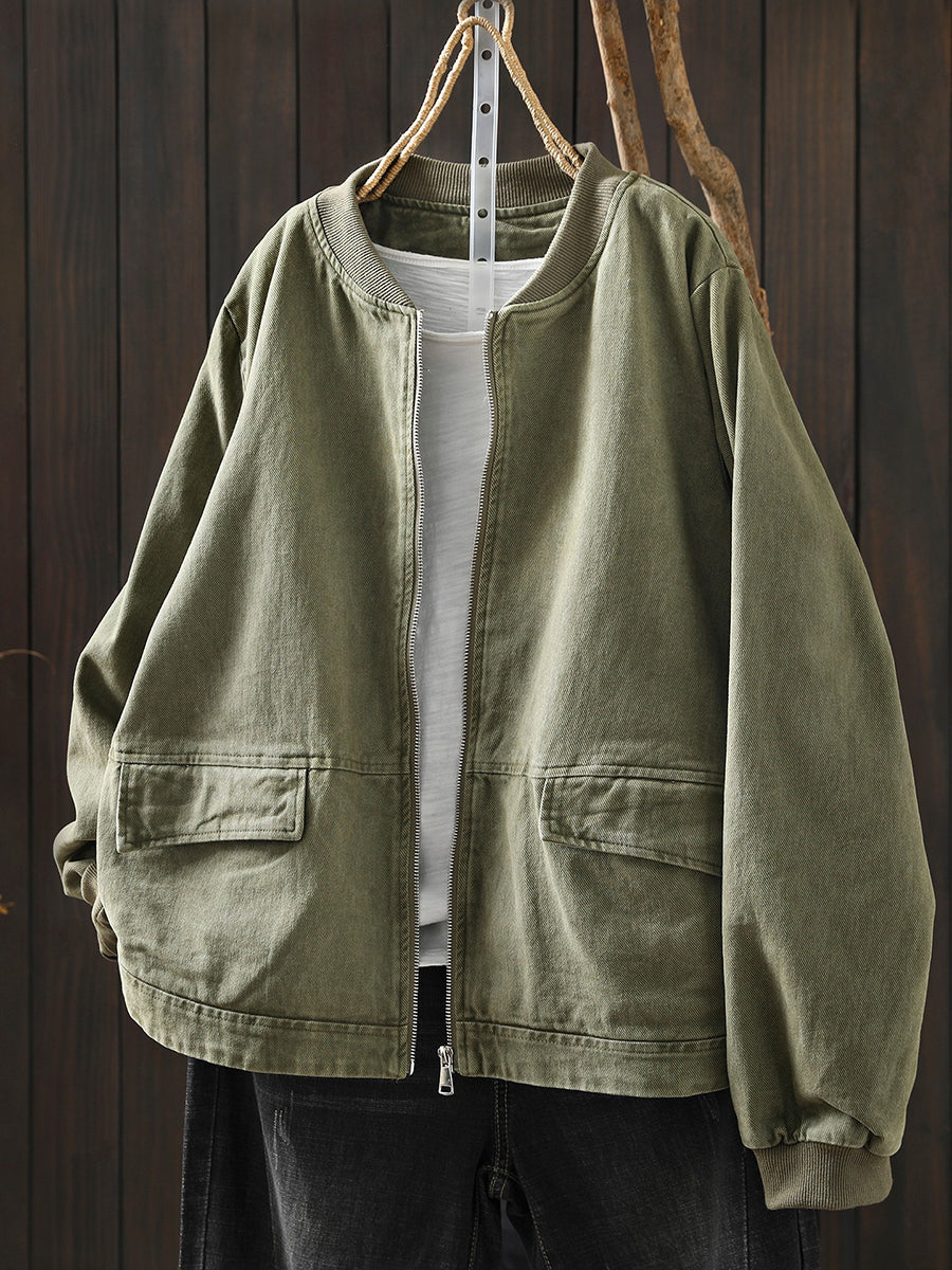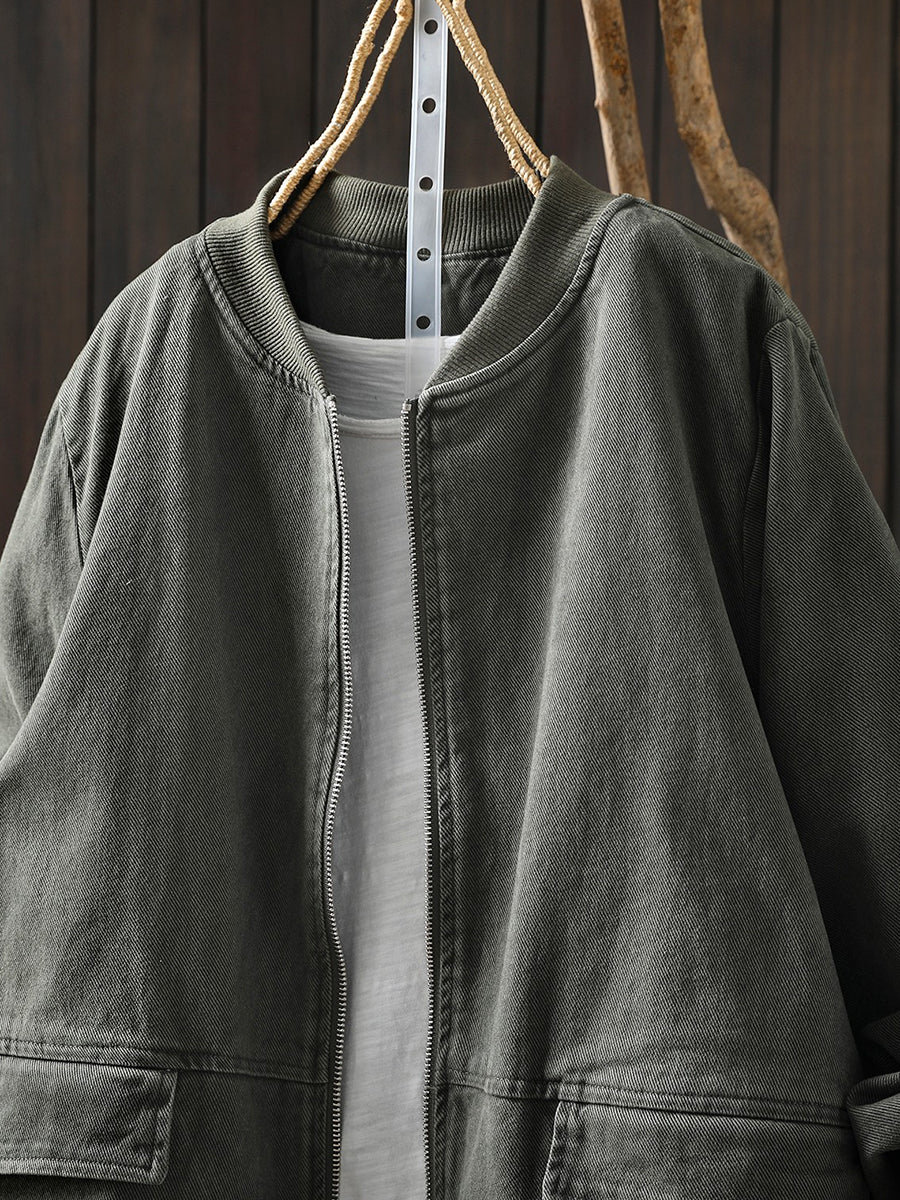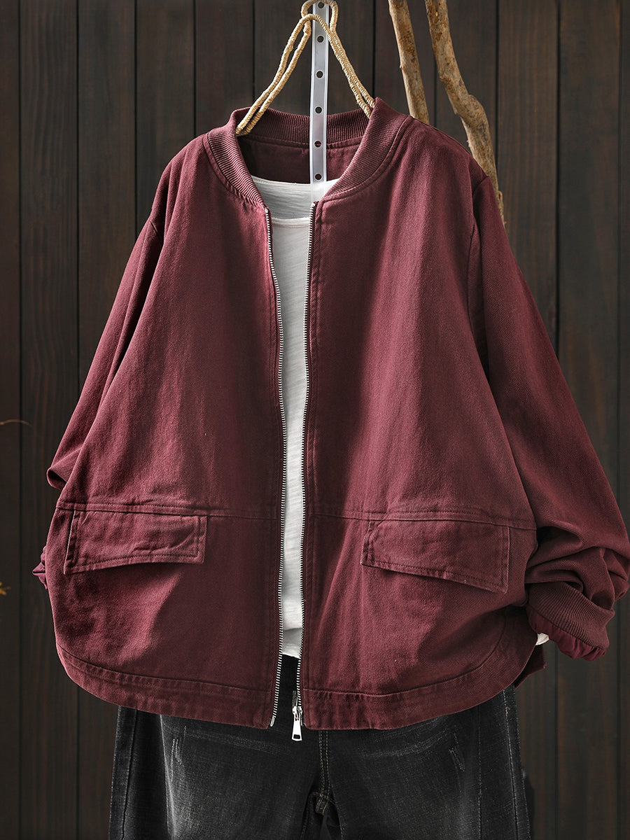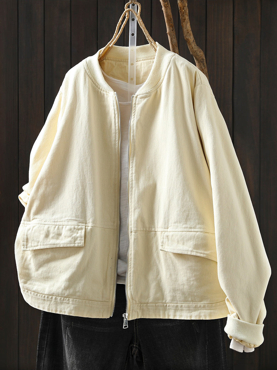 Women Spring Casual Pure Color Cotton Zipper Jacket