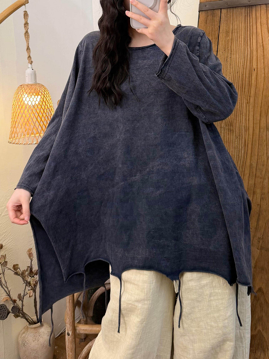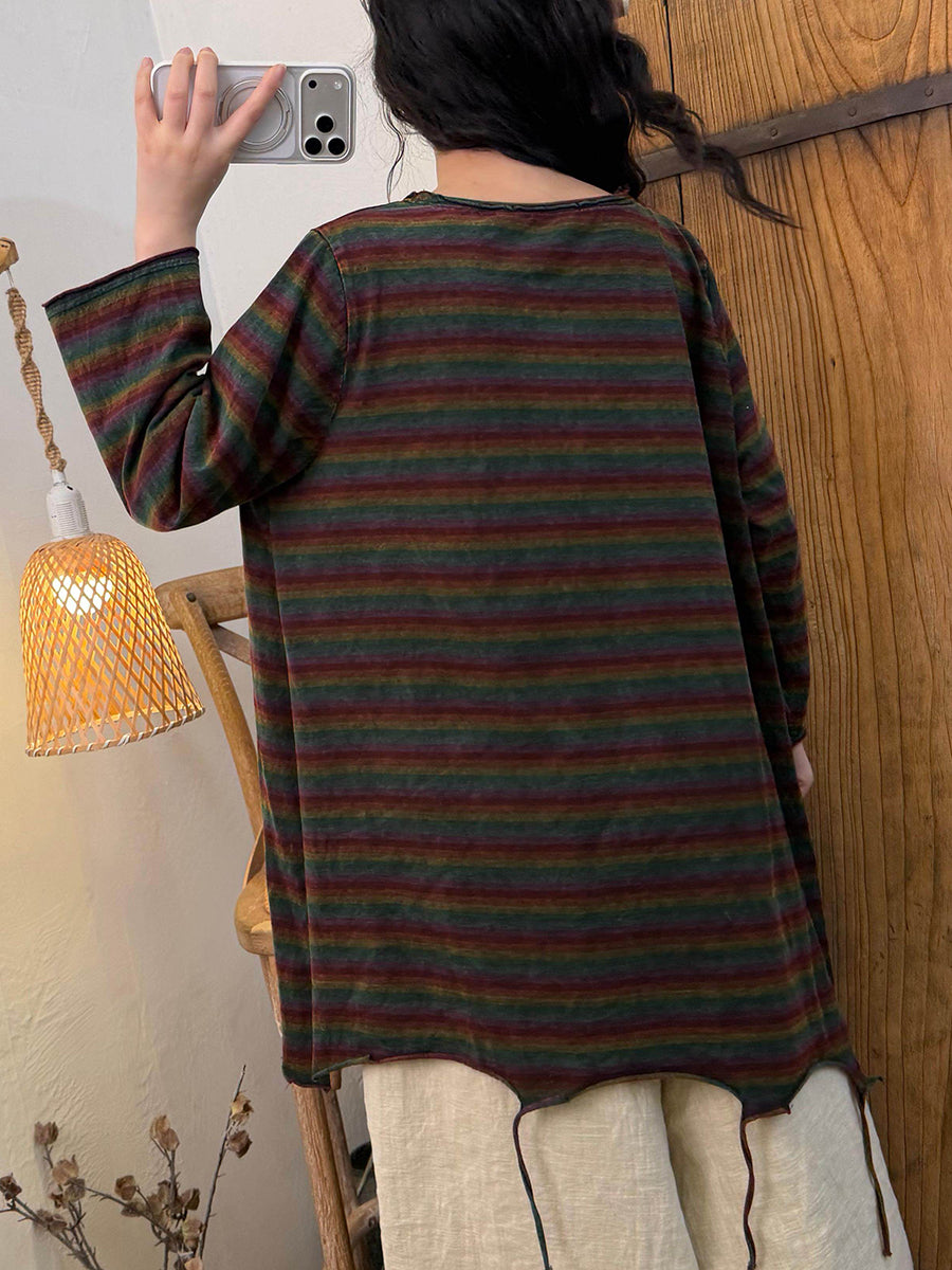 Women Spring Retro Stripe Cotton Tassel Hem O-Neck Blouse
