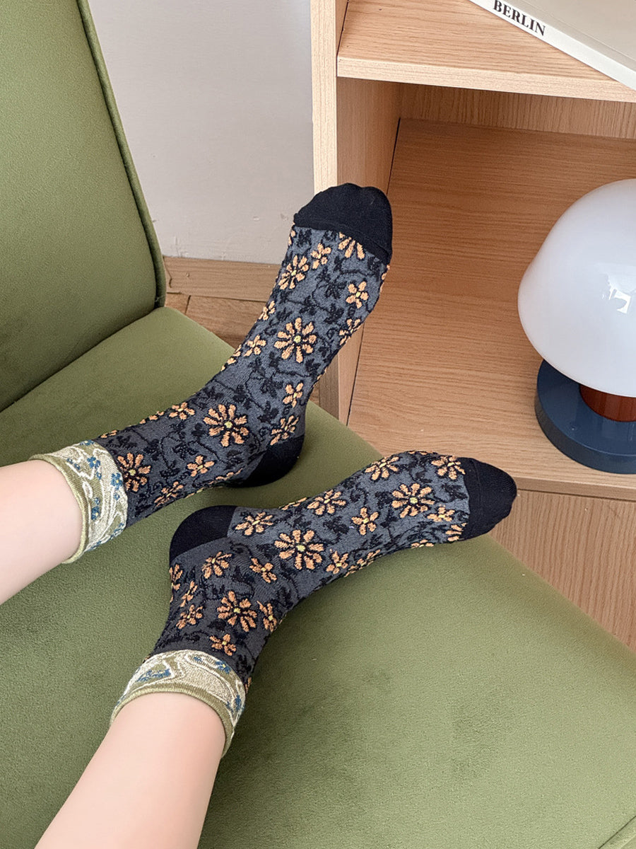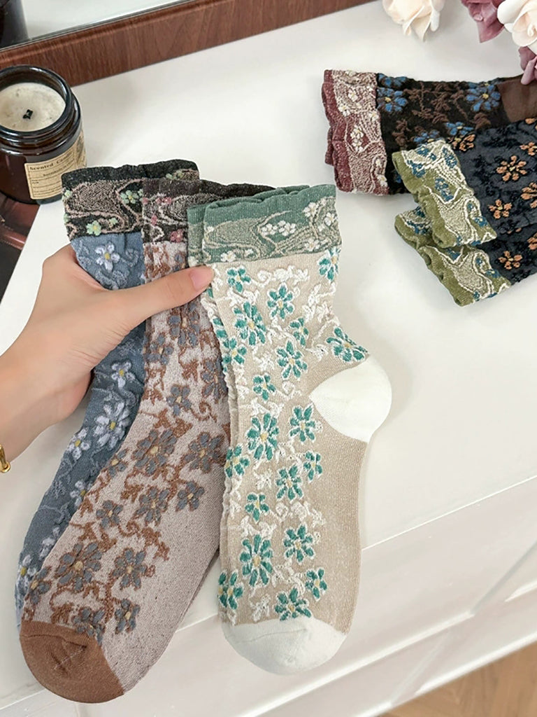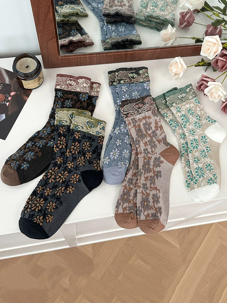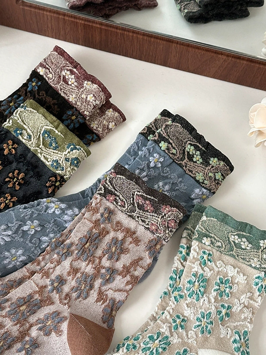 5 Pairs Women Vintage Flower Jacquard Cotton Socks