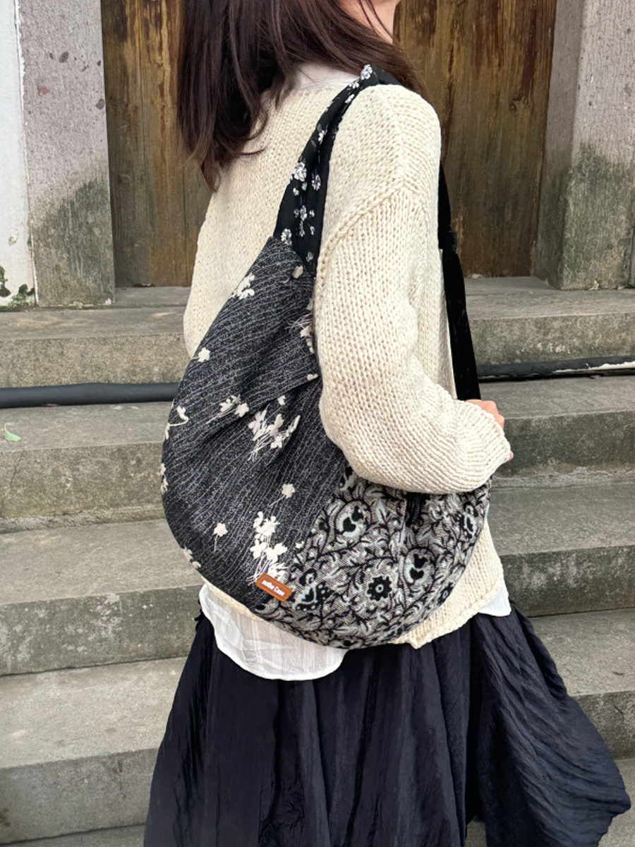Retro Floral Jacquard Spliced Croissant Shoulder Bag