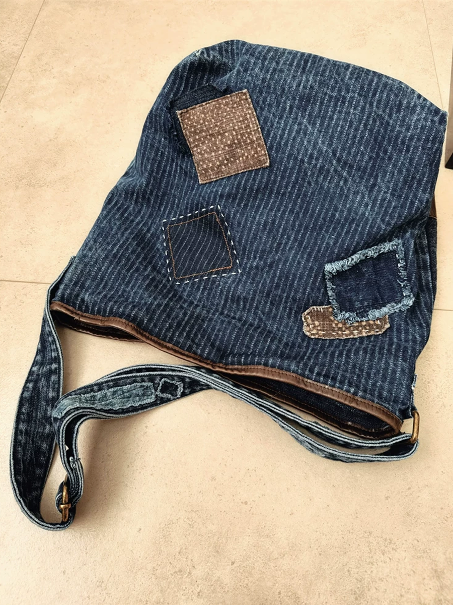 Vintage Denim Floral Patchwork Spliced Leather Bag