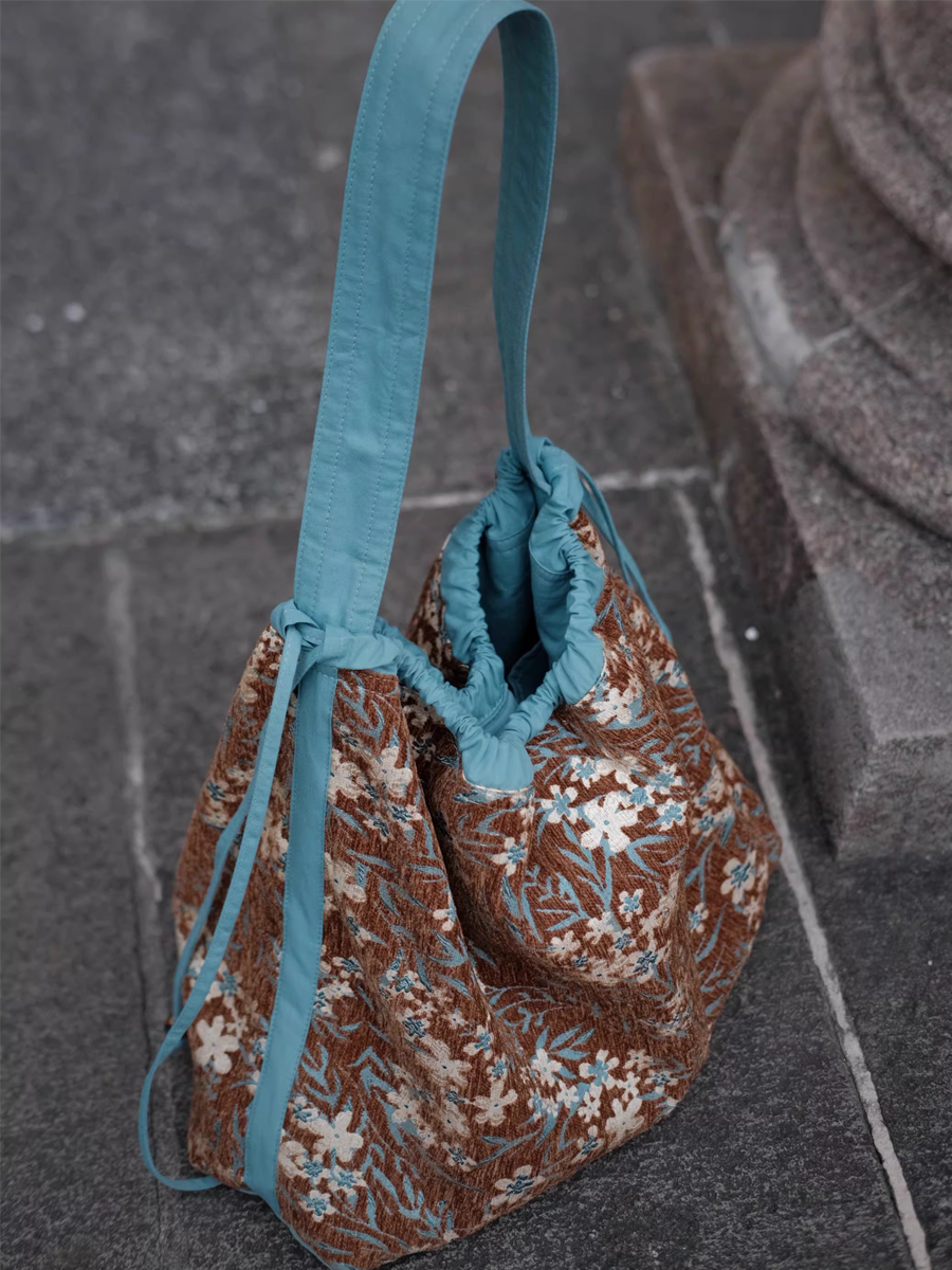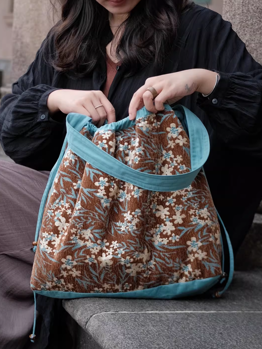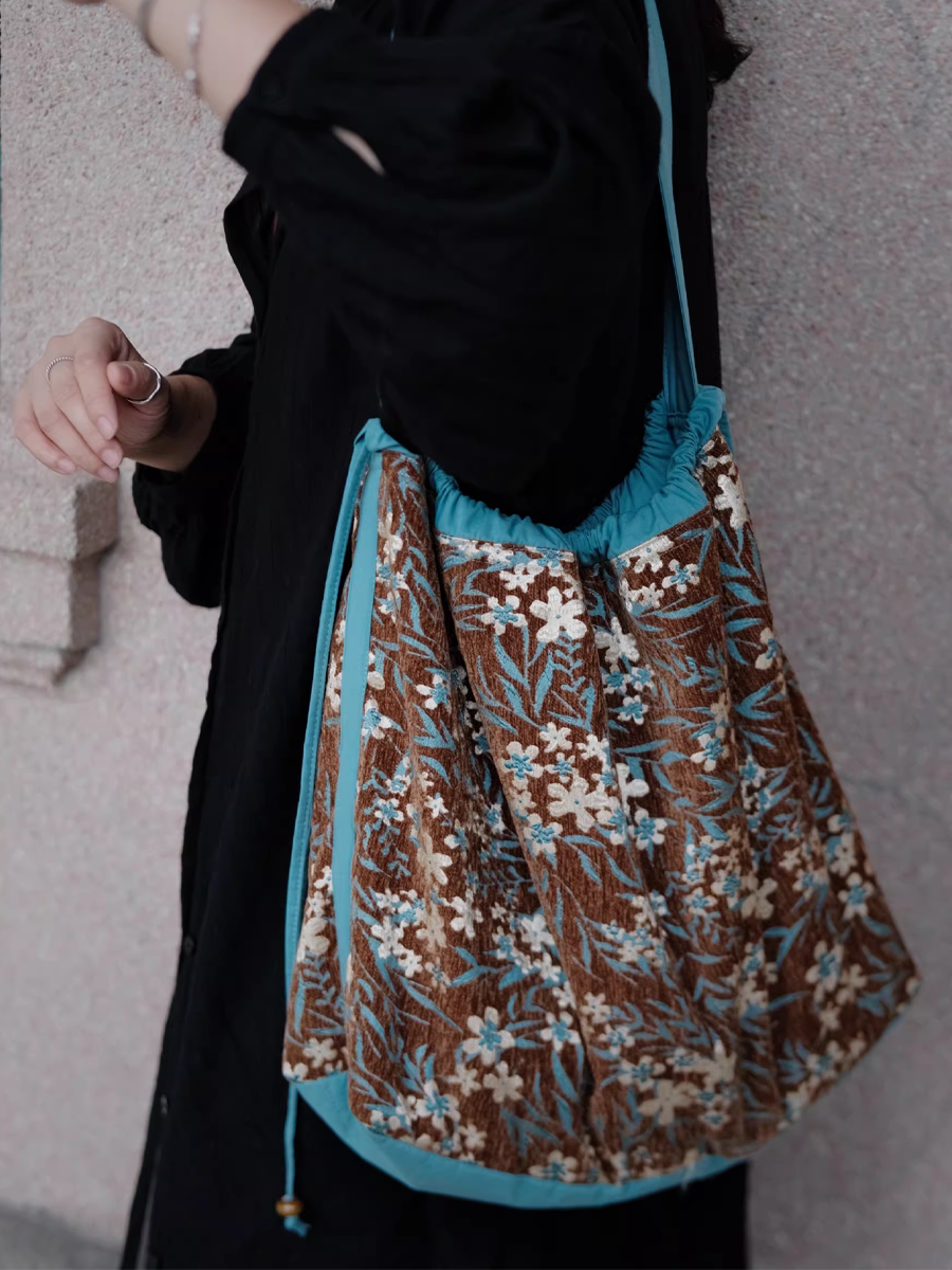 Vintage Floral Jacquard Chenille Drawstring Shoulder Bag