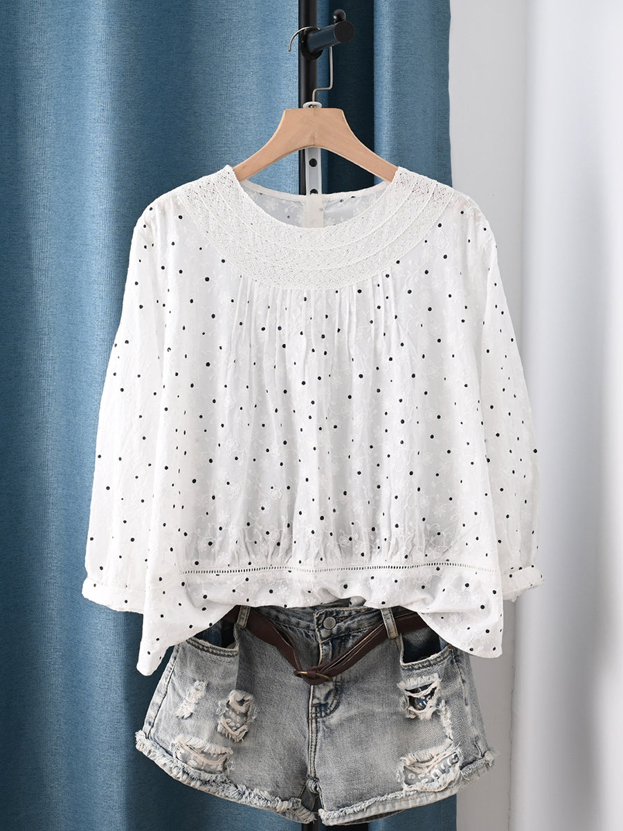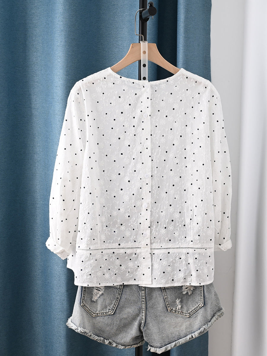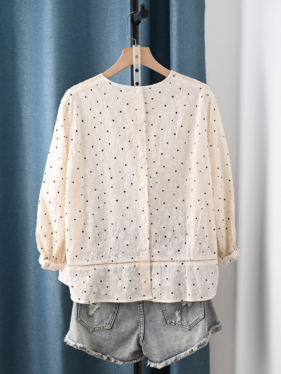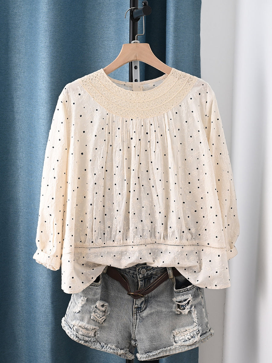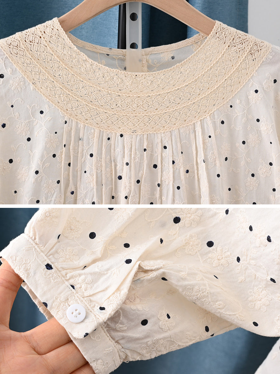 Women Artsy Spring Dot Embroidery Lace 100%Cotton Blouse