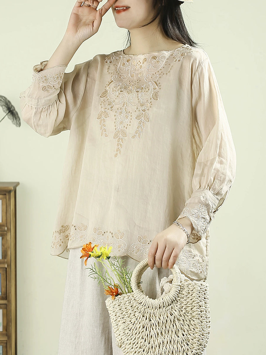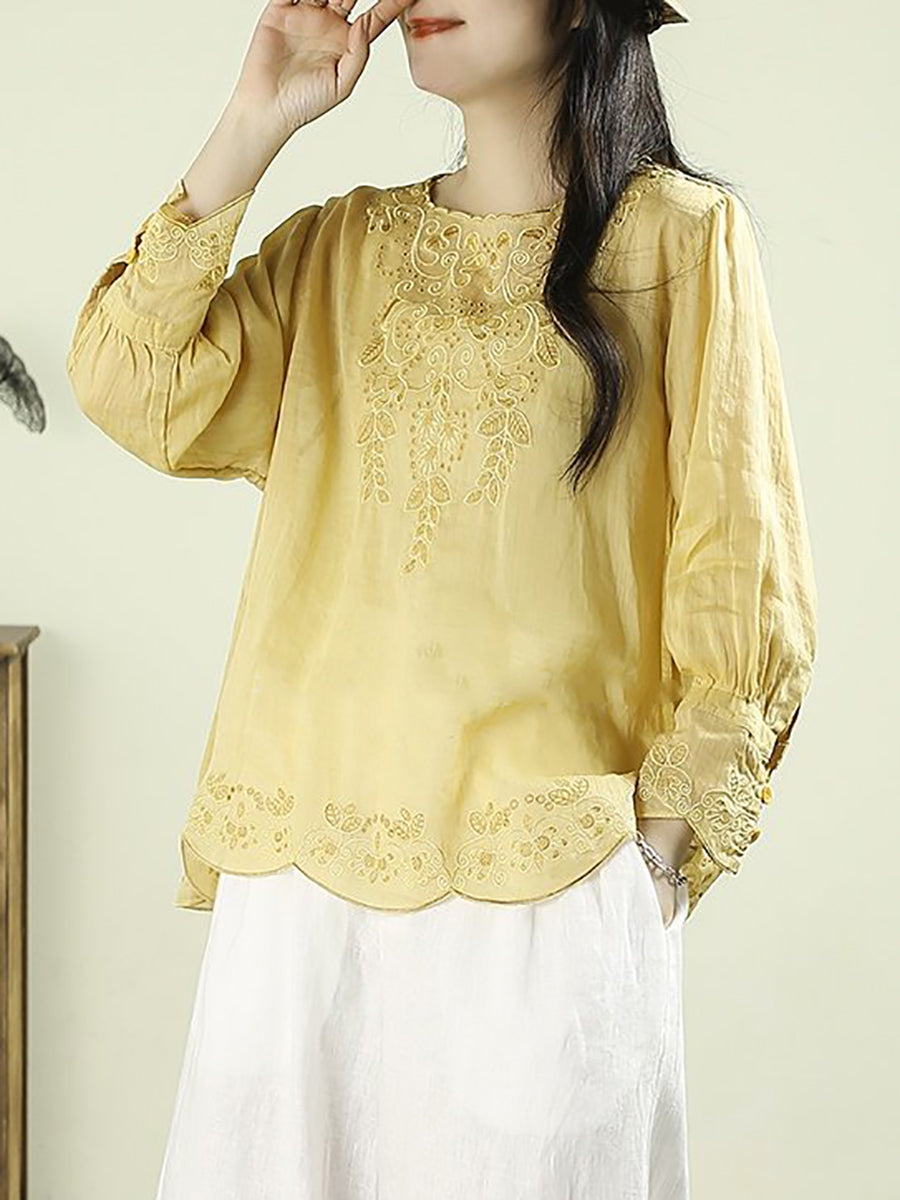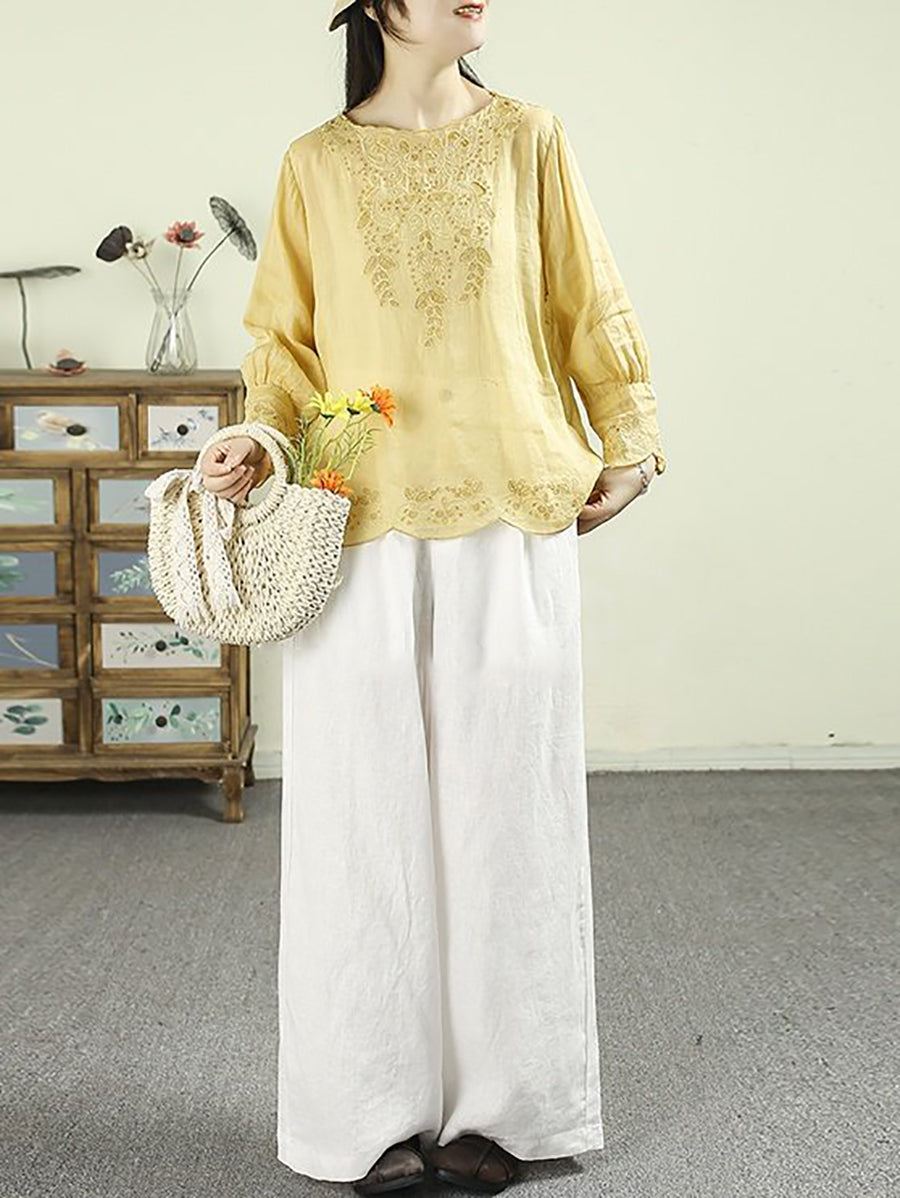 Women Artsy Spring Embroidery O-Neck 100%Ramie Blouse