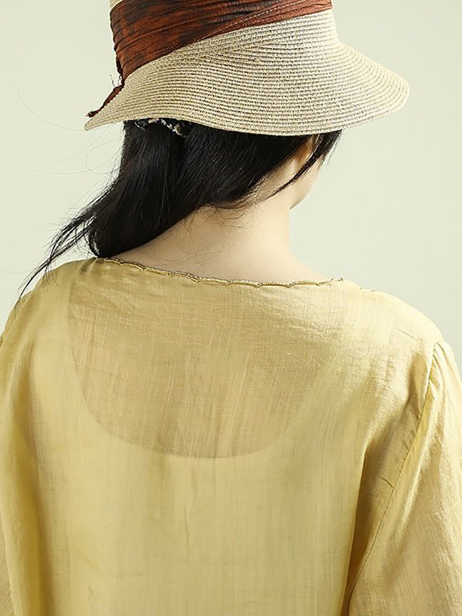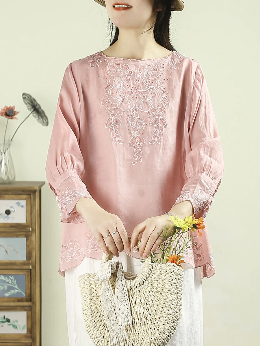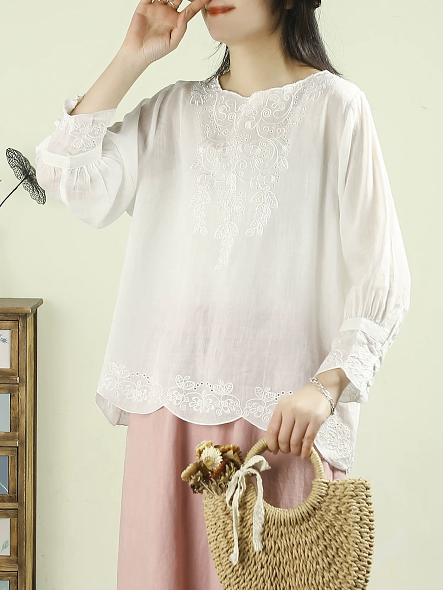 Women Artsy Spring Embroidery O-Neck 100%Ramie Blouse