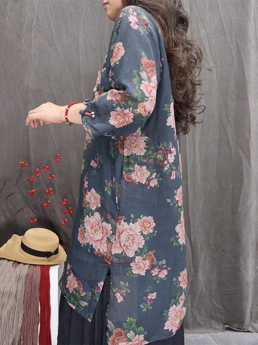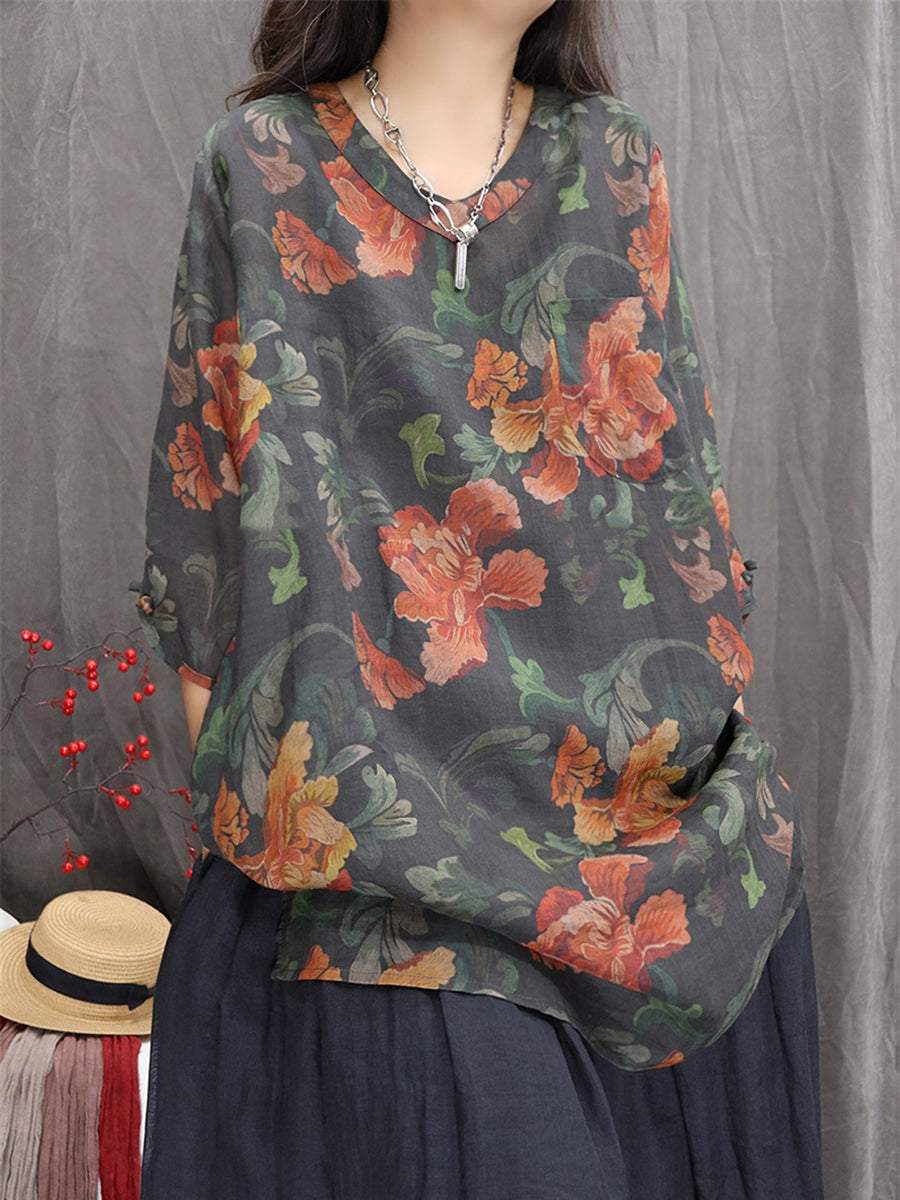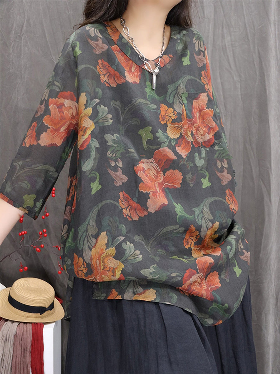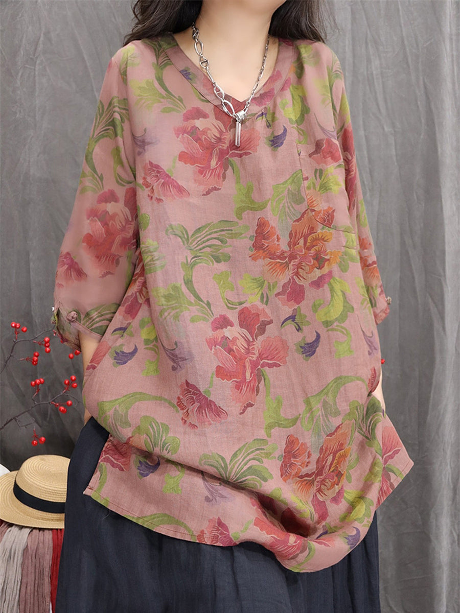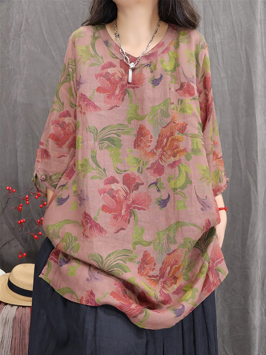 Women Artsy Summer Flower V-Neck 100%Ramie Blouse
