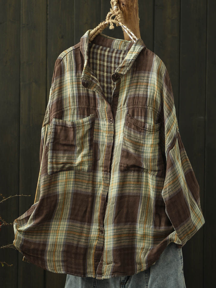 Women Artsy Spring Plaid Cotton Turn-down Collar Shirt