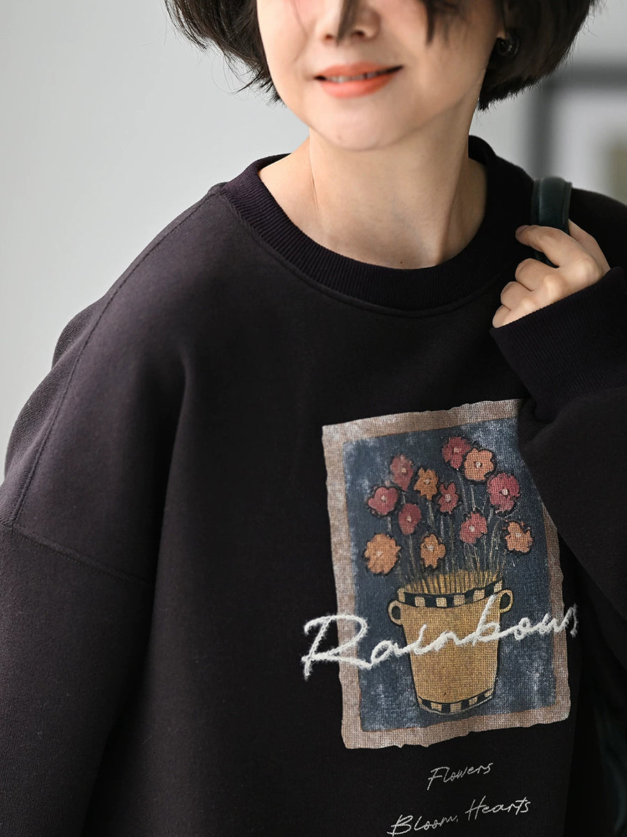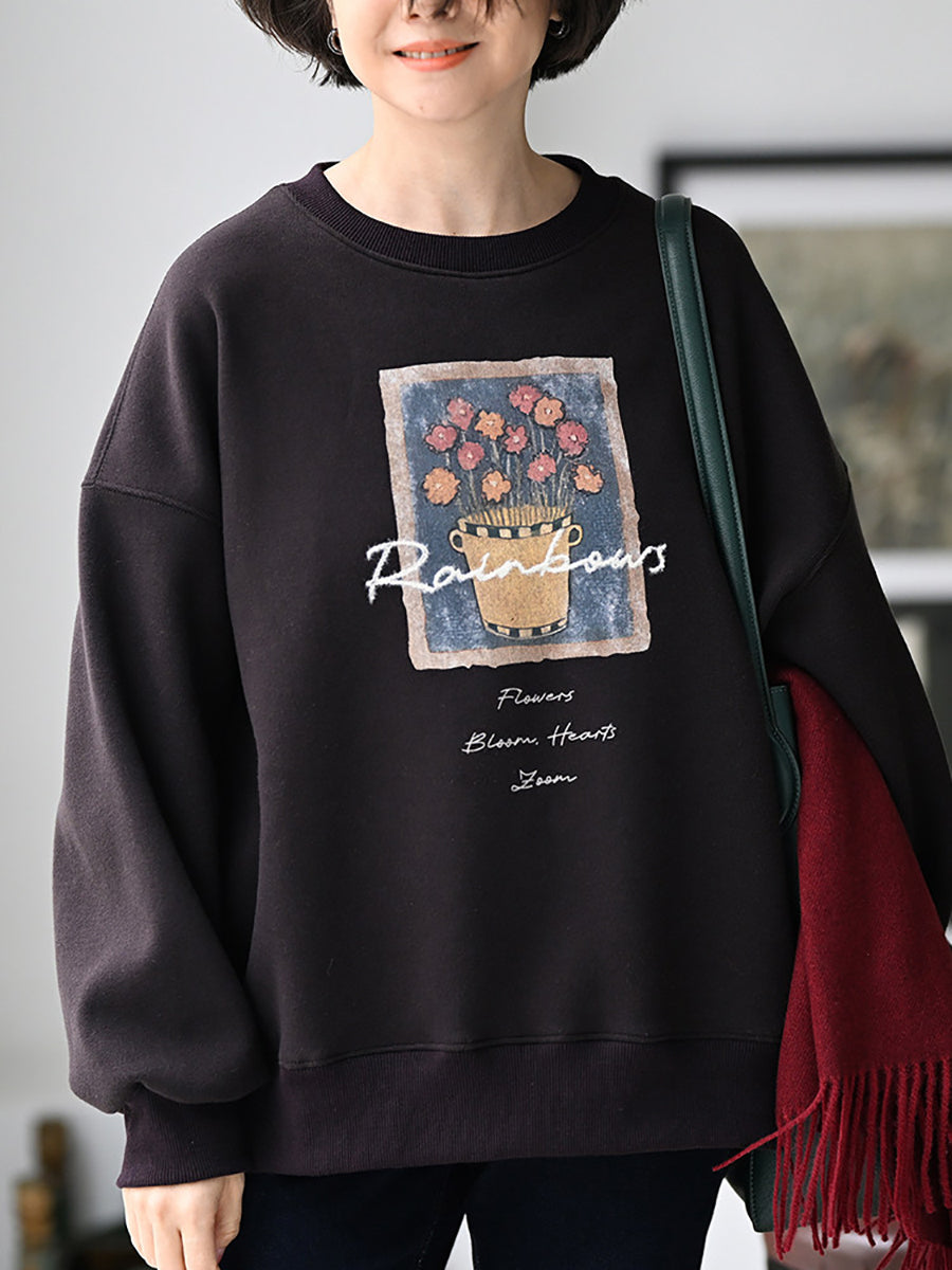 Women Artsy Winter Print Fleece-lined O-Neck Blouse