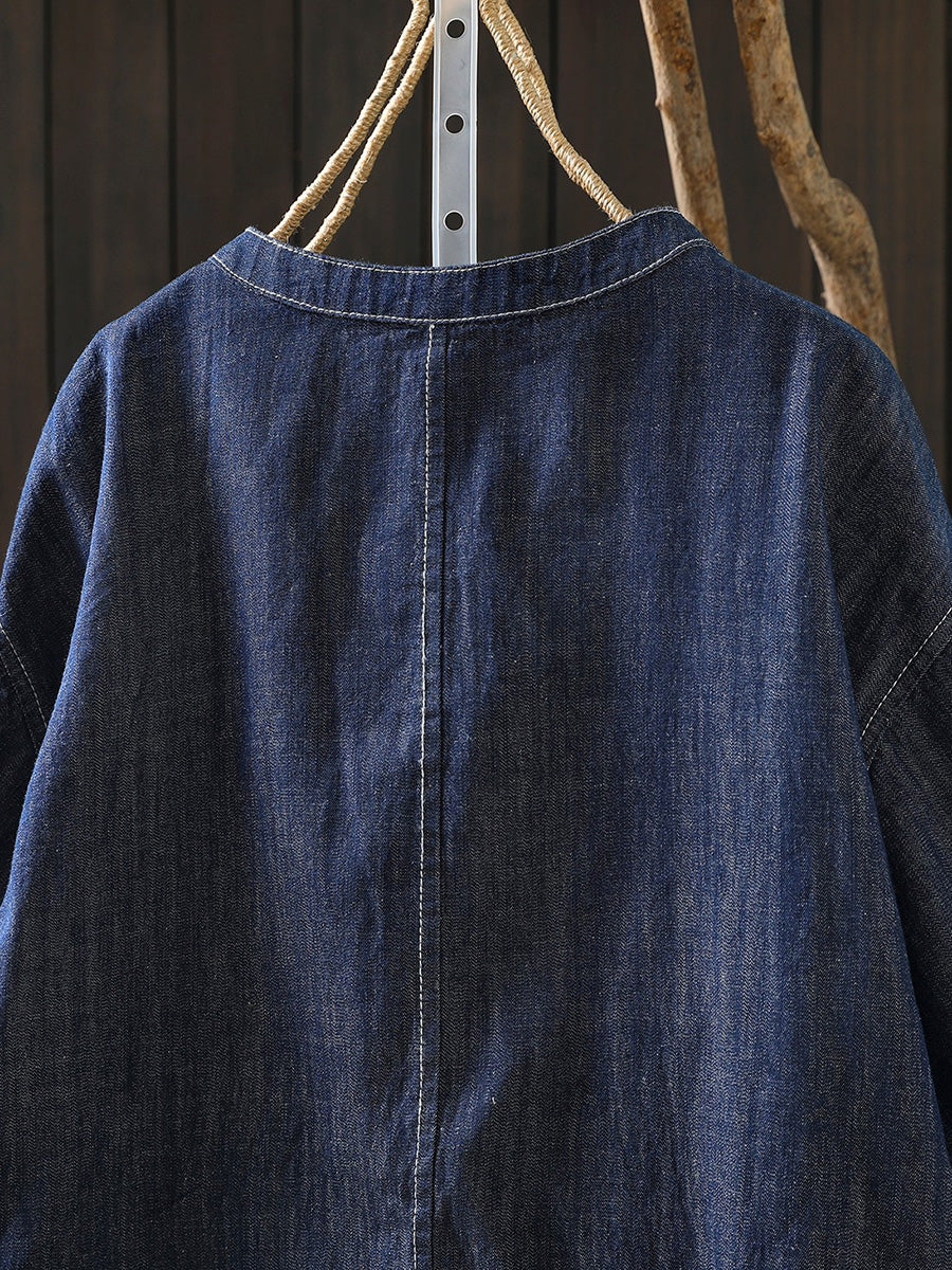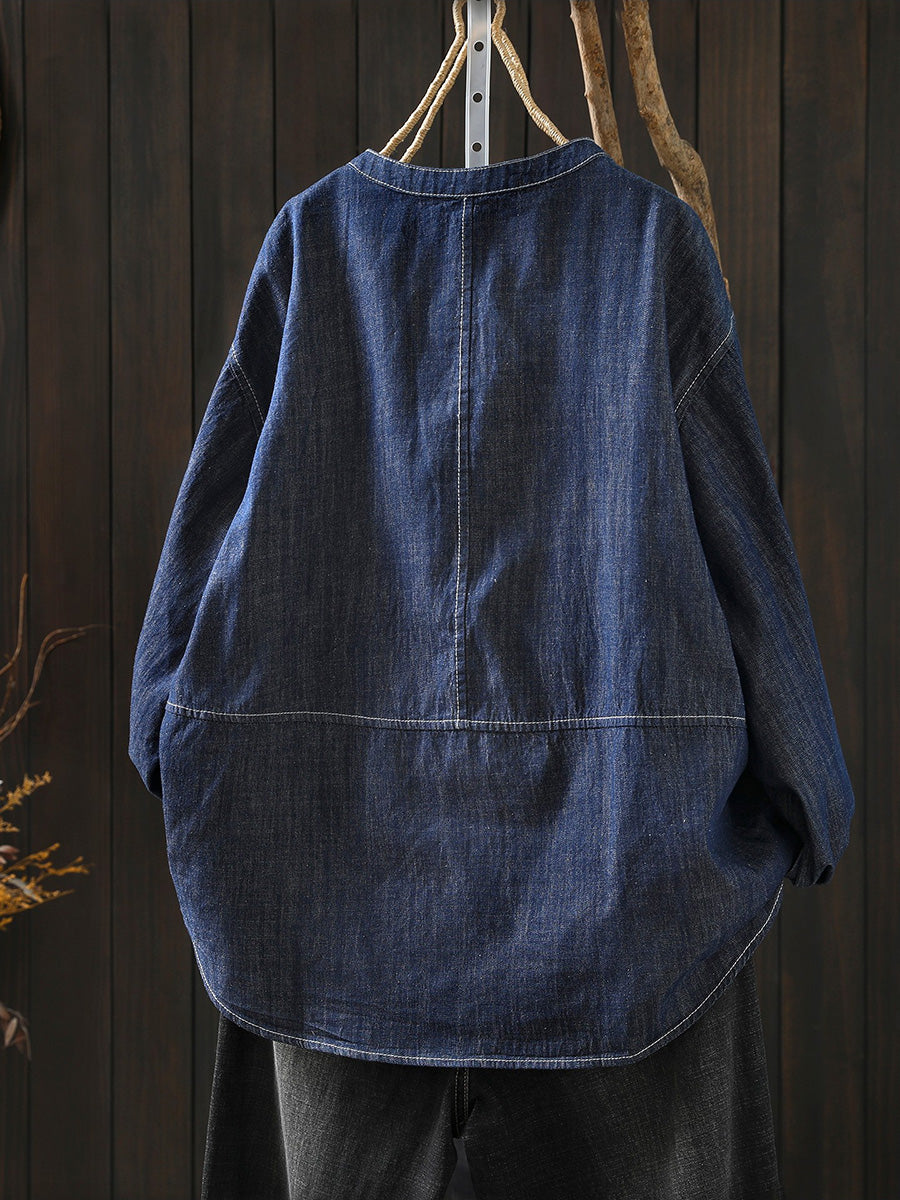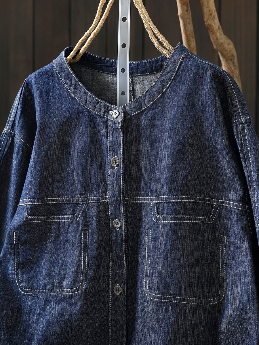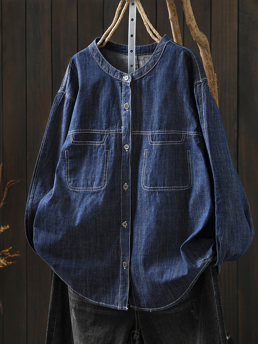 Women Artsy Spring Pure Color Denim O-Neck Shirt