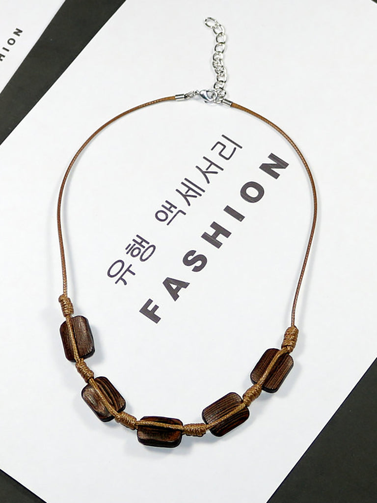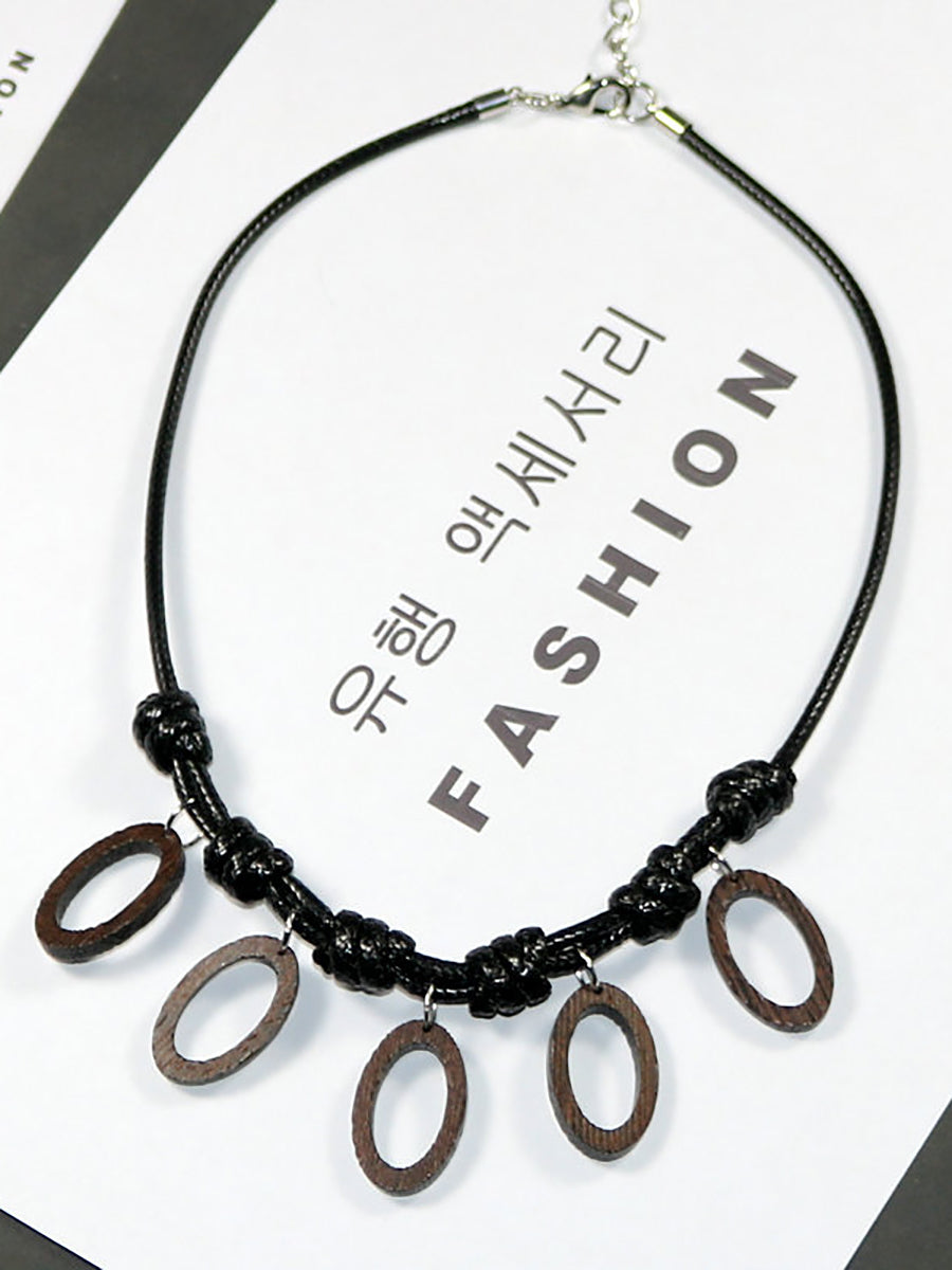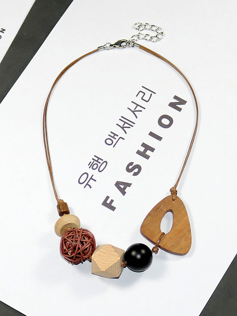 Women Artsy Wooden Straw Geometric Pendent Necklace