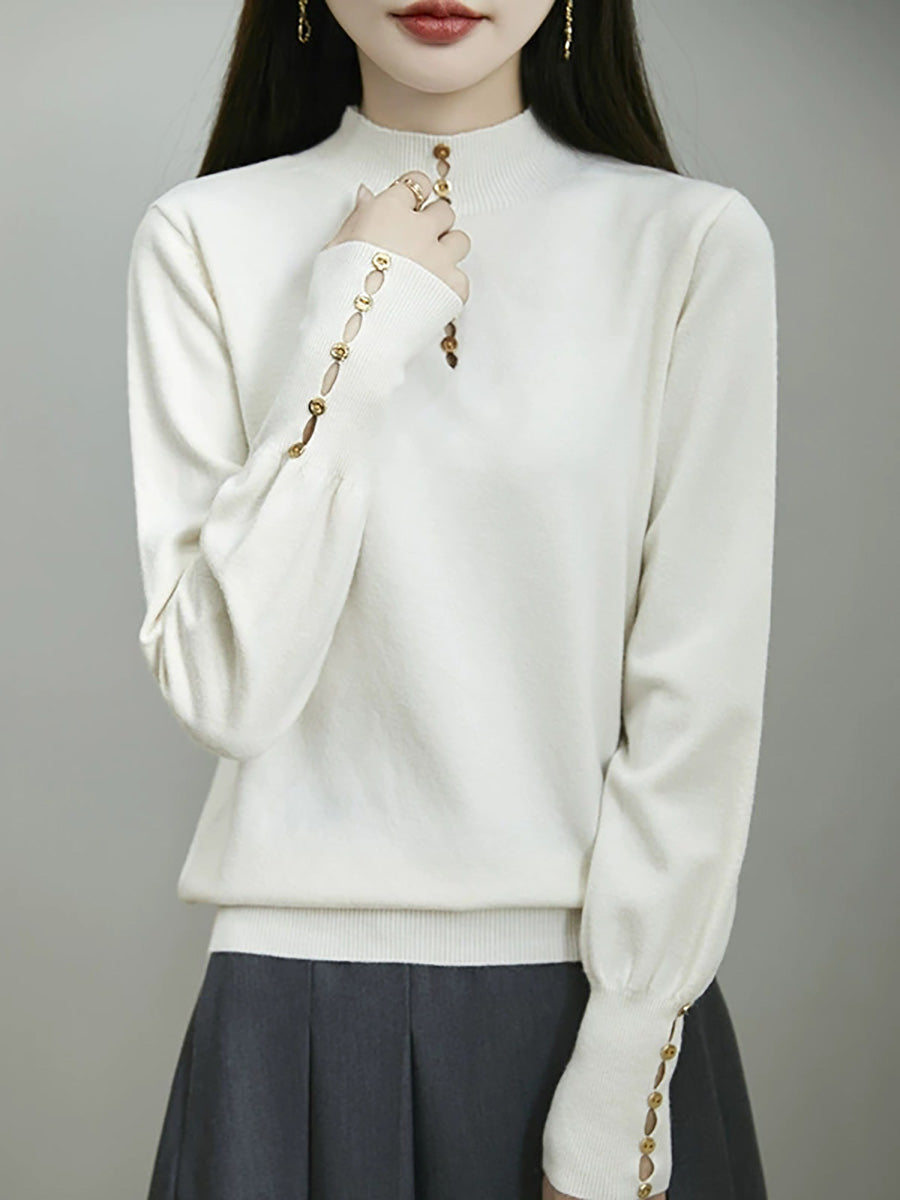 Women Autumn Artsy Pure Color Button Half-Turtleneck Sweater