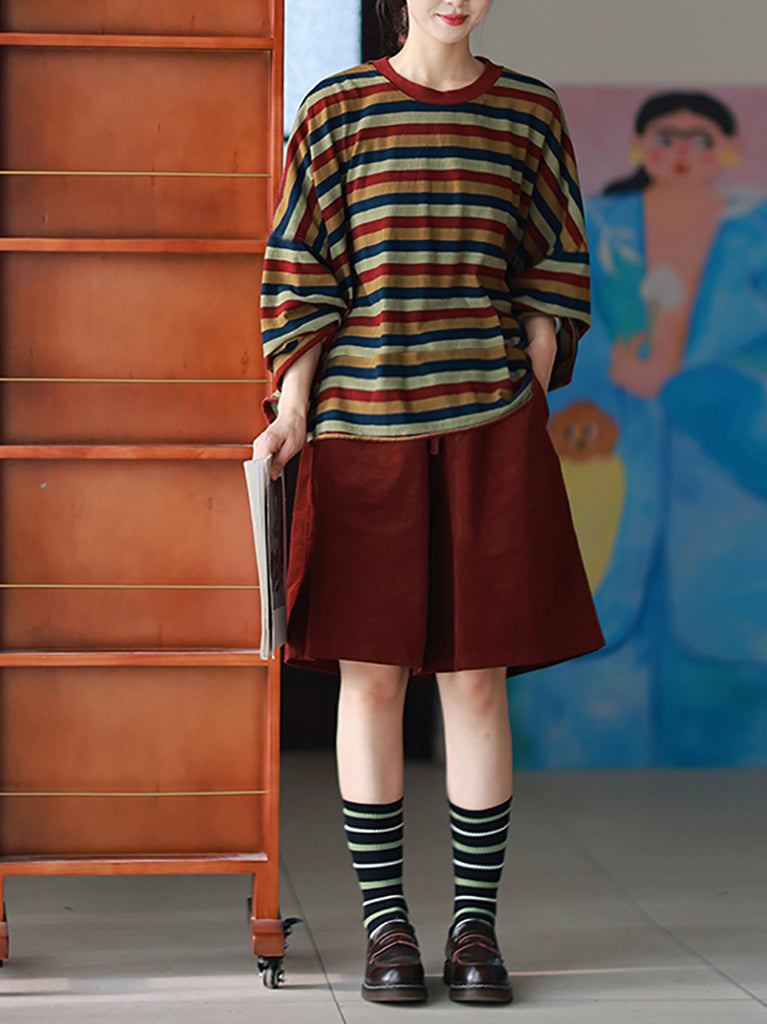 Plus Size Women Autumn Casual Stripe O-Neck 100%Cotton Blouse