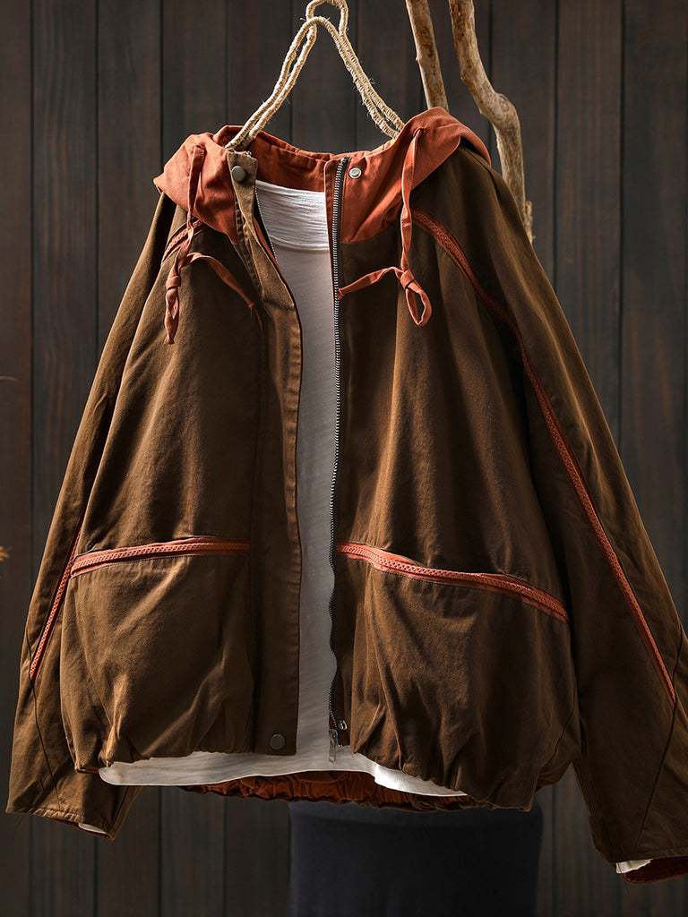Women Autumn Colorblock Hooded Cotton Cardigan Coat