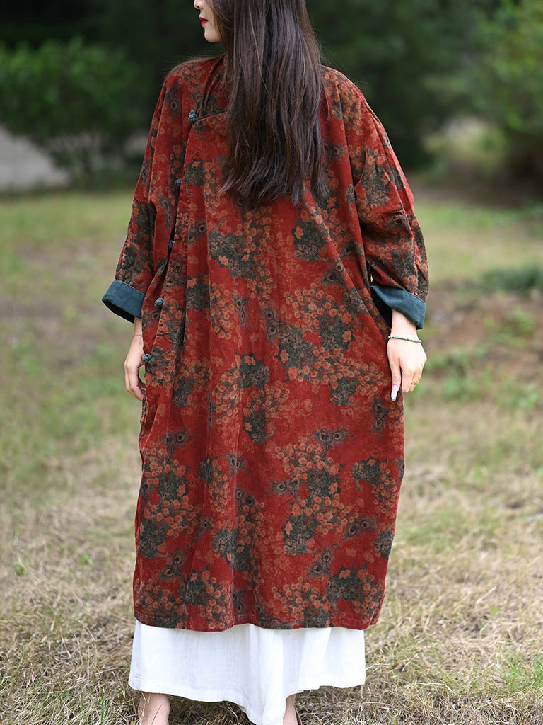 This robe dress is made from corduroy fabric, featuring a stand collar and an ethnic floral pattern. It has raglan full-length sleeves and a length that reaches the ankle. Suitable