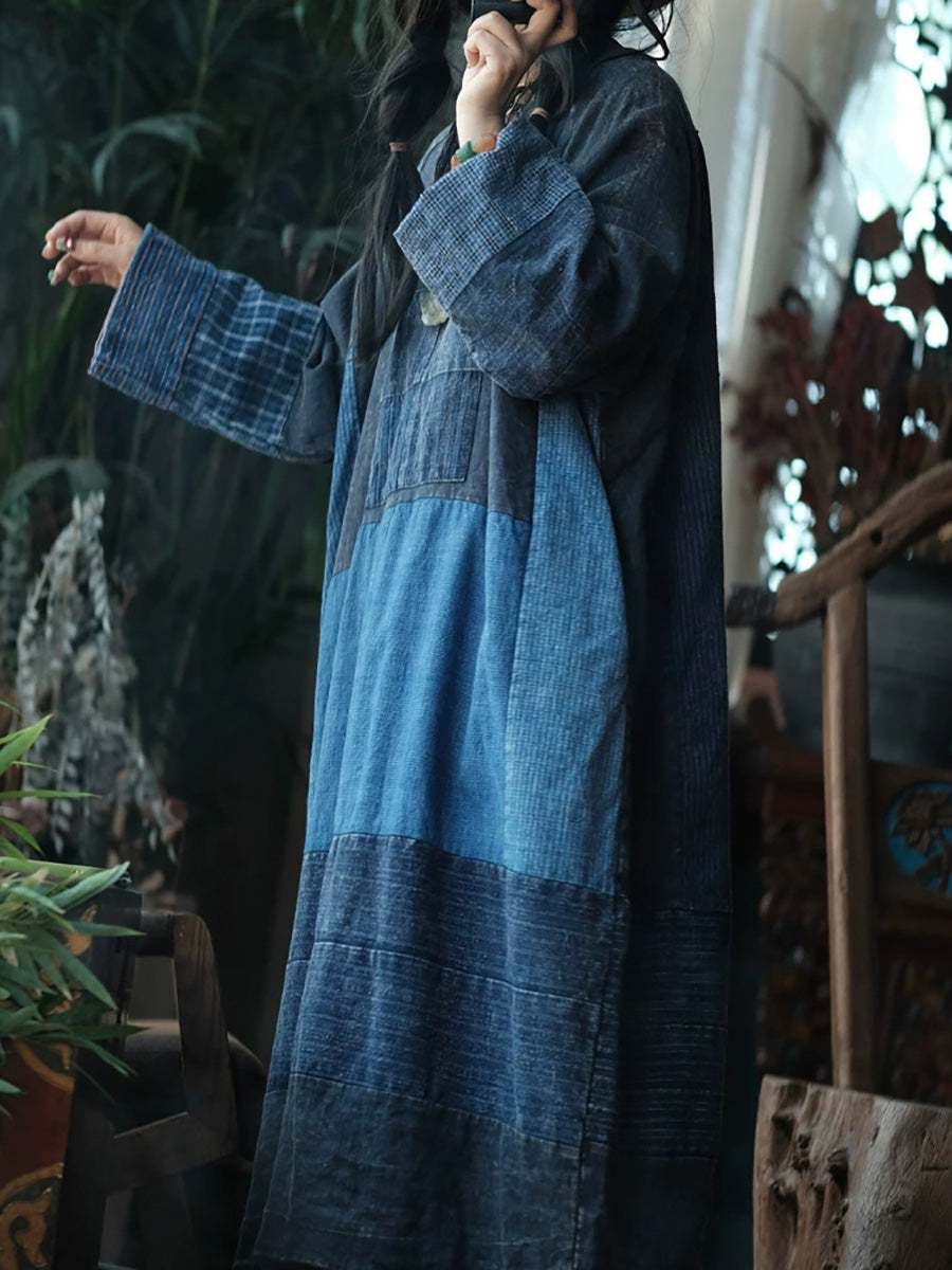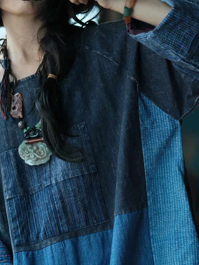 Women Autumn Retro Patchwork O-Neck Cotton Dress