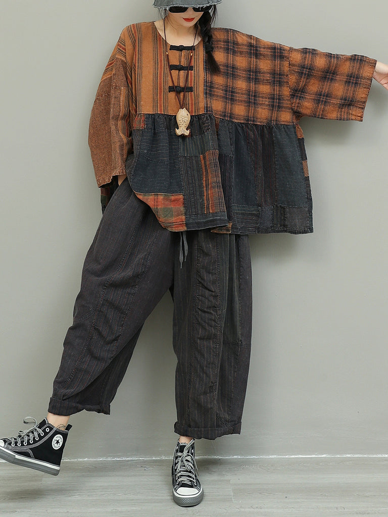 Women Autumn Retro Patchwork O-Neck Loose Cotton Suits