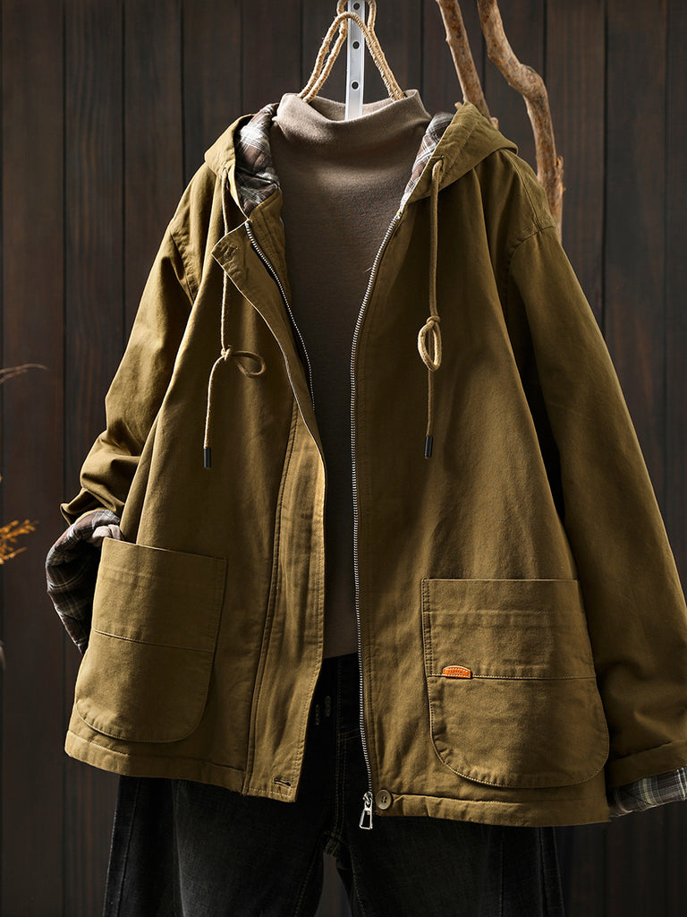 Women Autumn Retro Pure Color Cotton Hooded Jacket