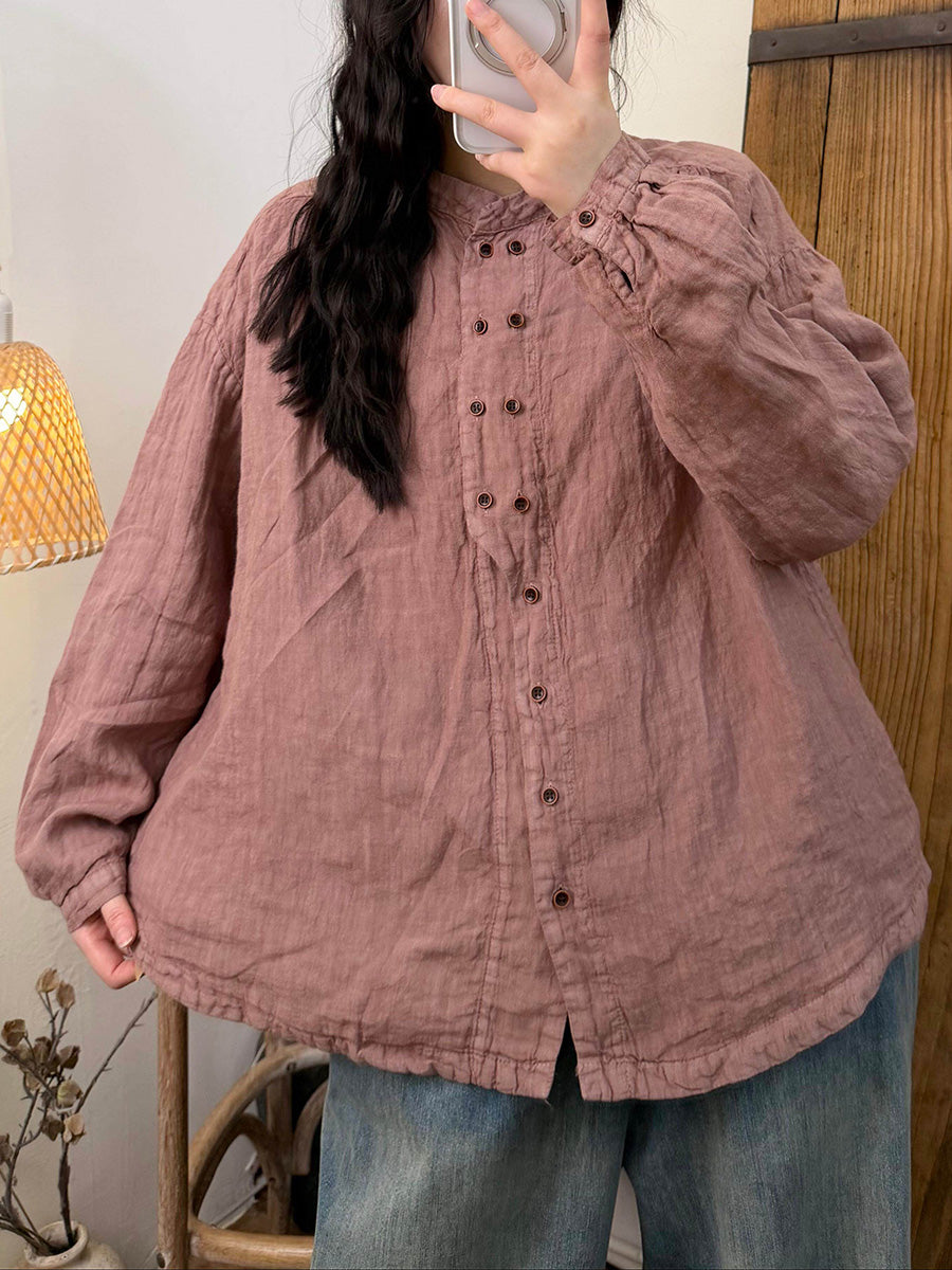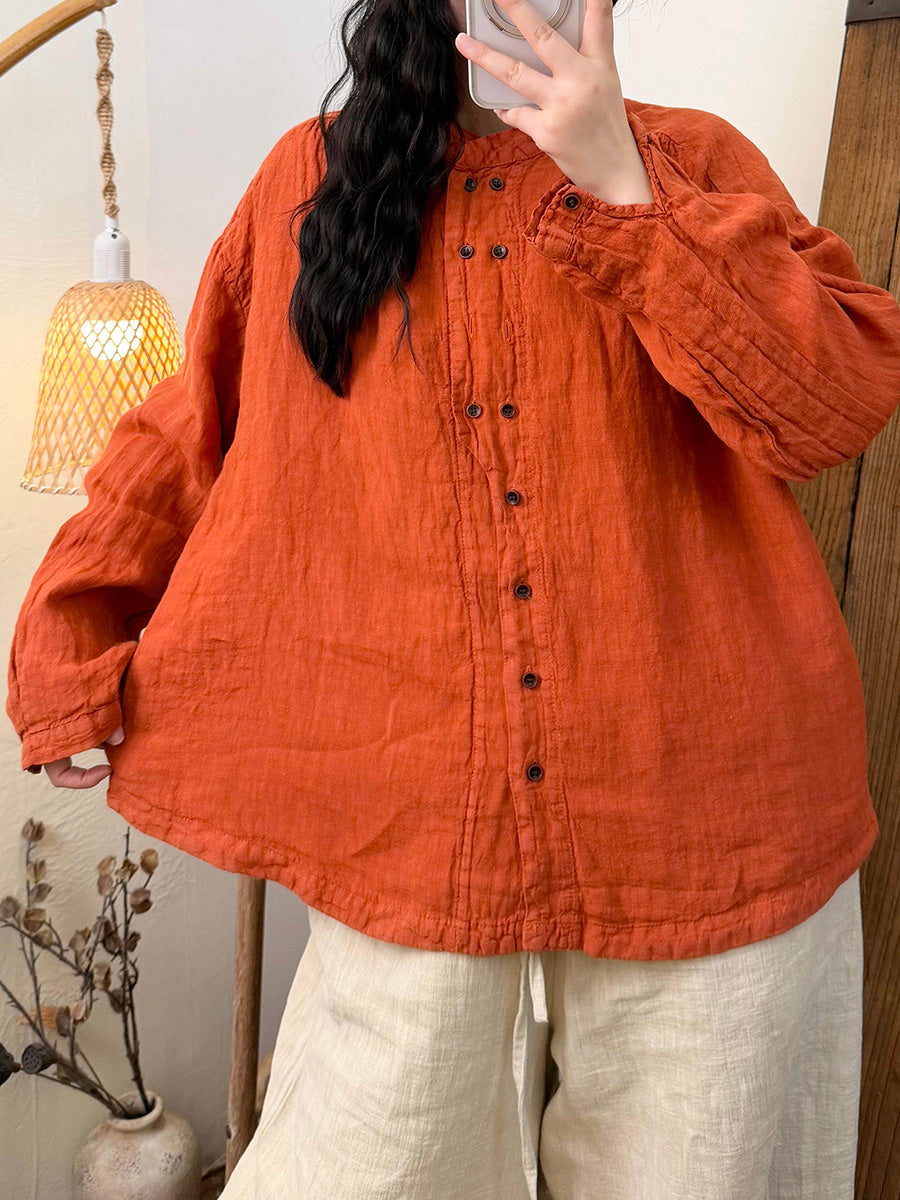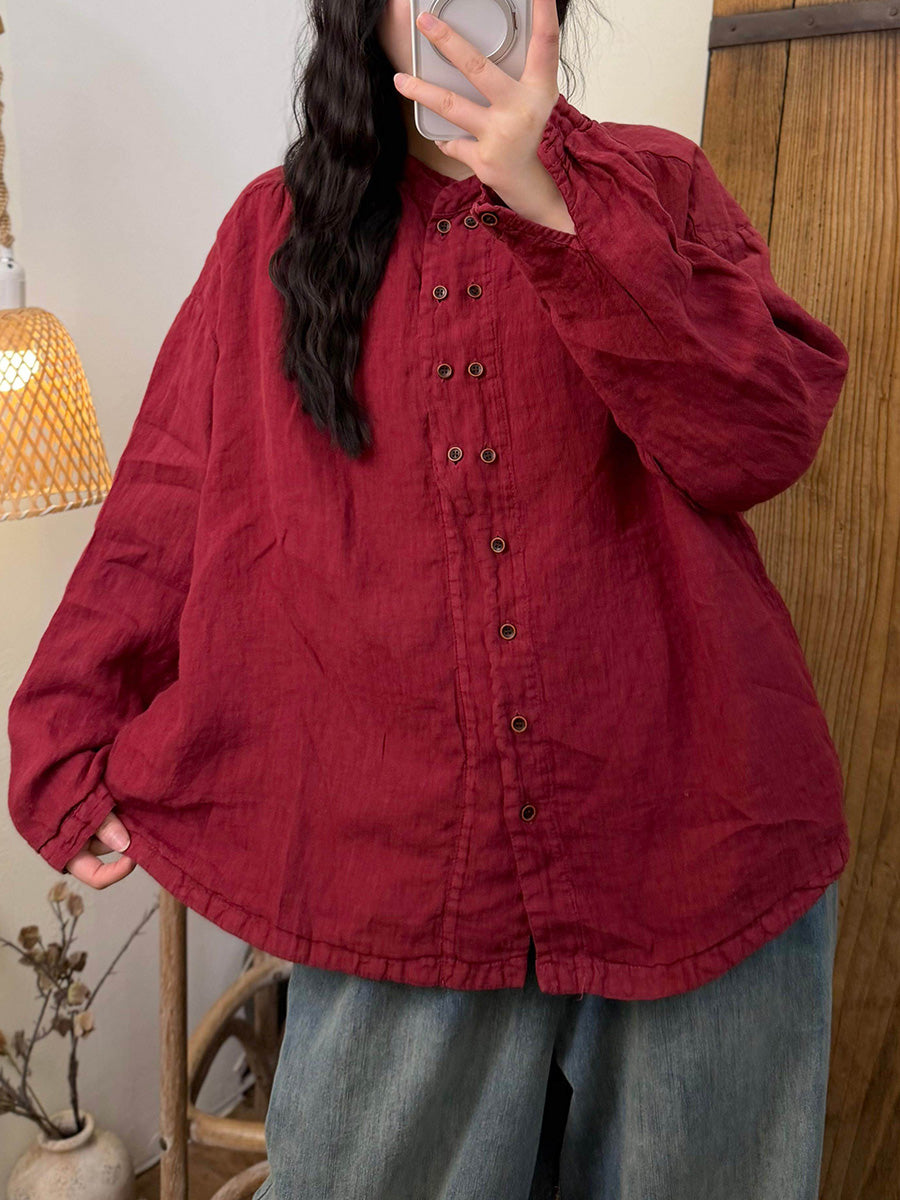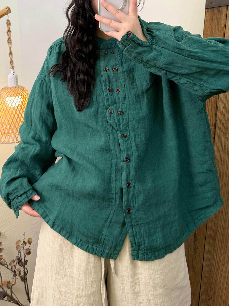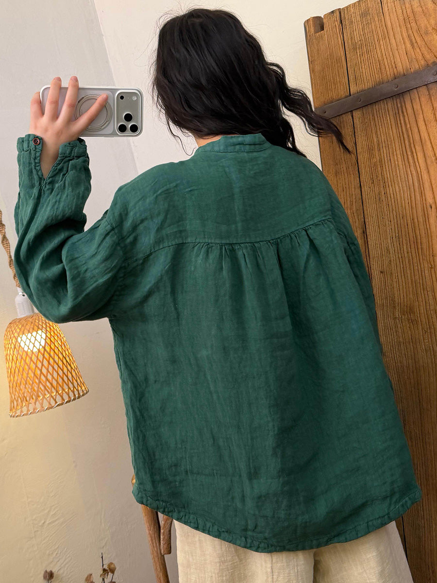 Women Autumn Retro Pure Color Linen Stand Collar Shirt