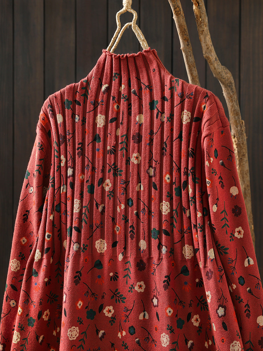 Women Autumn Vintage Floral Half-Turtleneck Knitted Dress