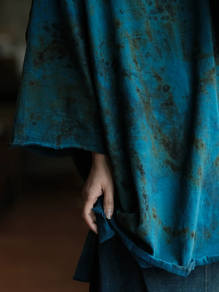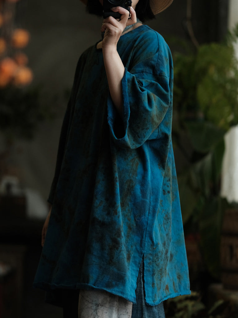 Women Autumn Vintage O-Neck Tie-dye Cotton Shirt