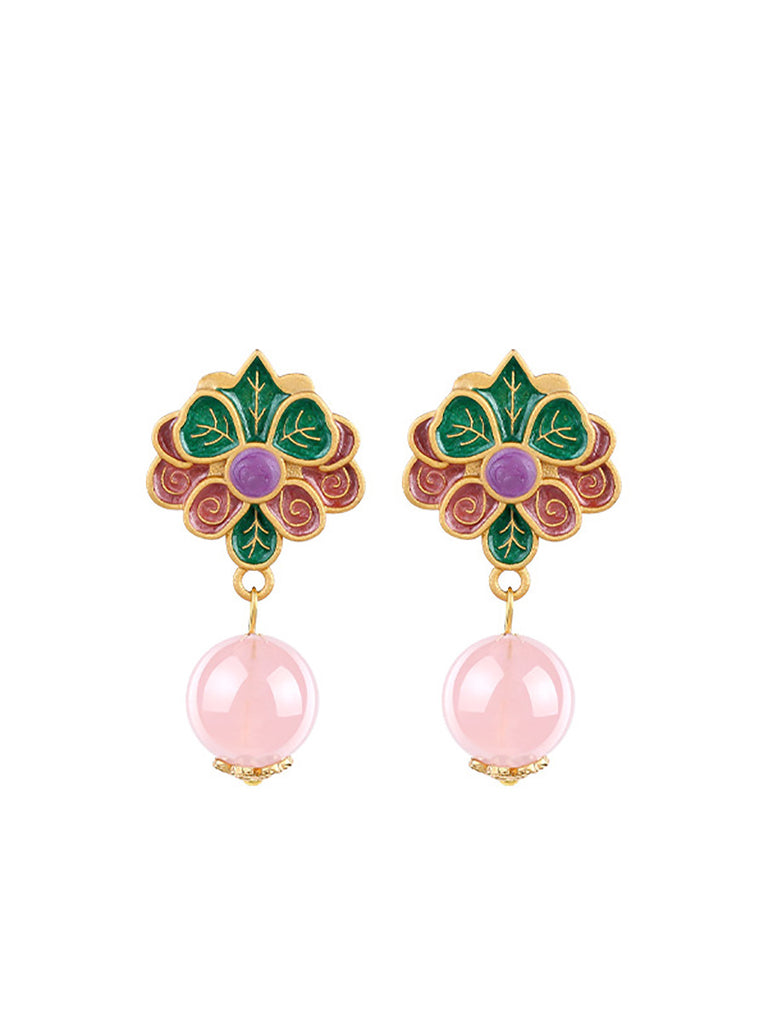 Women Ethnic Flower Jade 24K Gold Plating Earrings
