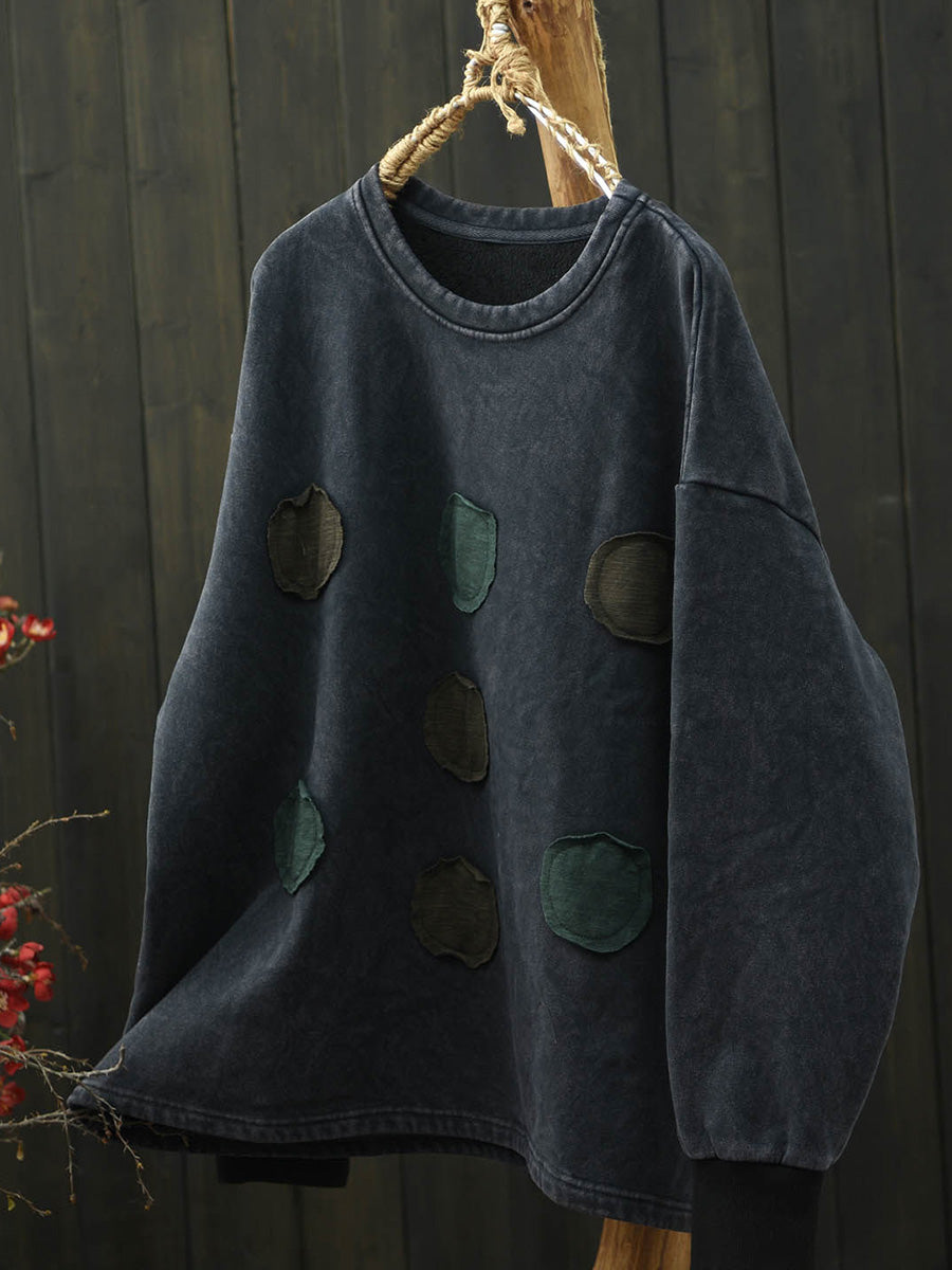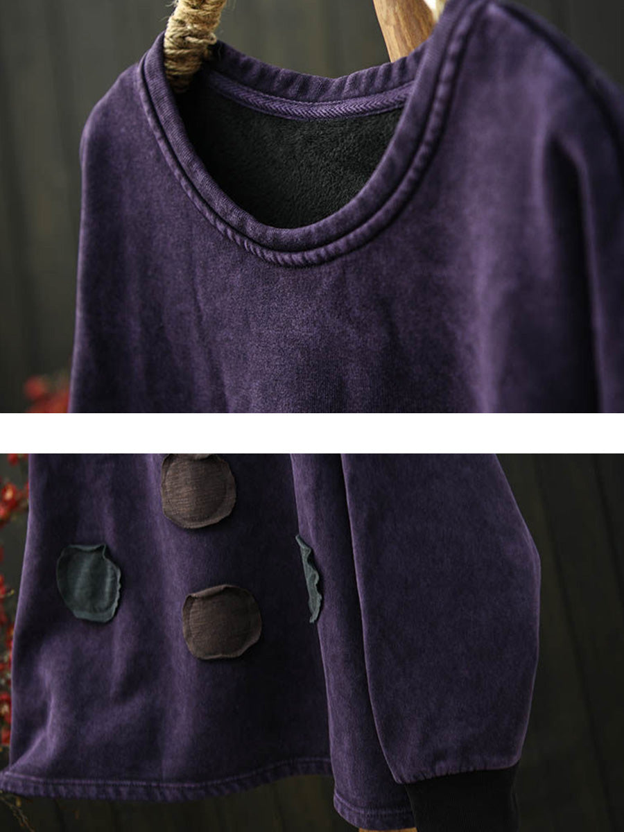 Women Retro Autumn Patchwork Fleece-lined O-Neck Blouse