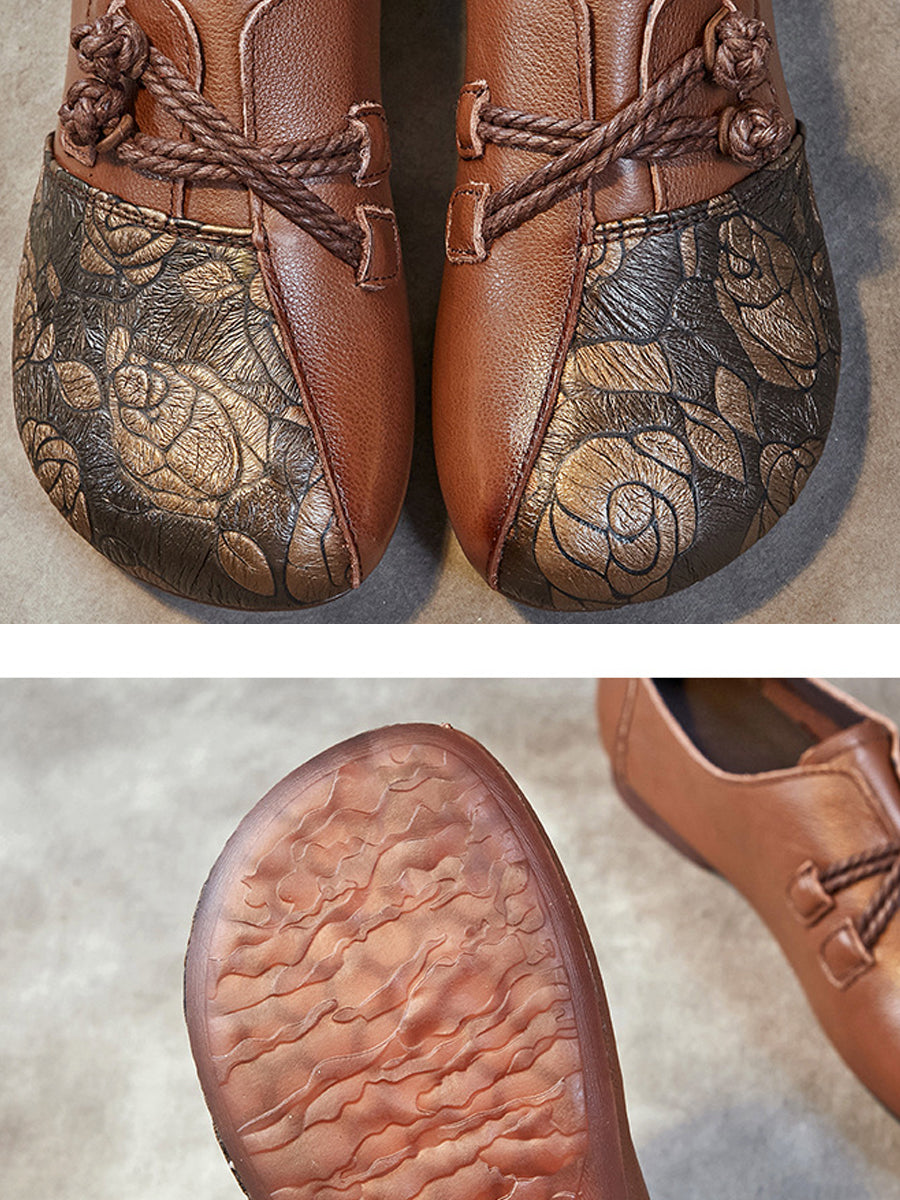 Women Retro Flower Leather Spliced Low Heel Shoes