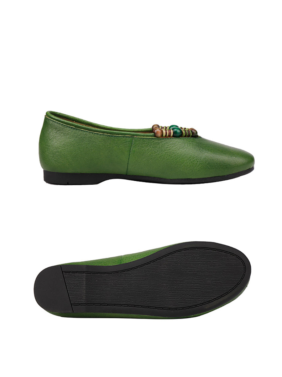 Women Retro Genuine Leather Beads Flat Shoes