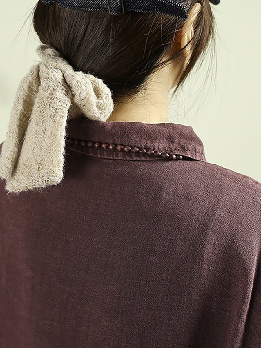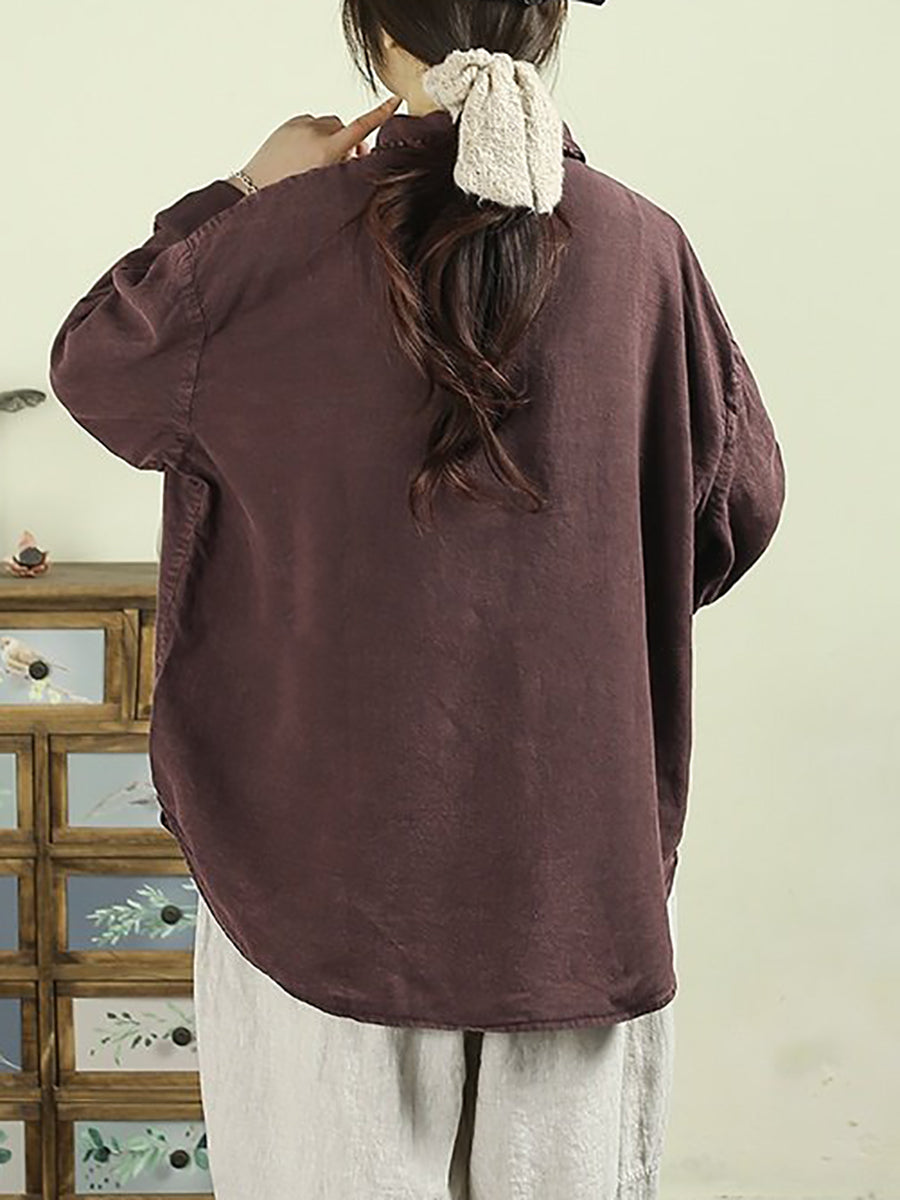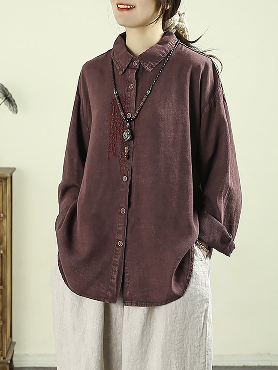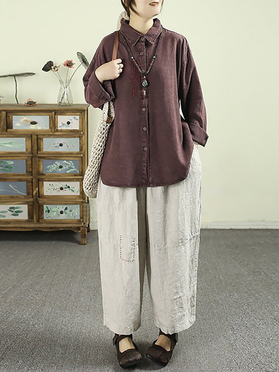 Women Retro Spring Pure Color Turn-down Collar 100%Linen Shirt