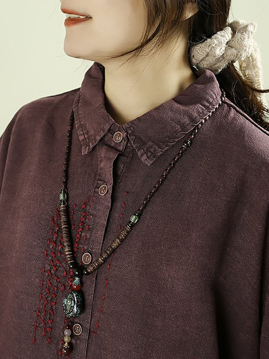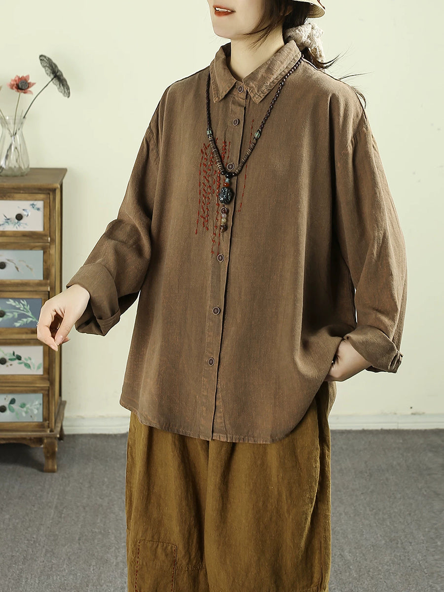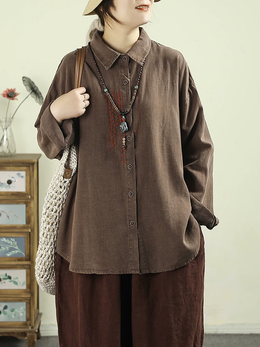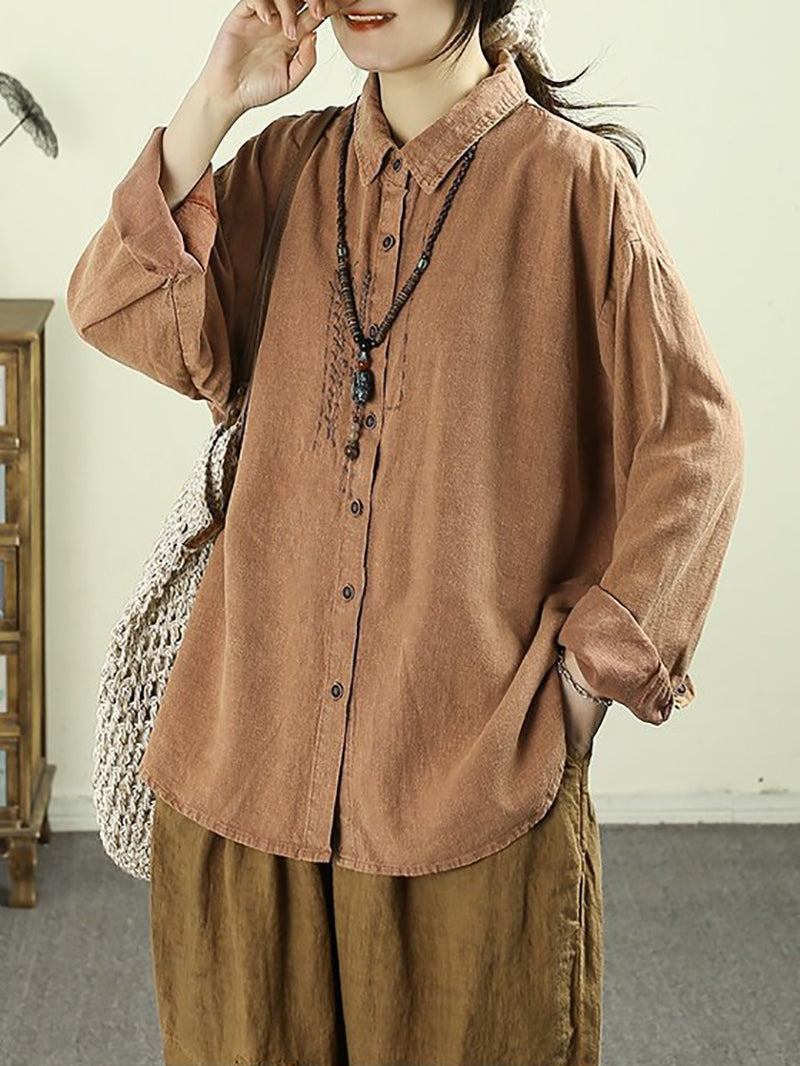 Women Retro Spring Pure Color Turn-down Collar 100%Linen Shirt