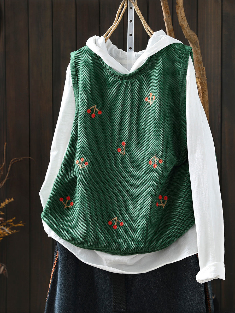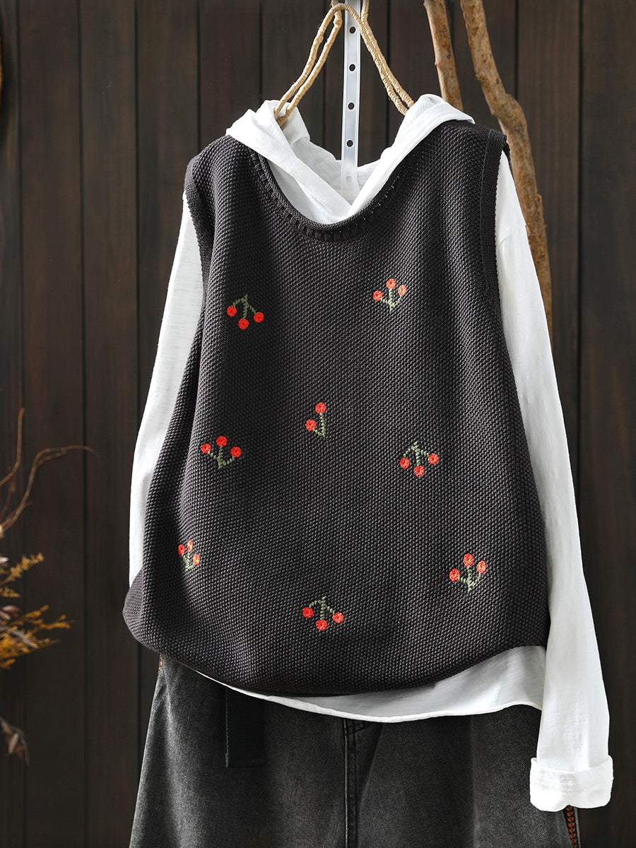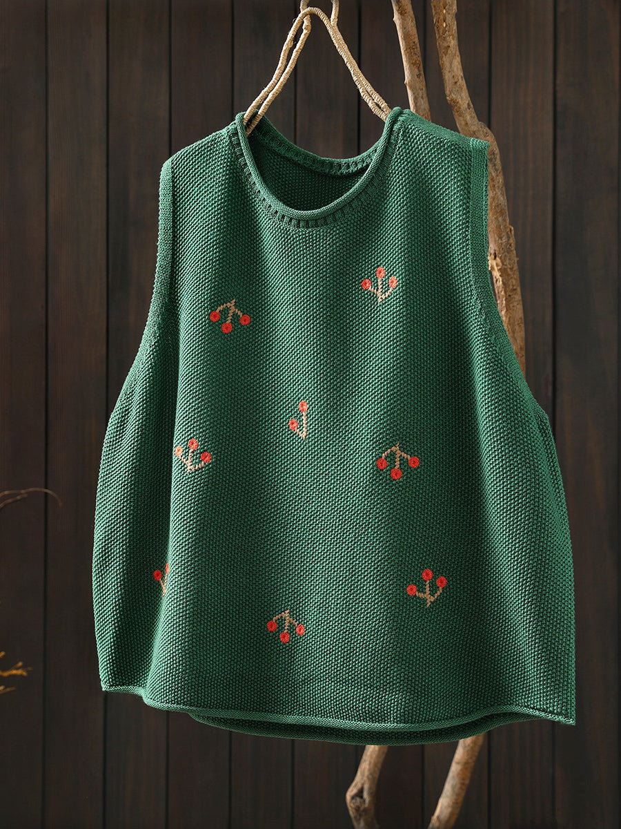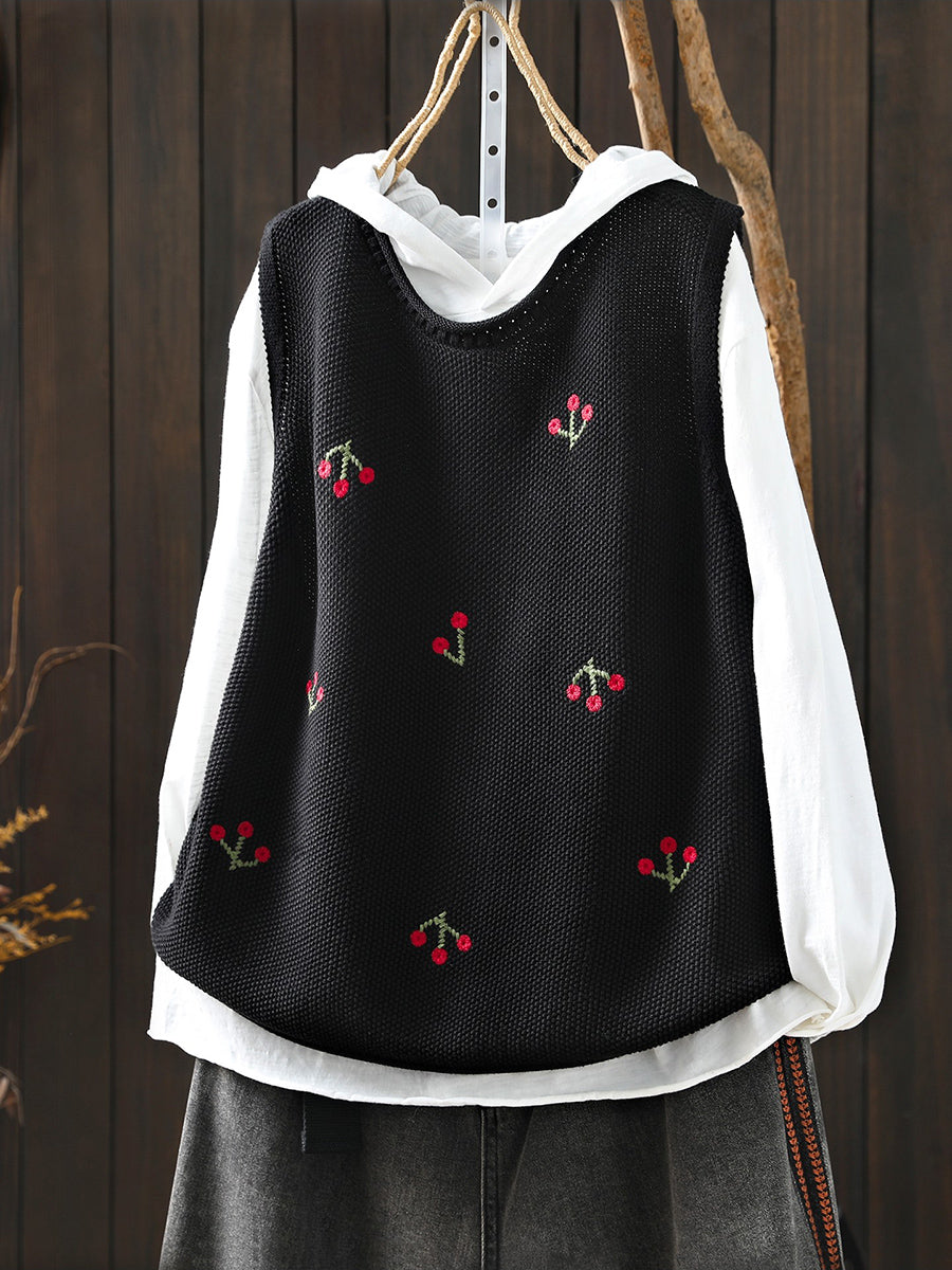 Women Spring Artsy Cherry Embroidery O-Neck Vest