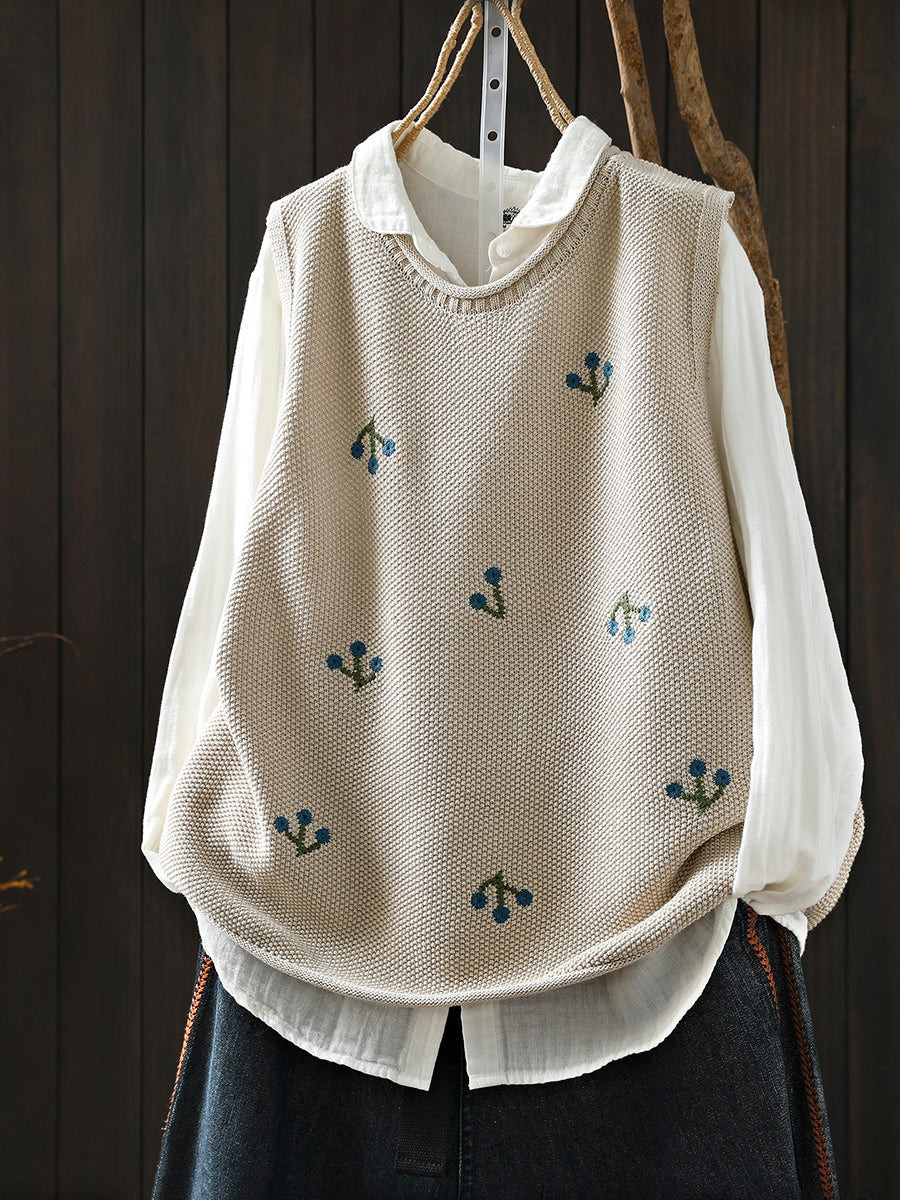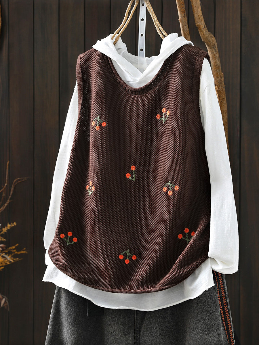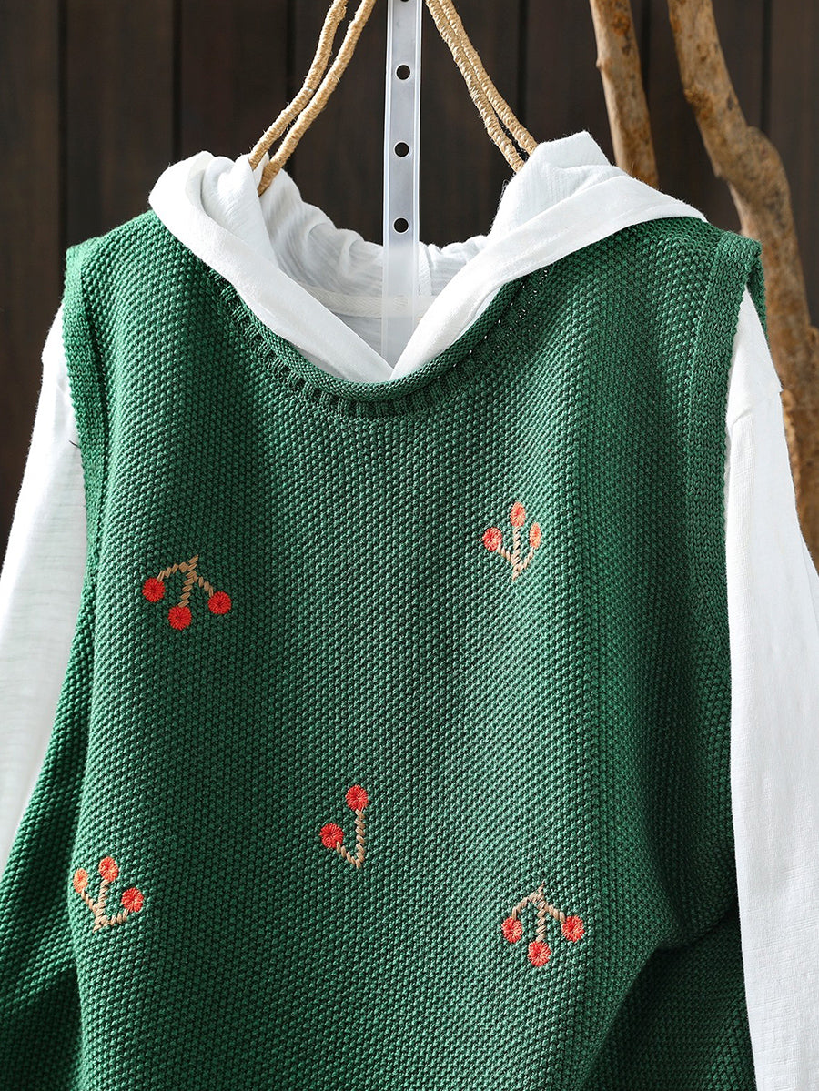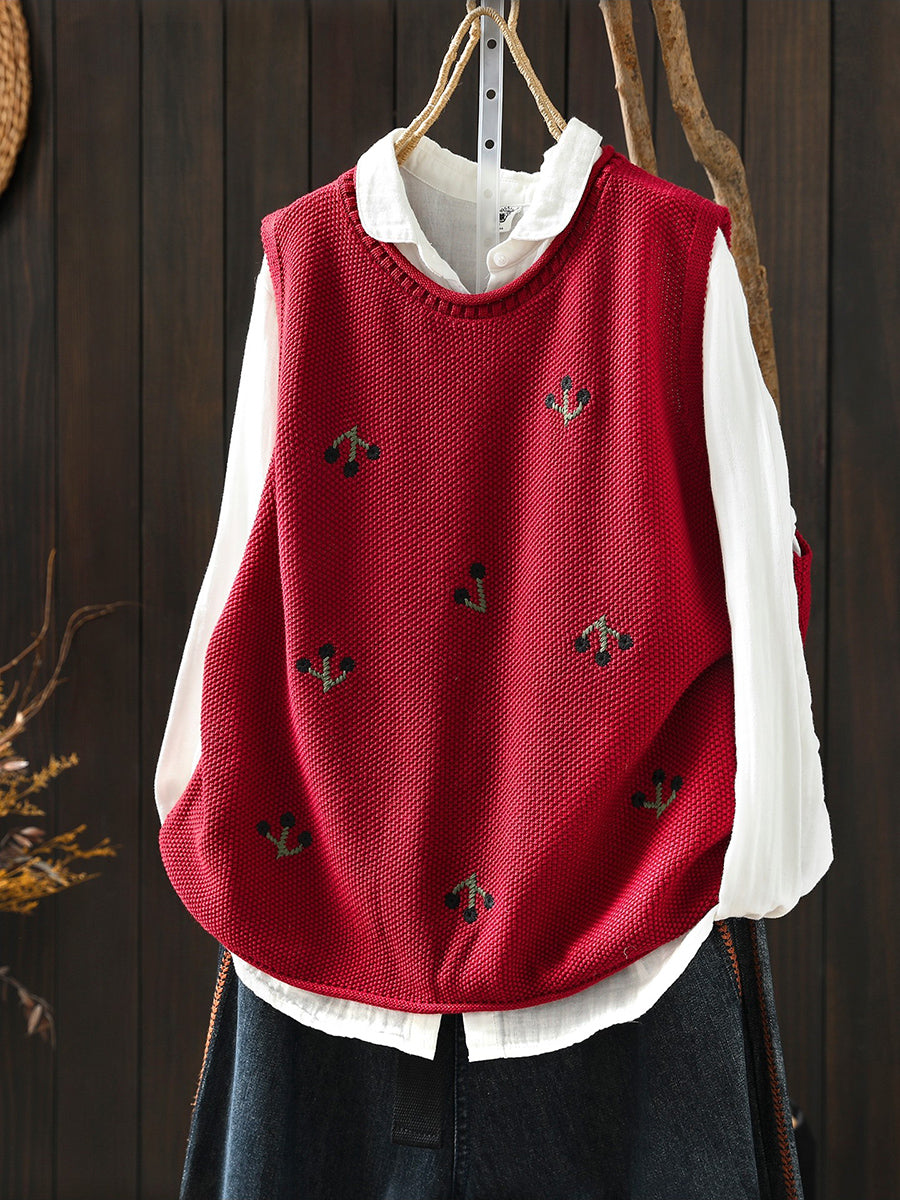 Women Spring Artsy Cherry Embroidery O-Neck Vest