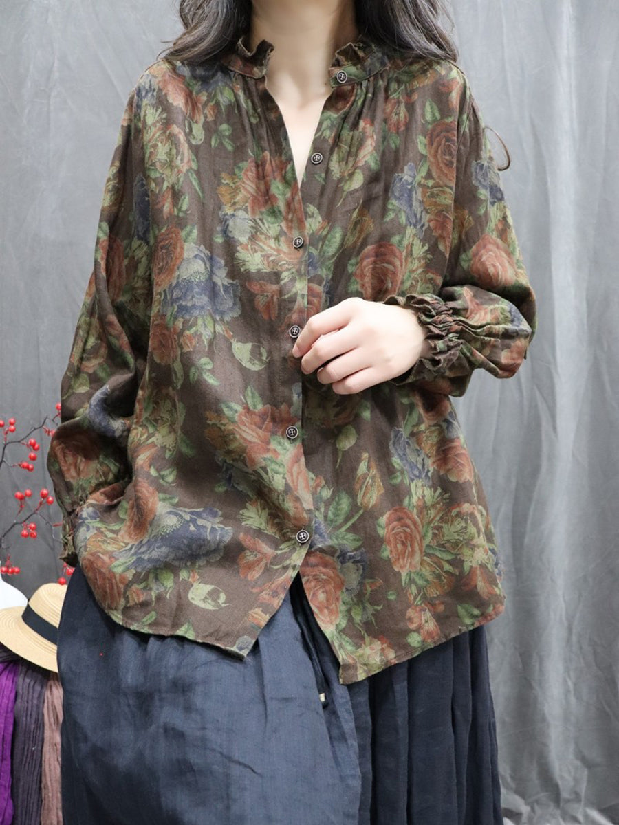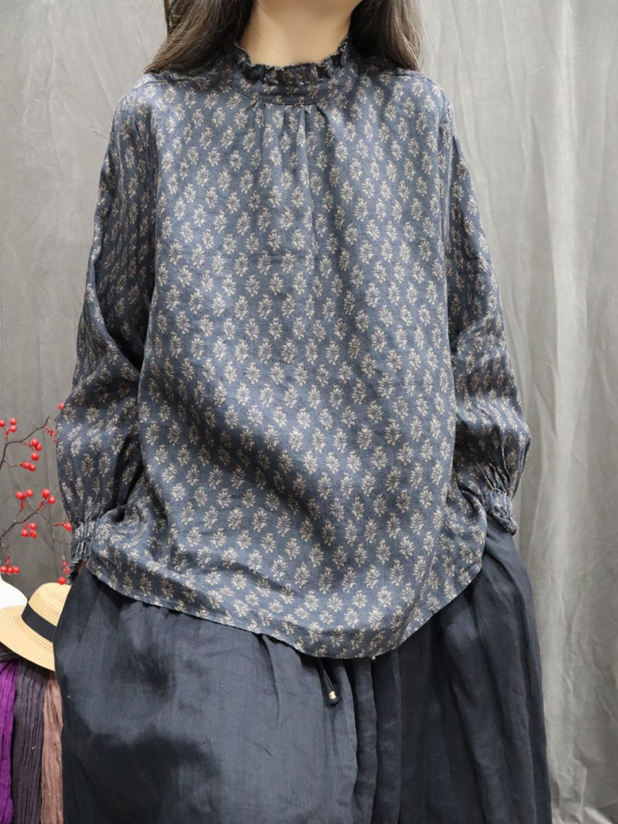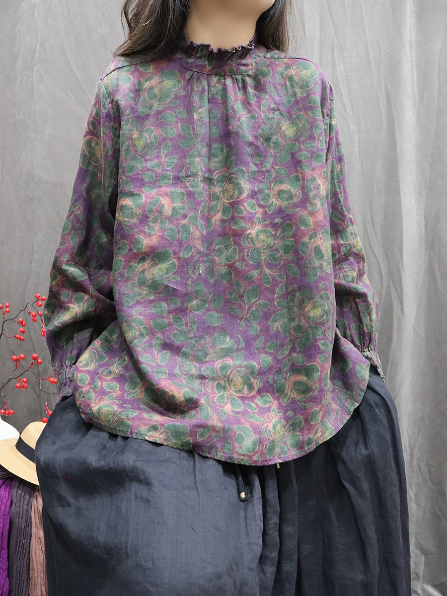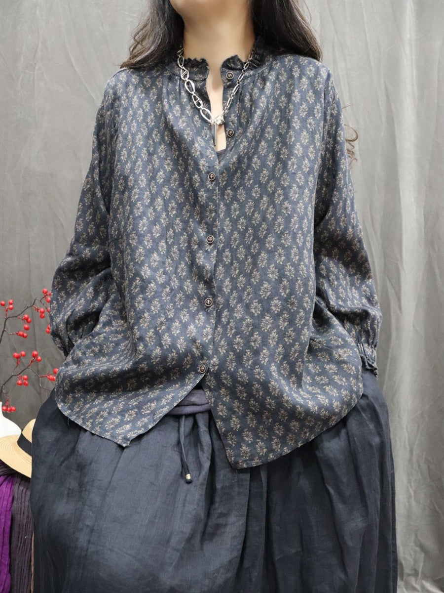 Women Spring Artsy Floral Stand Collar 100%Linen Shirt