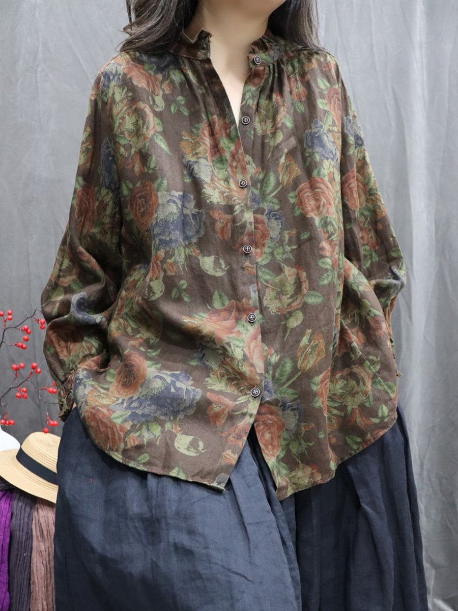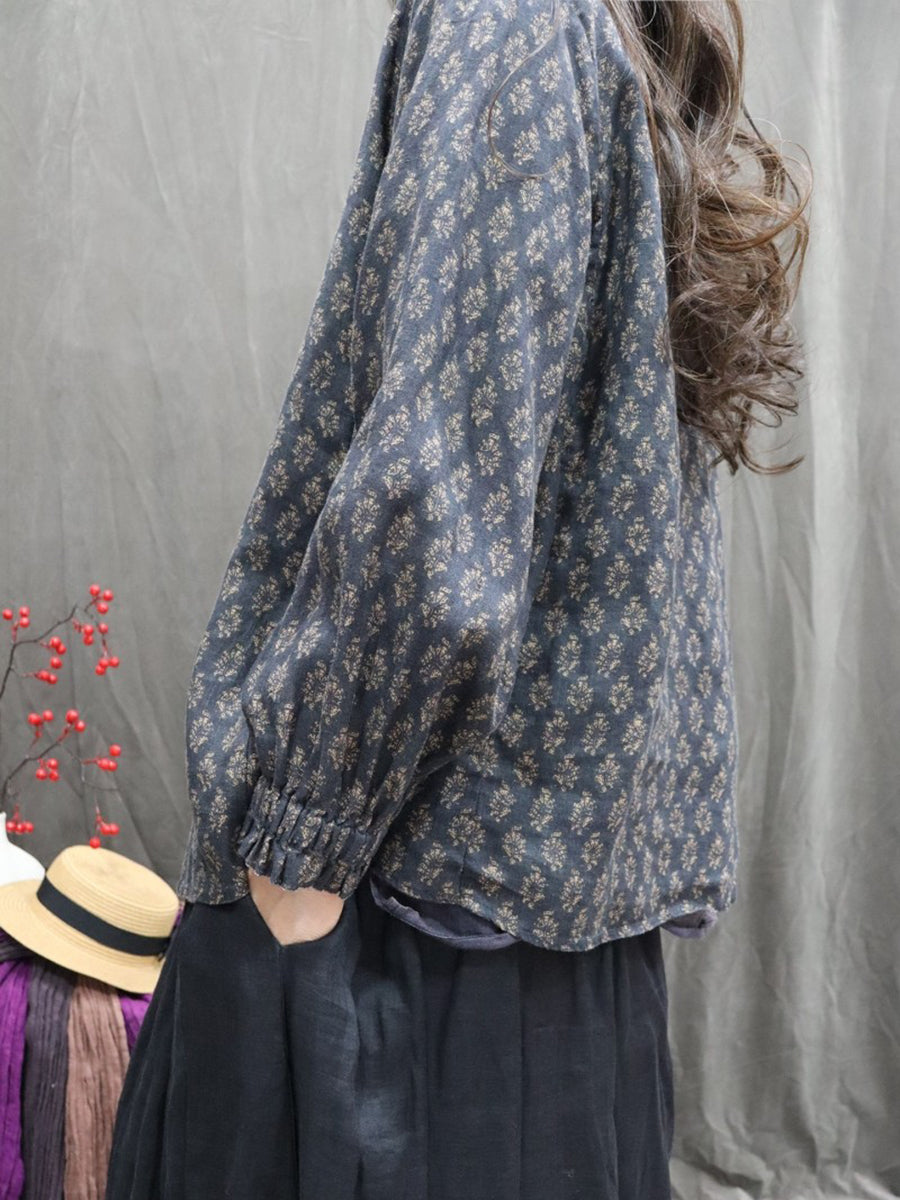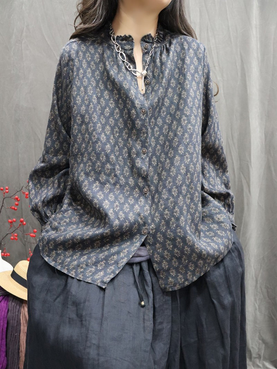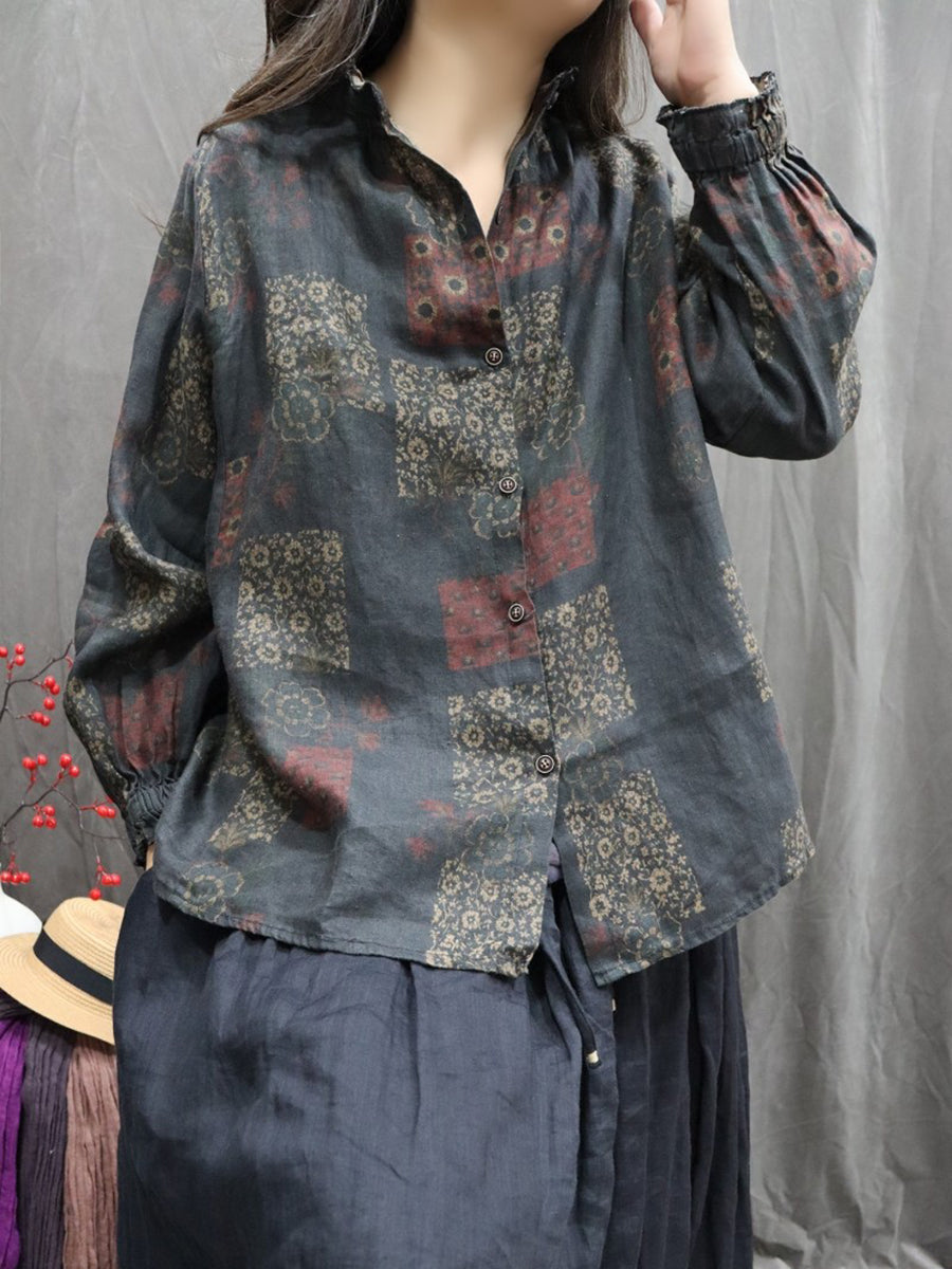 Women Spring Artsy Floral Stand Collar 100%Linen Shirt