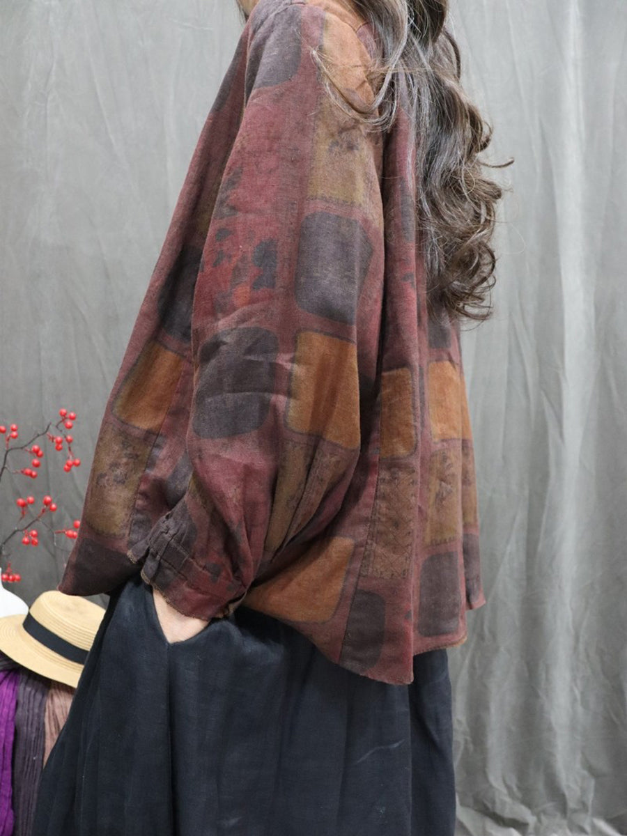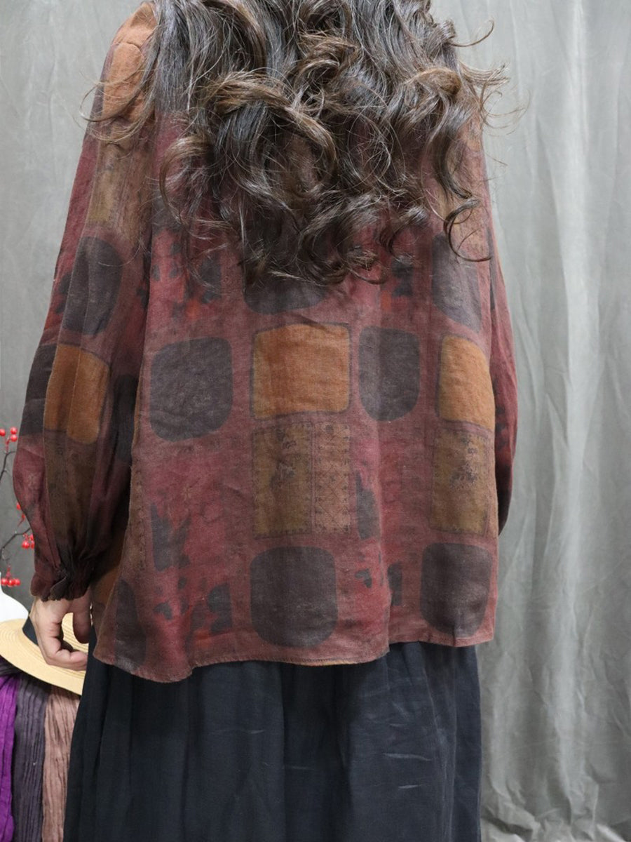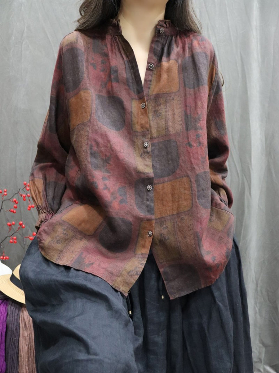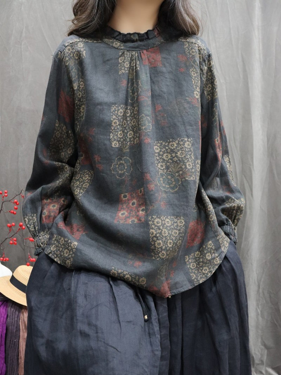 Women Spring Artsy Floral Stand Collar 100%Linen Shirt