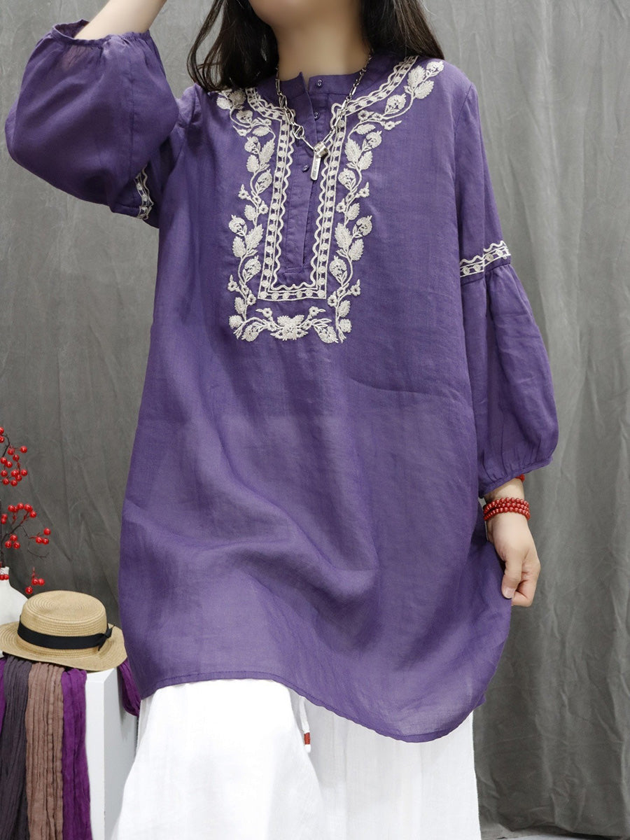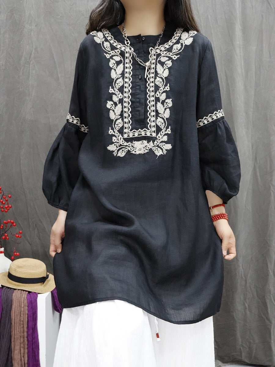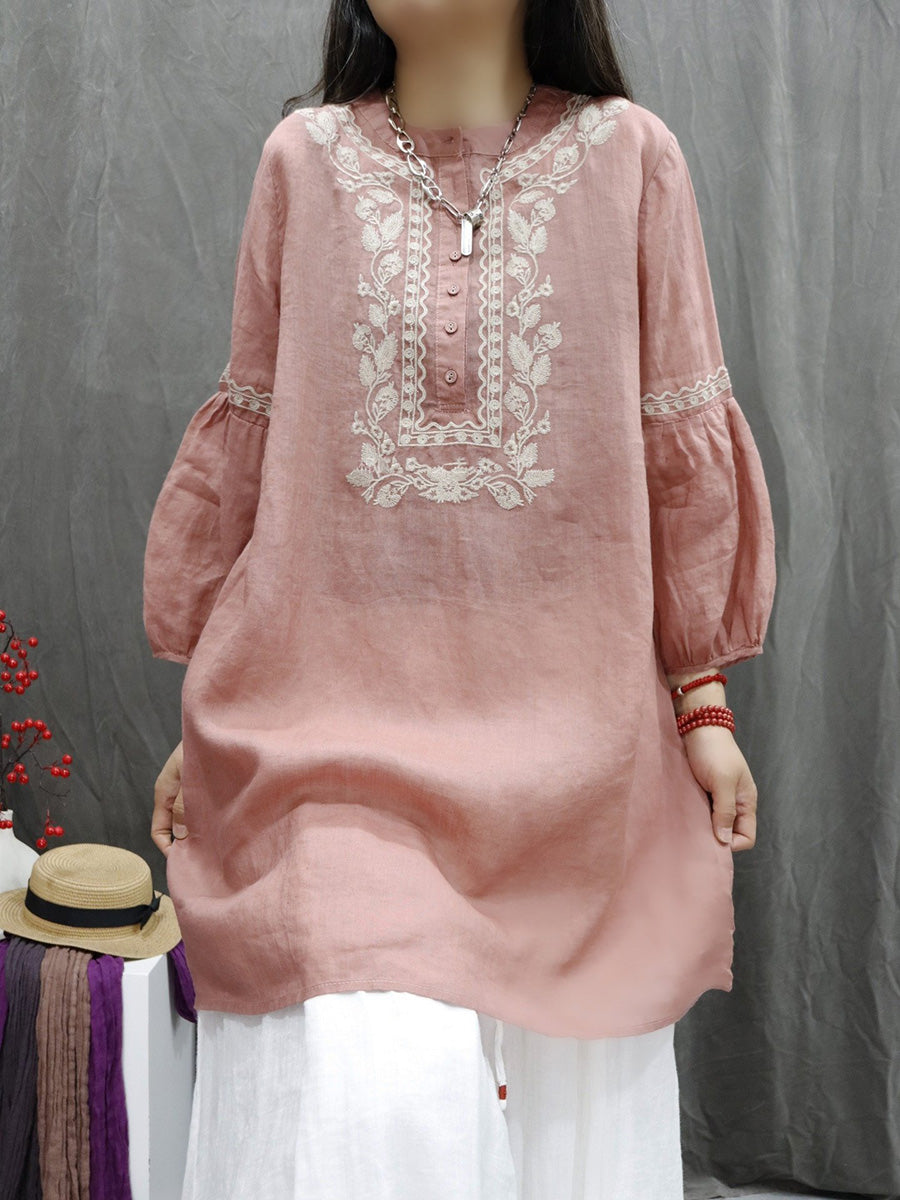 Women Spring Artsy Flower Embroidery 100%Ramie O-Neck Shirt