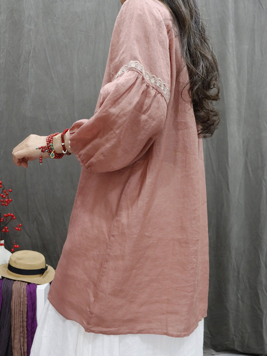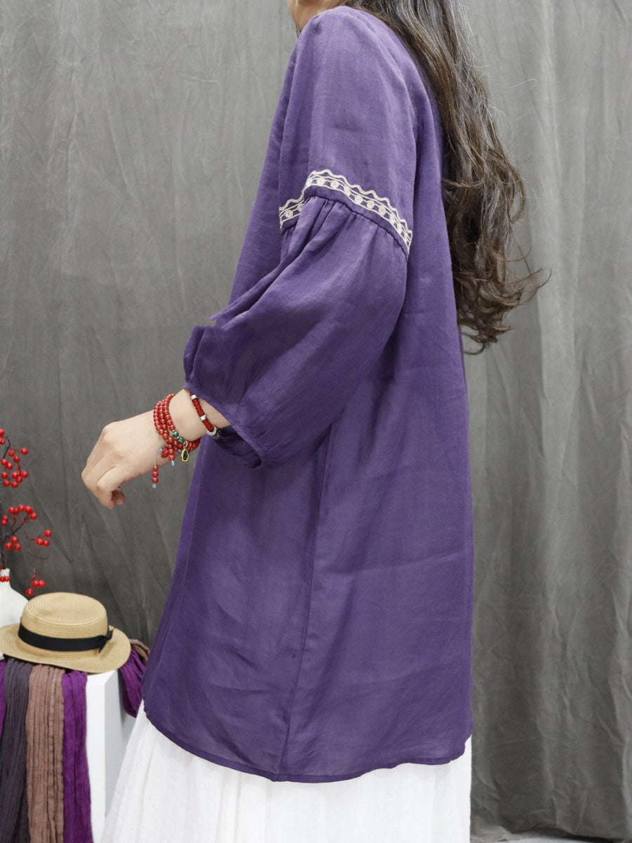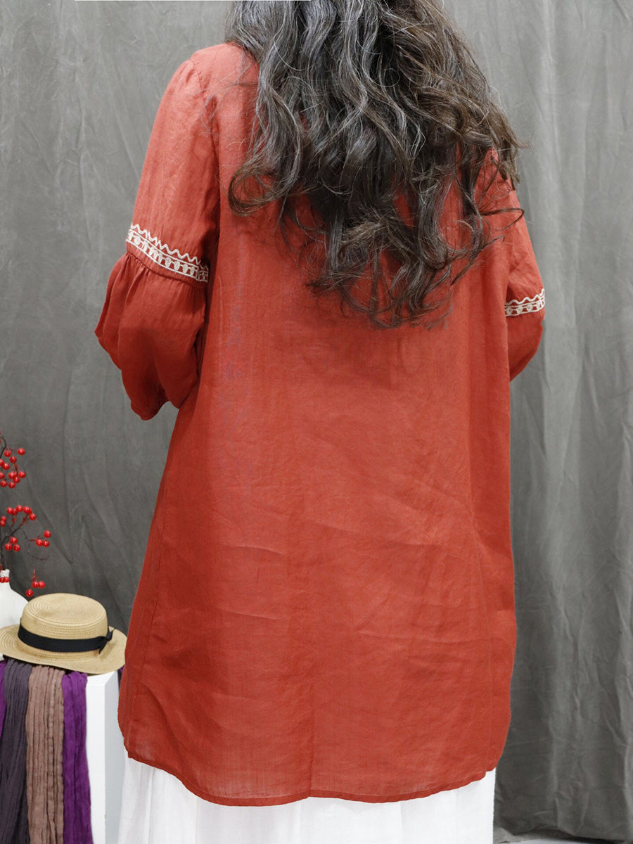 Women Spring Artsy Flower Embroidery 100%Ramie O-Neck Shirt
