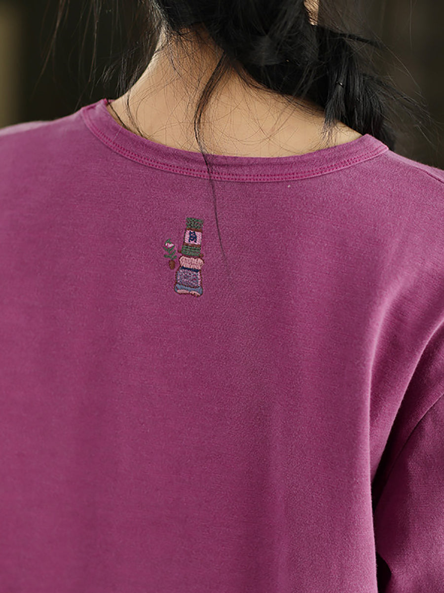 Women Spring Artsy Pure Color 100%Cotton O-Neck Blouse