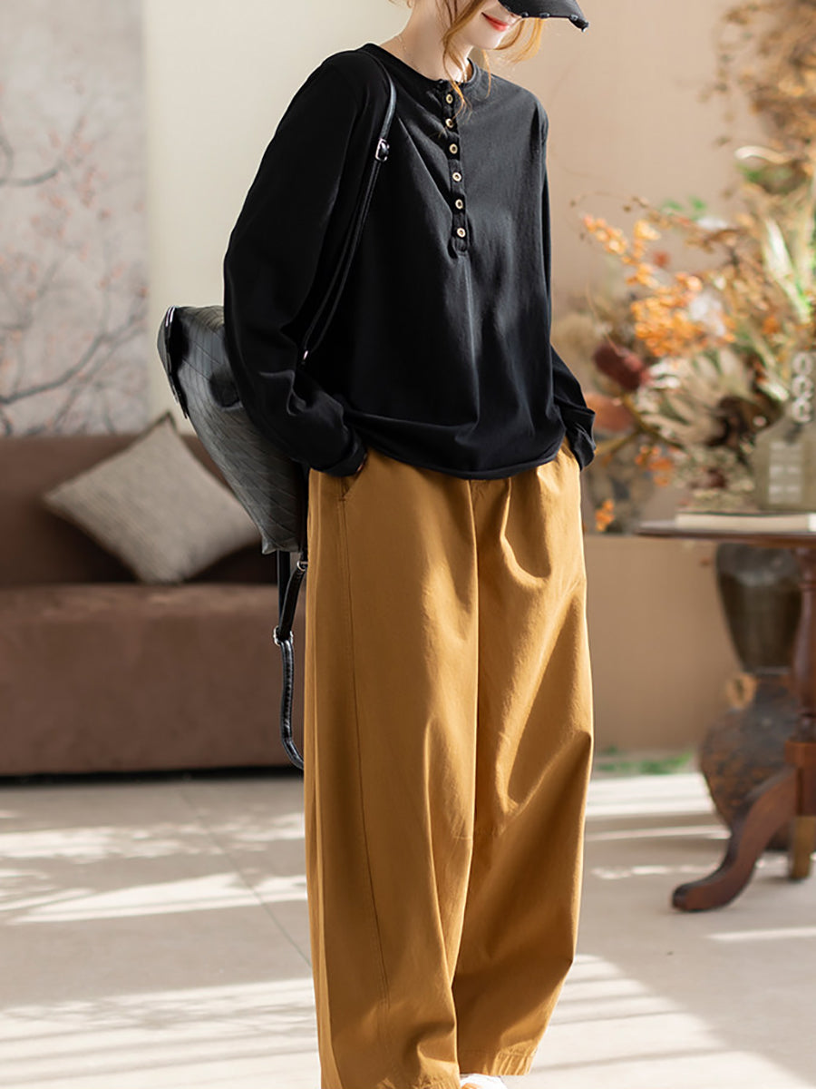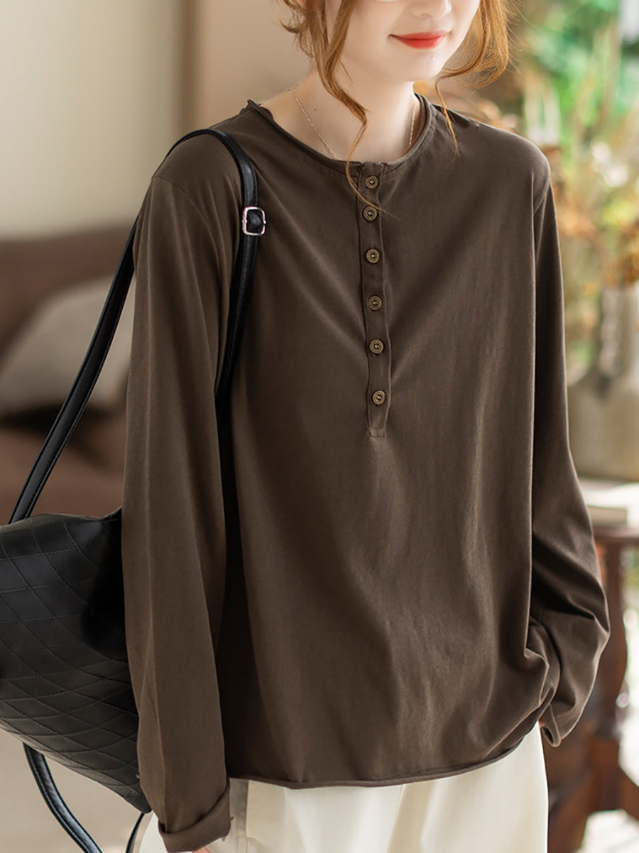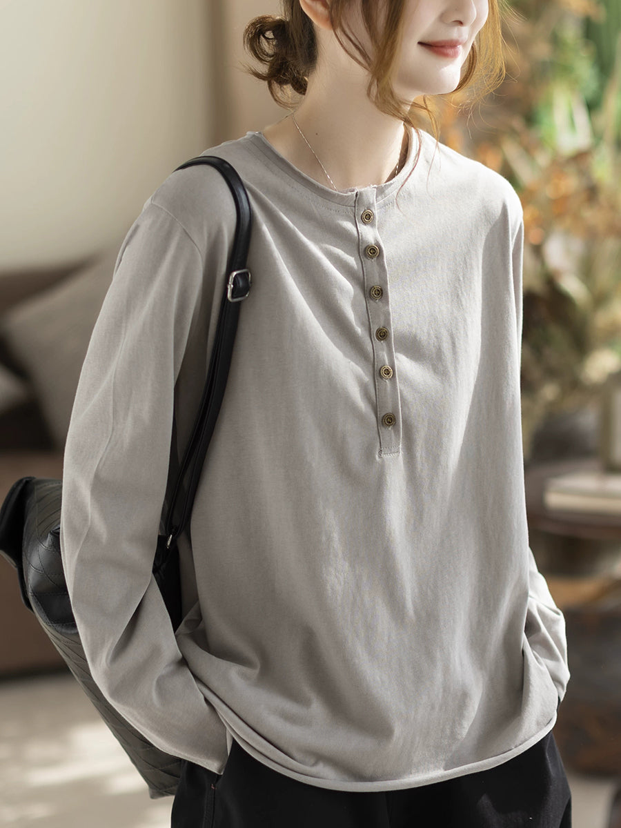 Women Spring Artsy Pure Color Cotton O-Neck Blouse