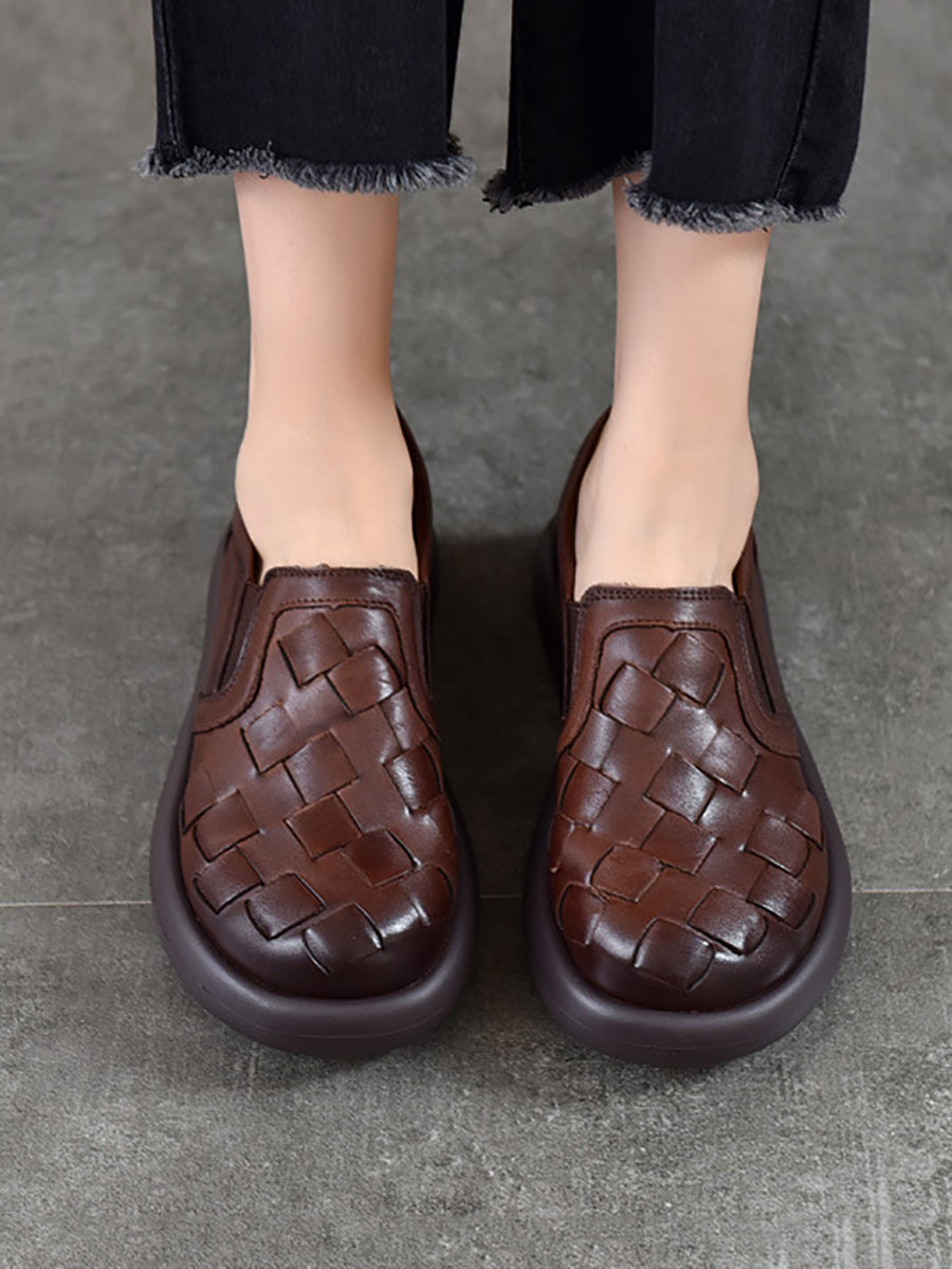 Women Spring Casual Genuine Leather Weave Flat Shoes