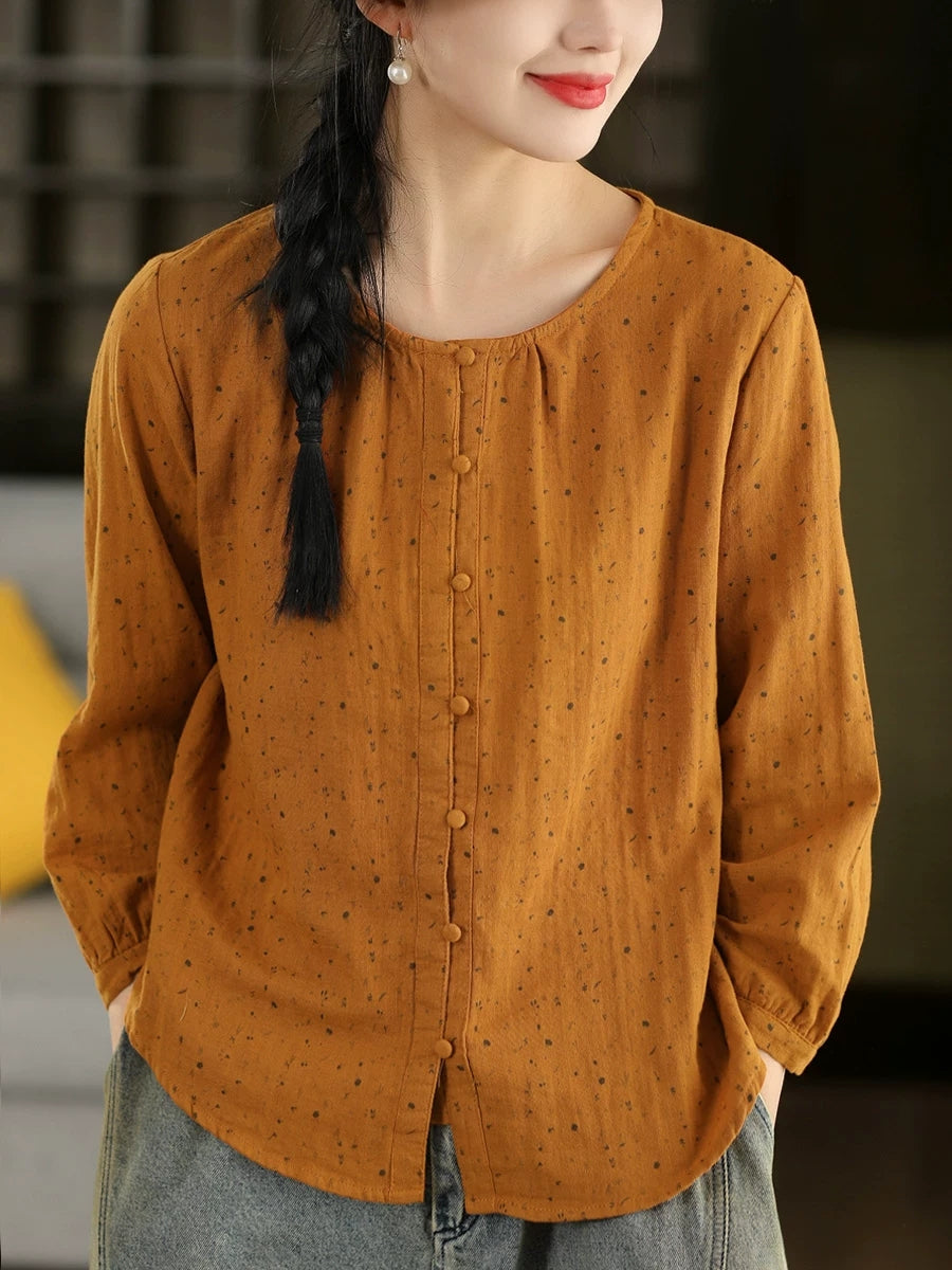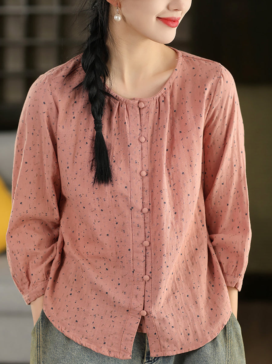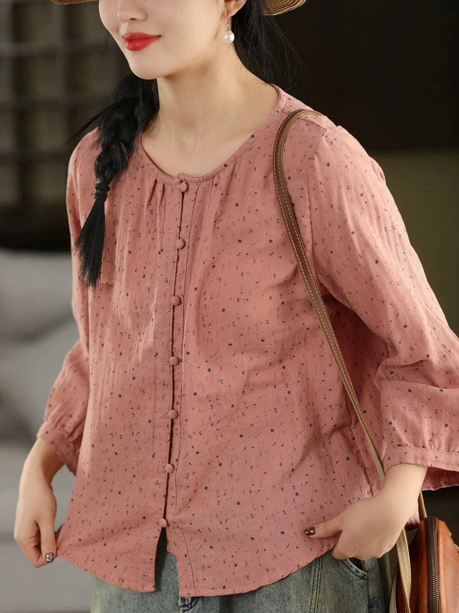 Women Spring Artsy Floral O-Neck 100%Cotton Blouse