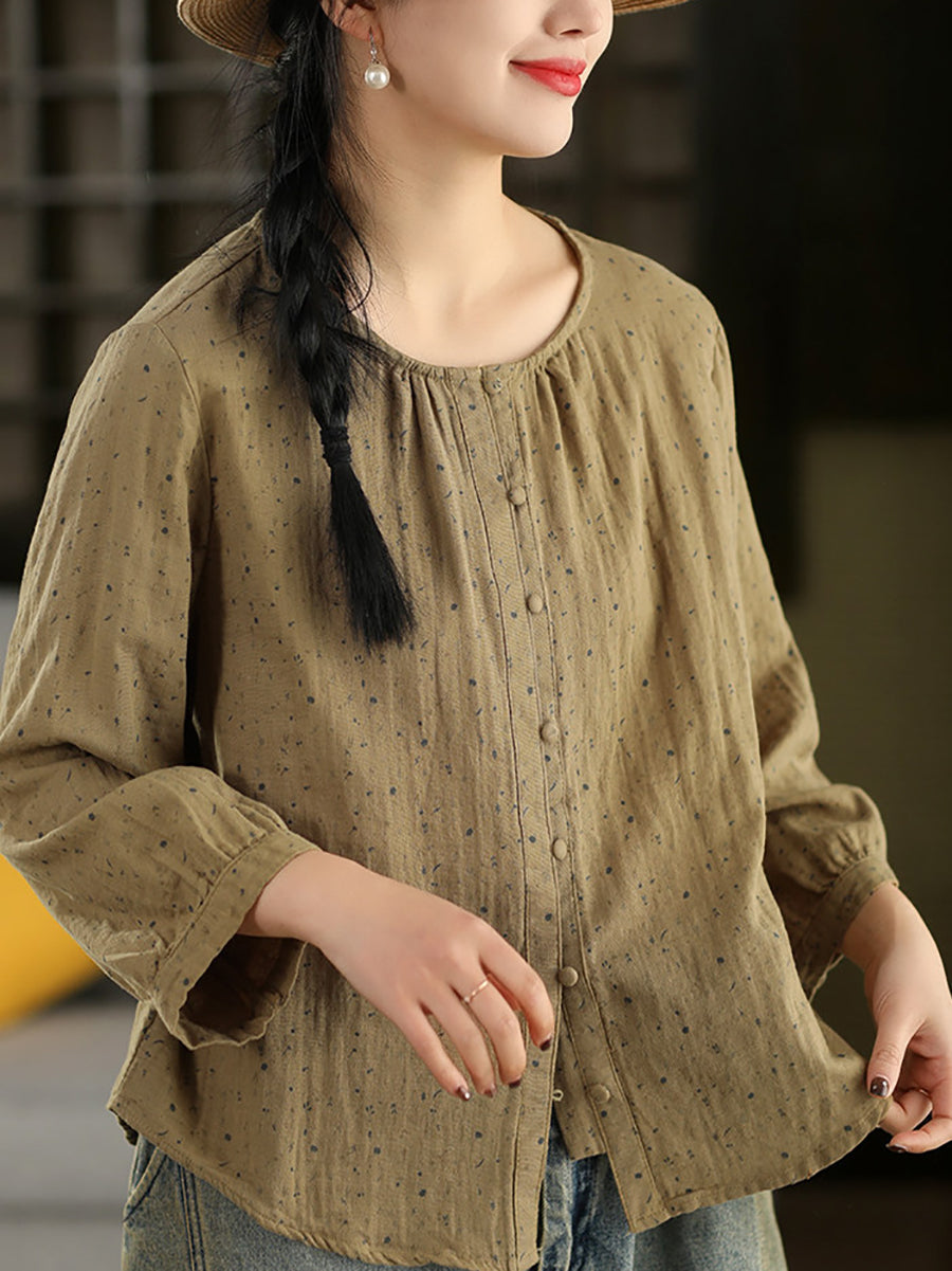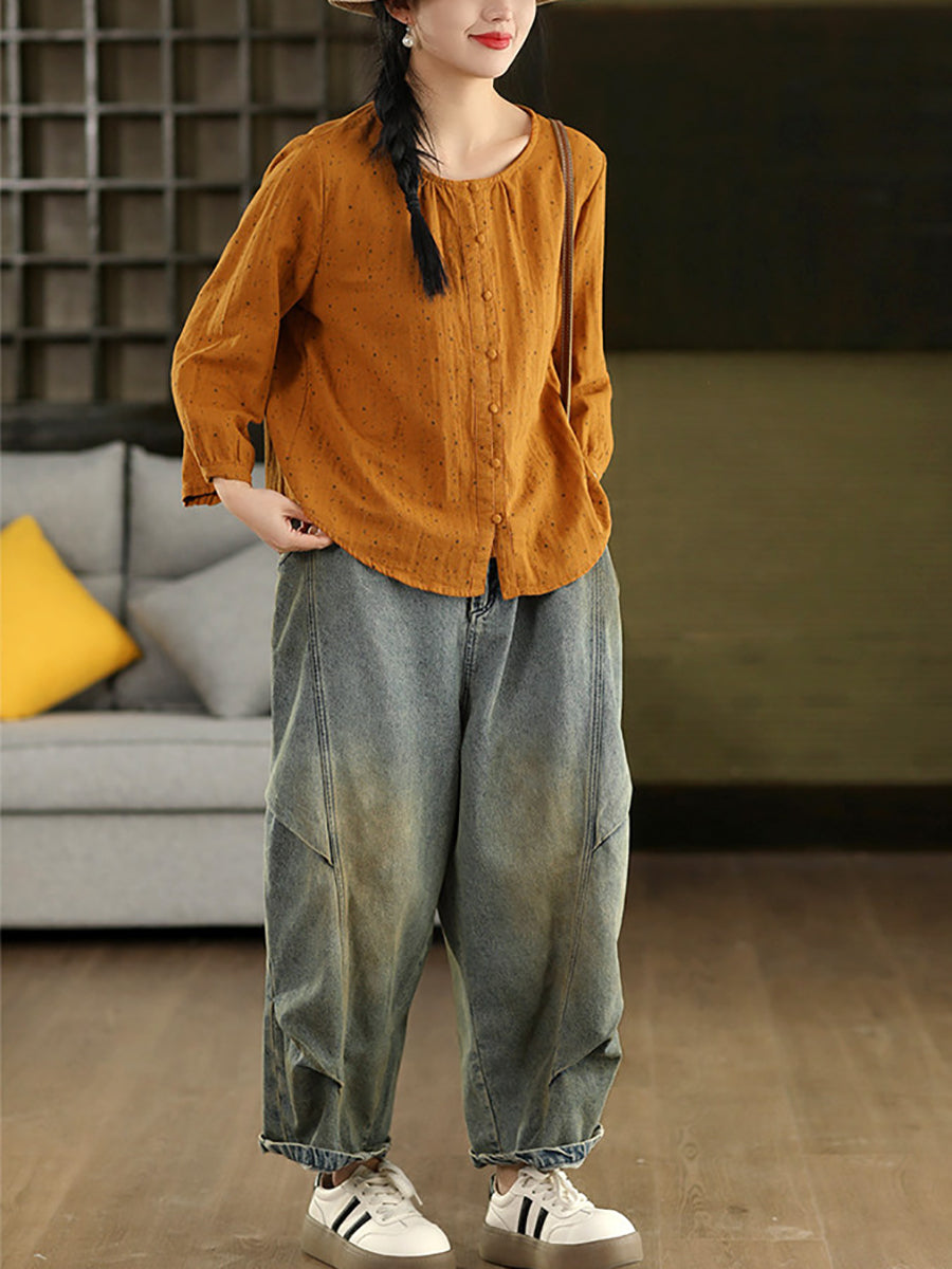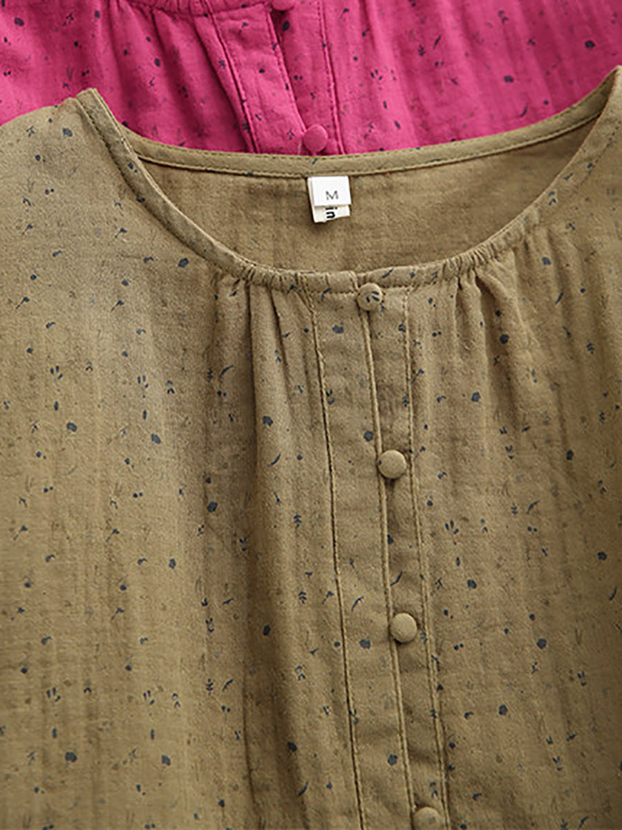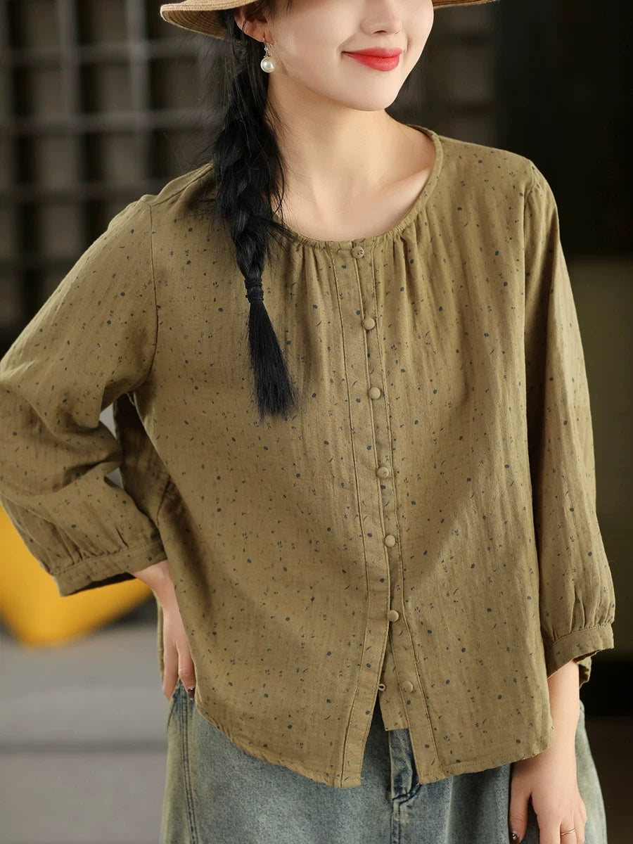 Women Spring Artsy Floral O-Neck 100%Cotton Blouse