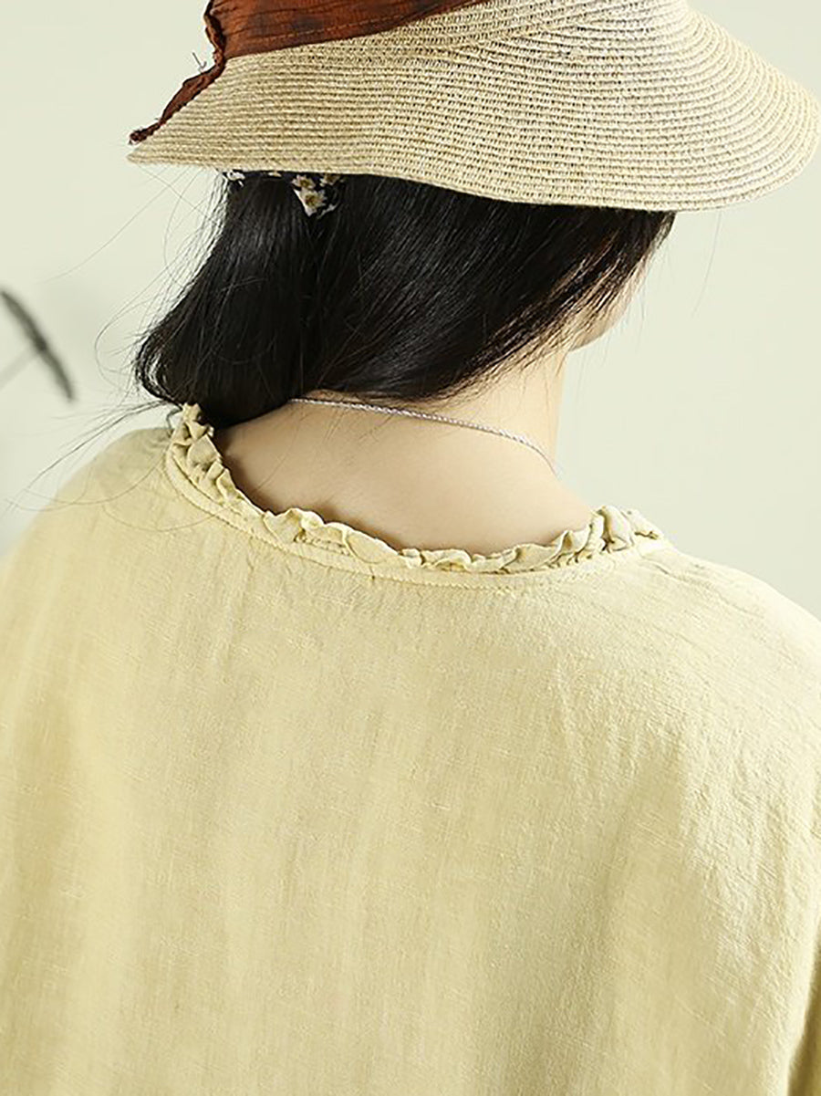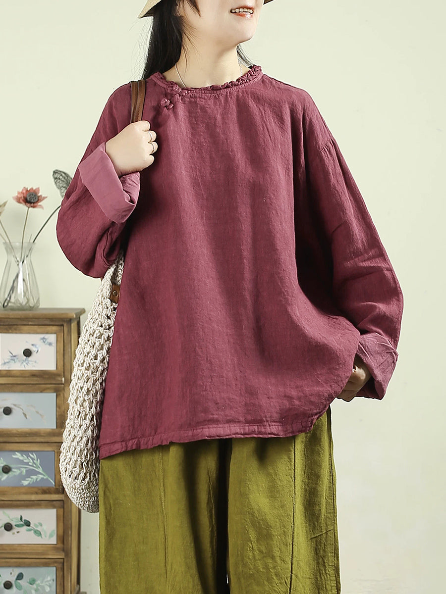 Women Spring Ethnic Pure Color O-Neck 100%Linen Blouse